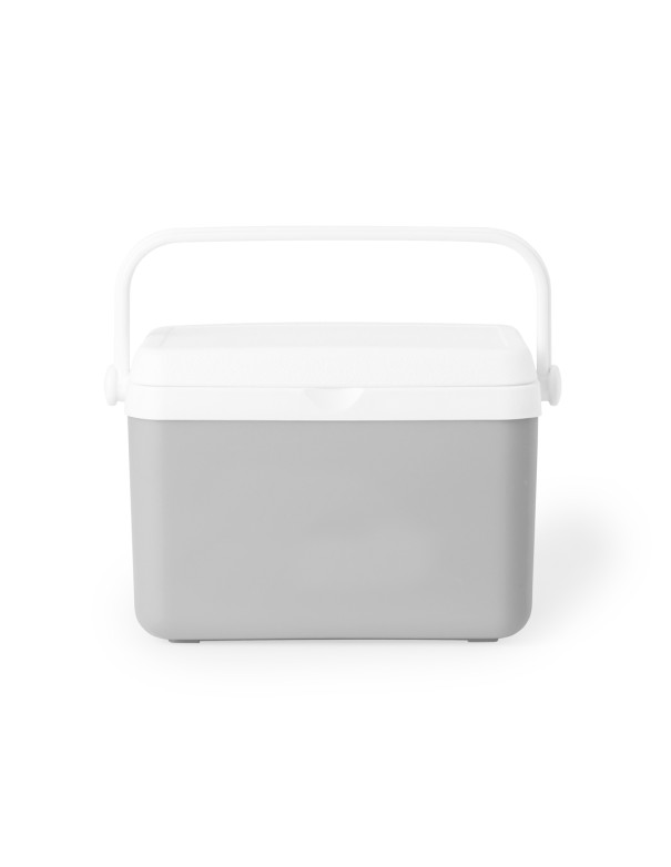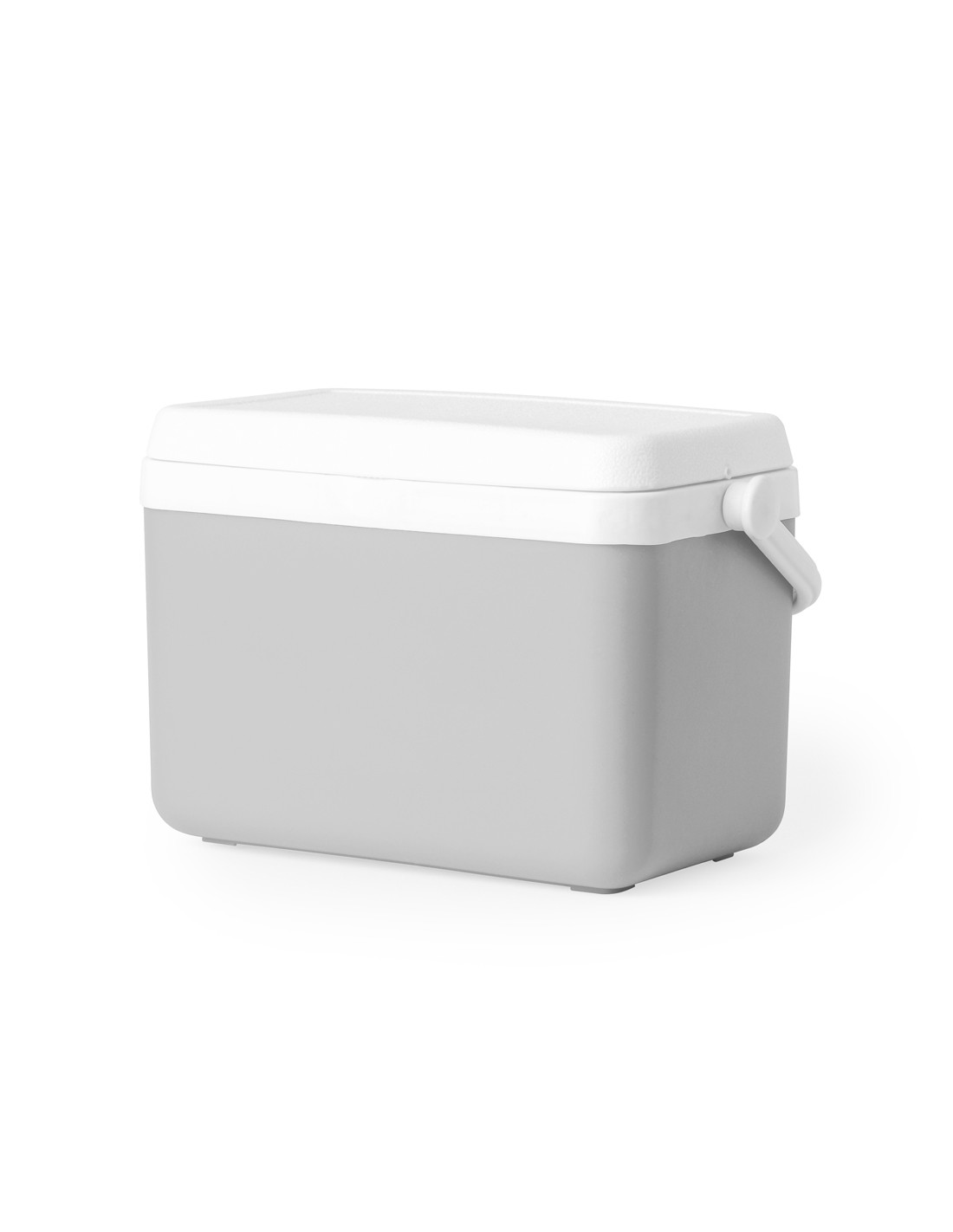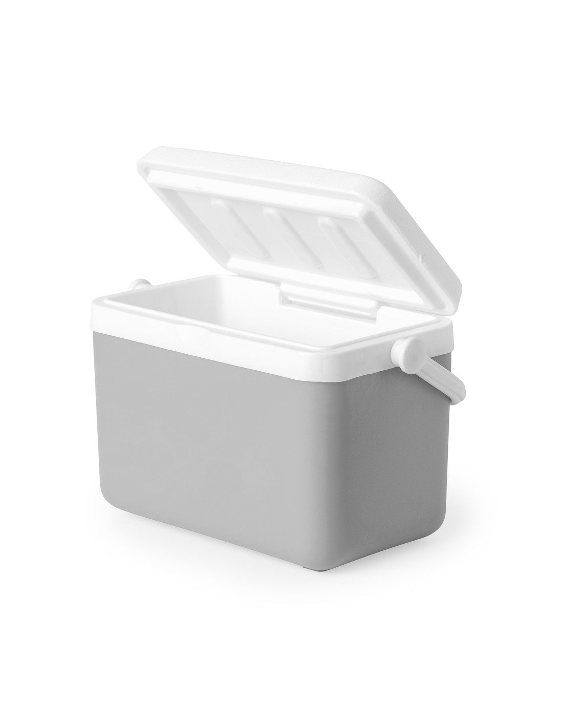 Nevera fabricada en PP de 4L. Atractivo diseño vintage para mantener bebidas y alimentos fríos, de diseño rígido con doble pared. Tapadera de bisagra con cierre de seguridad y asa rígida para un fácil transporte. Con base de color gris y accesorios en blanco. Presentada individualmente en bolsa reciclada.