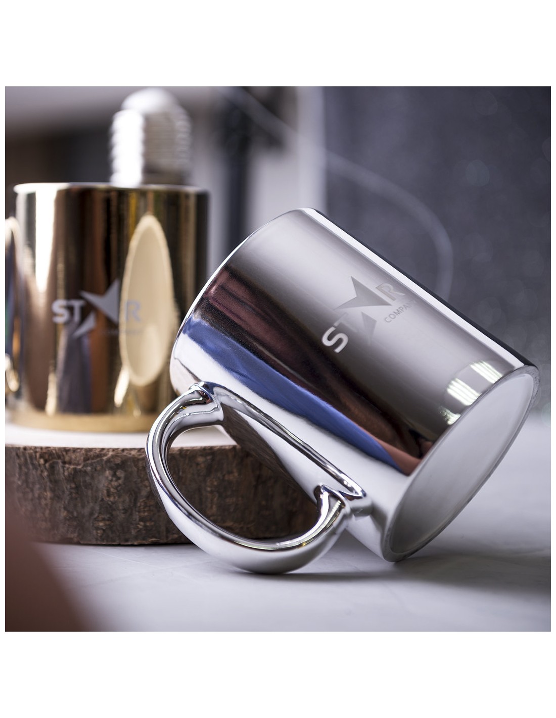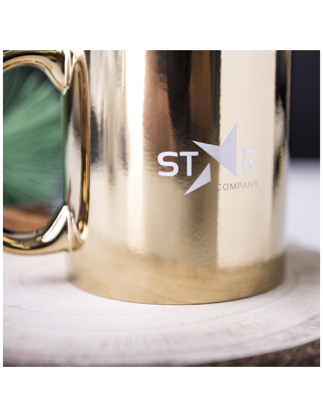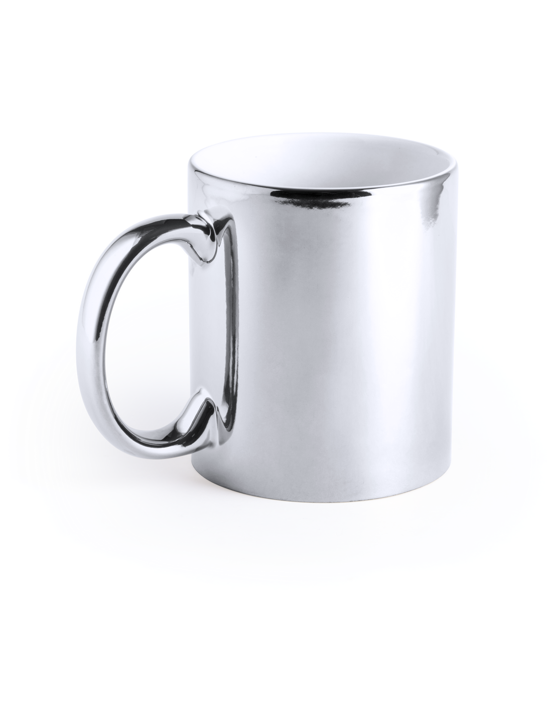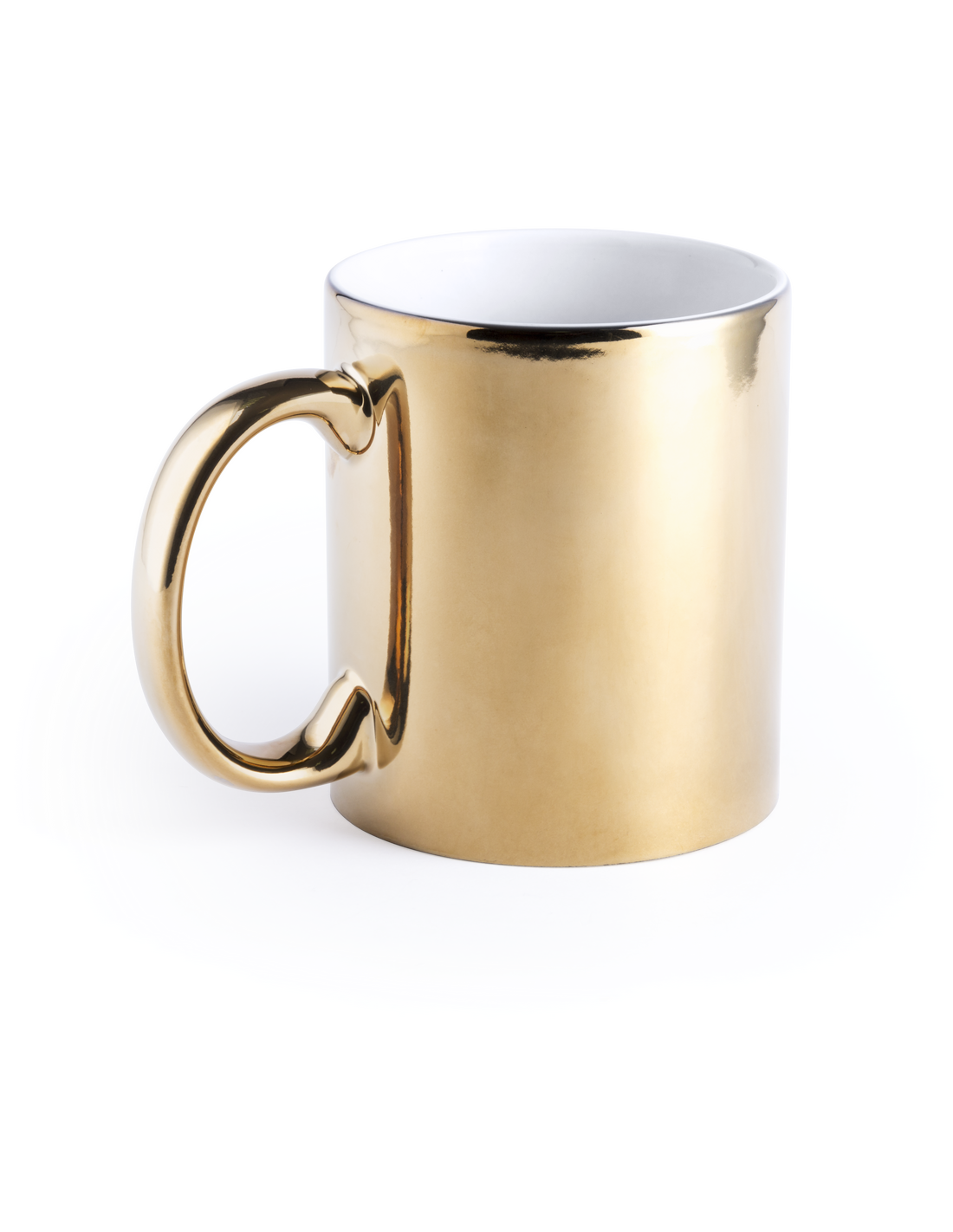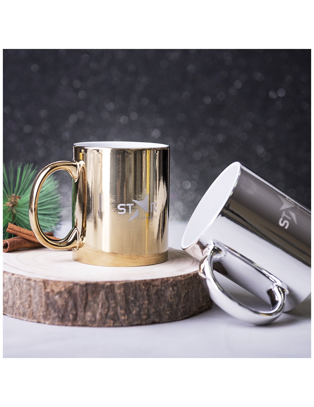 Taza de cerámica de 350ml de capacidad. Disponible en llamativos colores plateado y dorado brillantes. Especialmente diseñada para marcaje en láser, con un recubrimiento exterior metalizado especial para que tu publicidad quede perfectamente grabada en color blanco, a juego con el color interior de la taza. Presentada en caja individual. Se desaconseja su uso en el microondas debido al recubrimiento exterior metalizado.