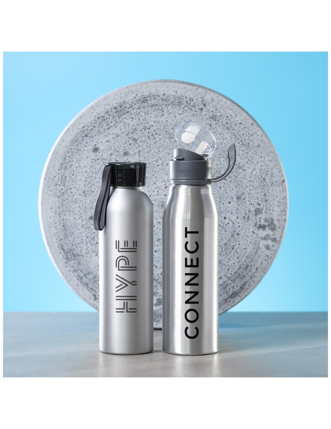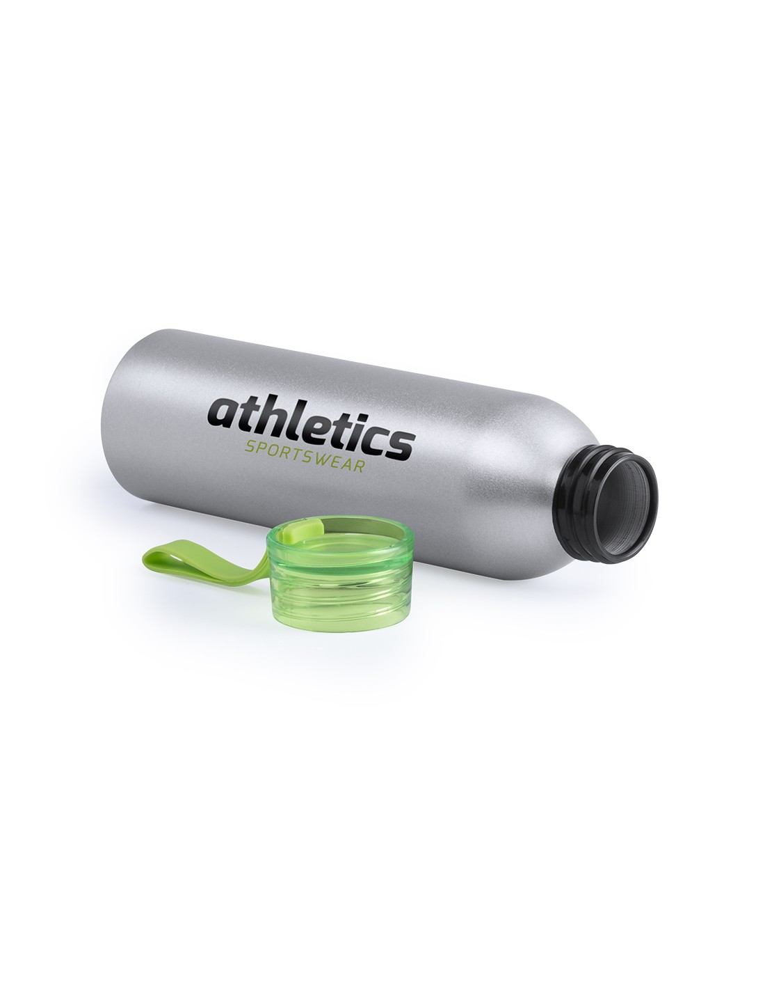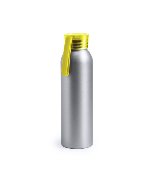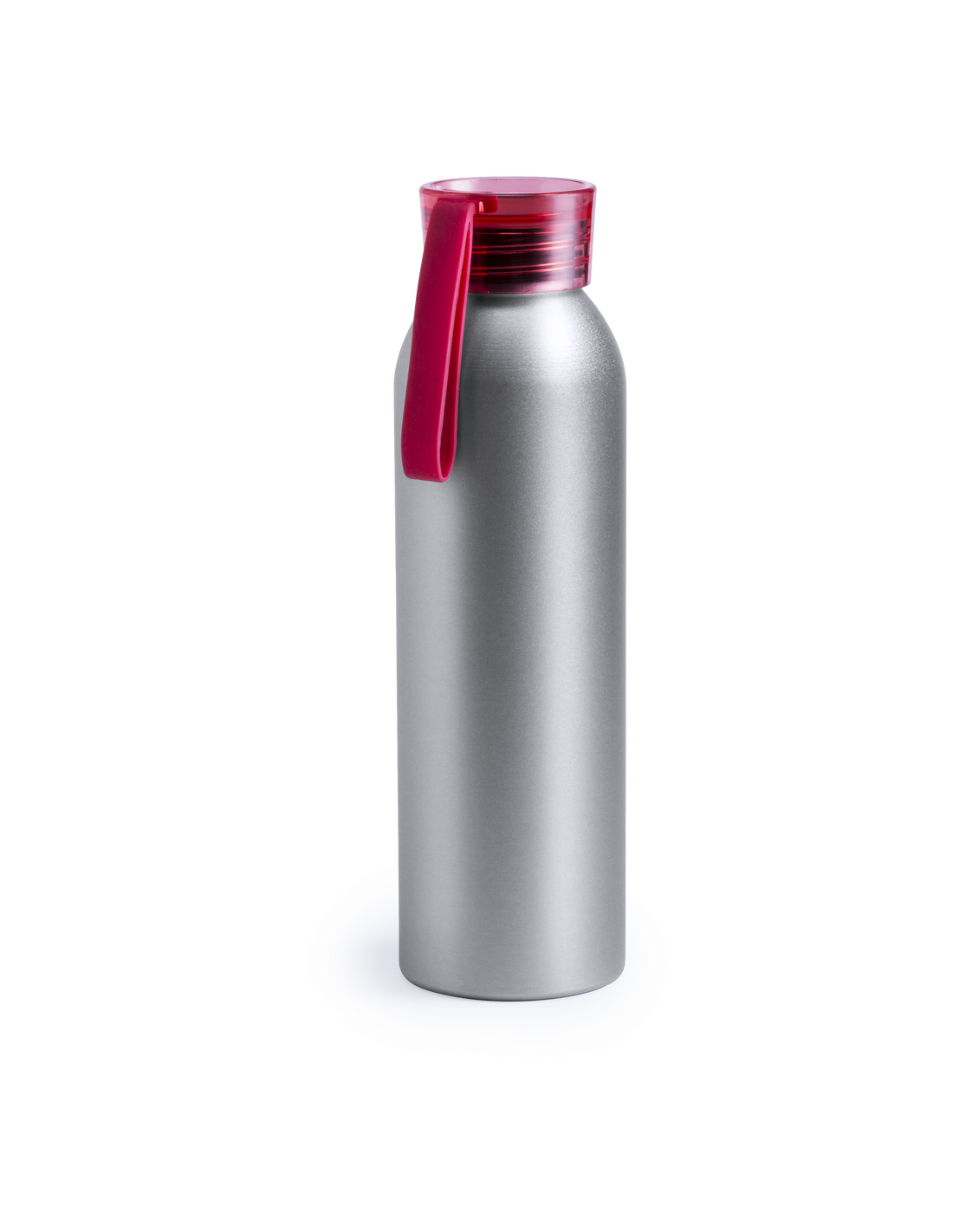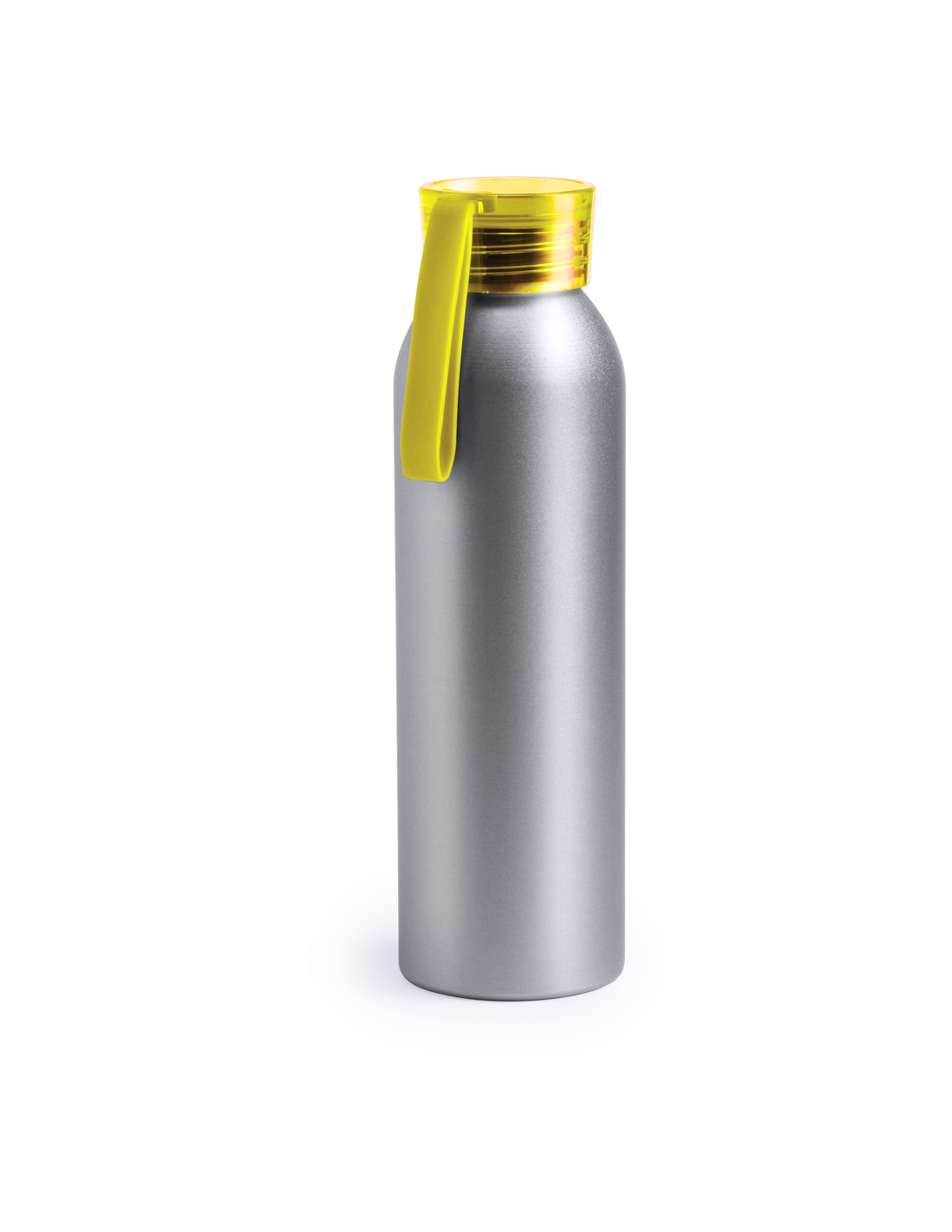 Bidón de aluminio de 650 ml de capacidad. Cuerpo en color plateado, con tapón de seguridad a rosca en variada gama de colores transparentes. Cinta de transporte en material TPR a juego.