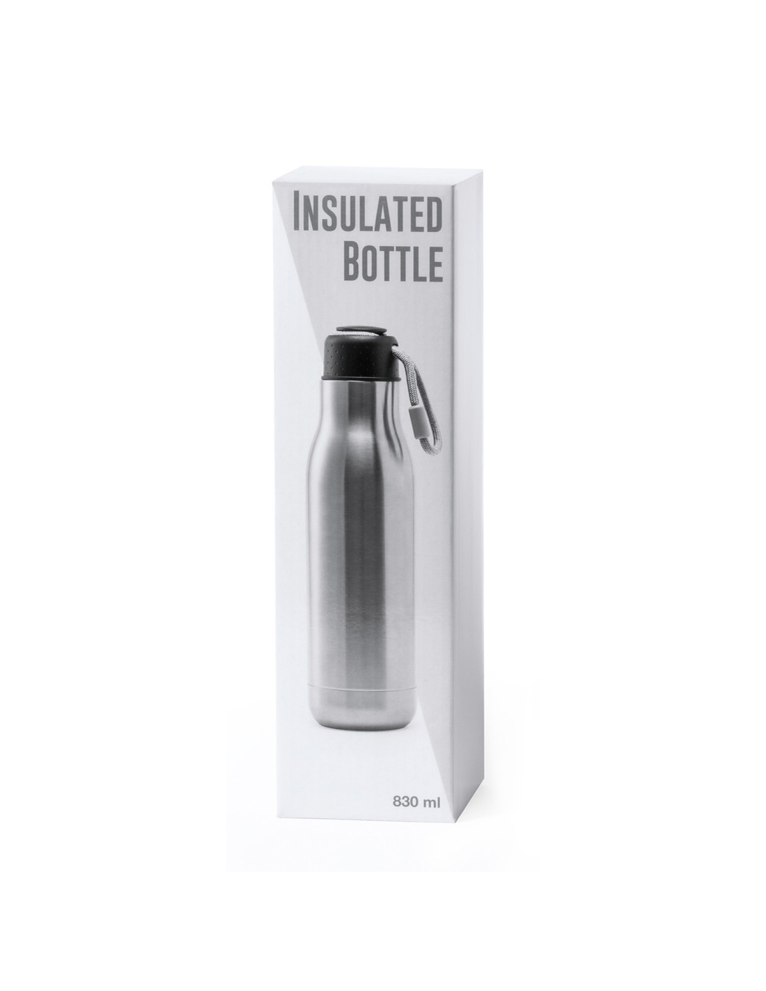 Bidón térmico de acero inox y doble pared de 830ml de capacidad y de acabado brillo. Tapón de seguridad libre de BPA y presentado en atractiva caja de diseño.