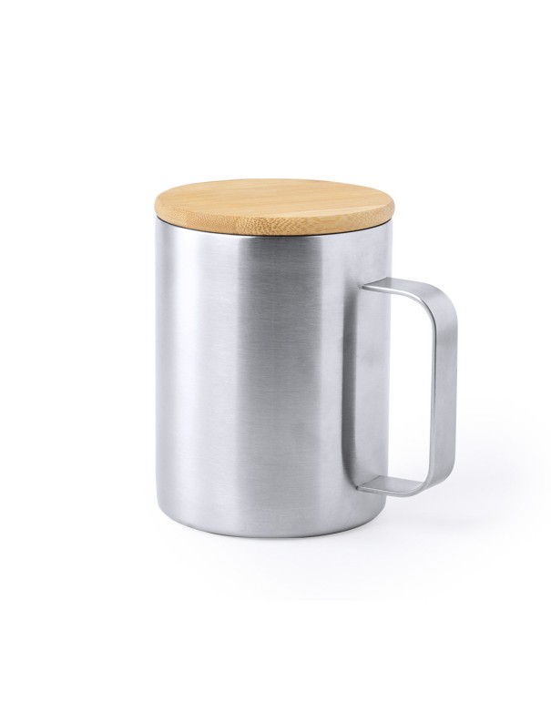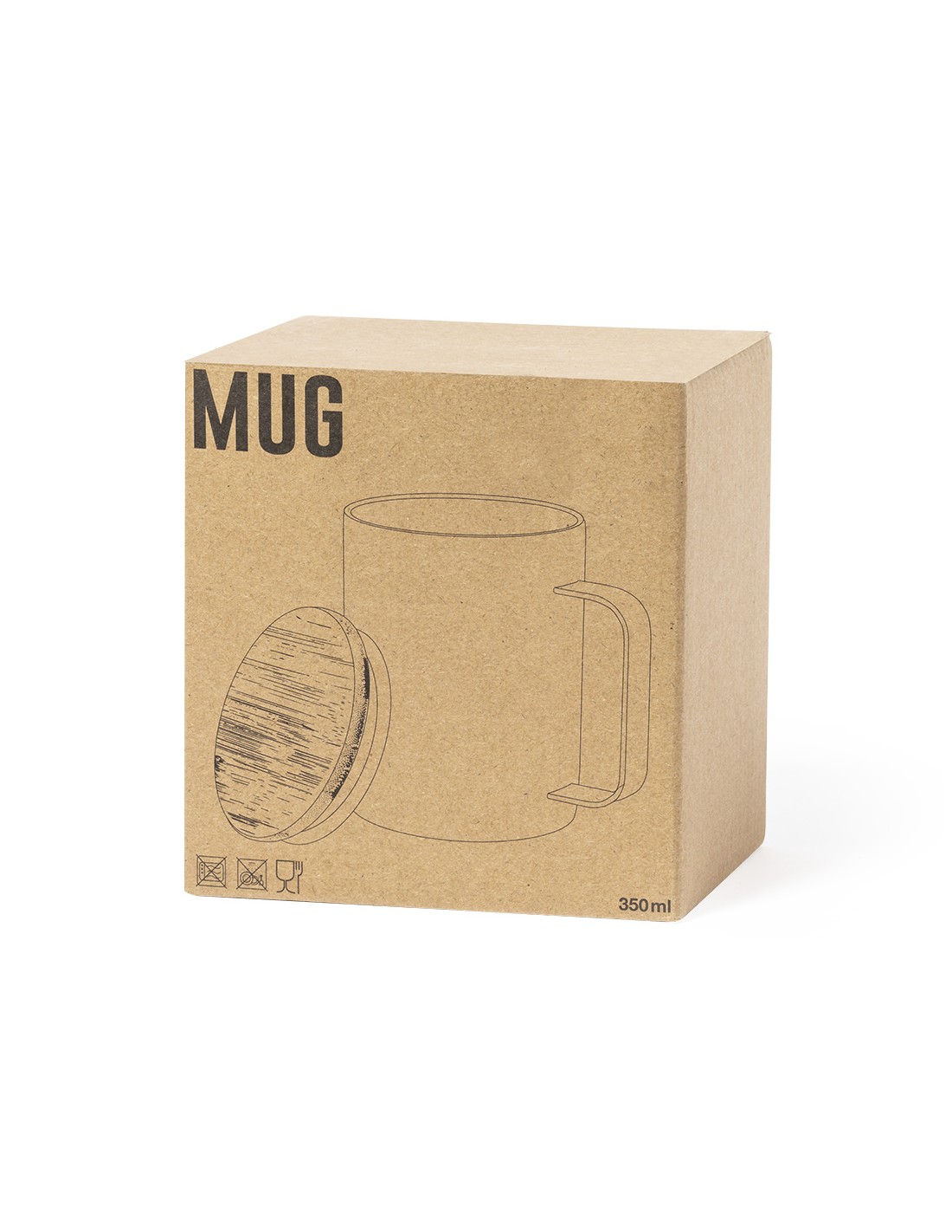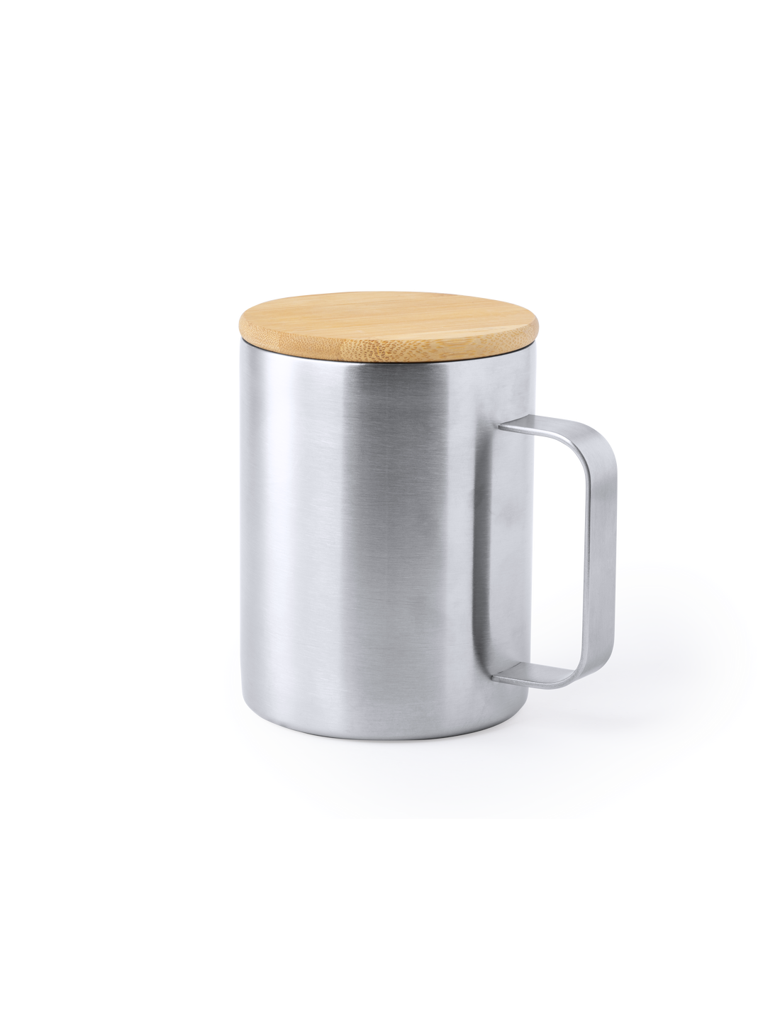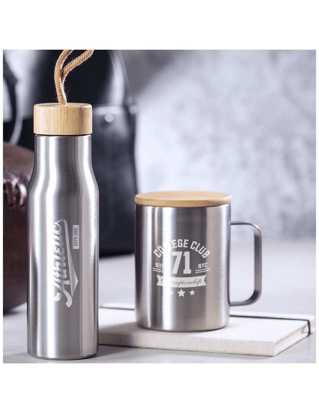 Taza de térmica de acero inox y 350ml de capacidad. Tapa fabricada en bambú y presentada en atractiva caja de diseño eco.