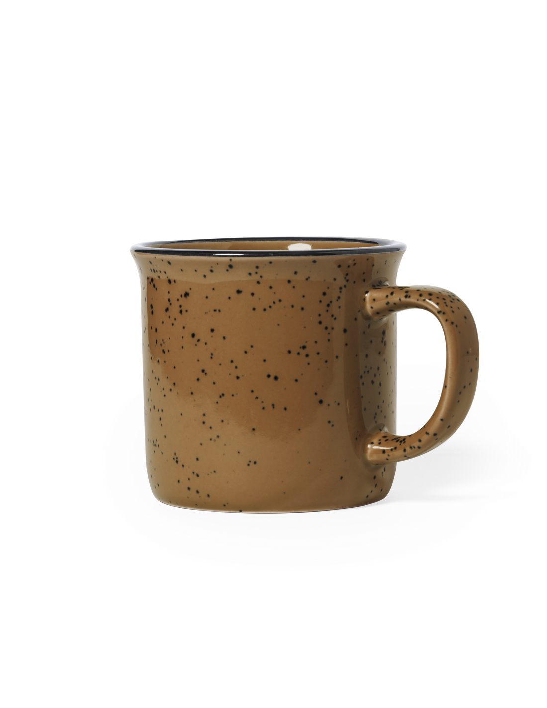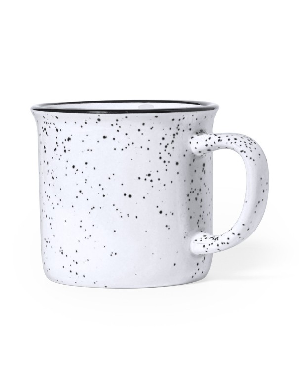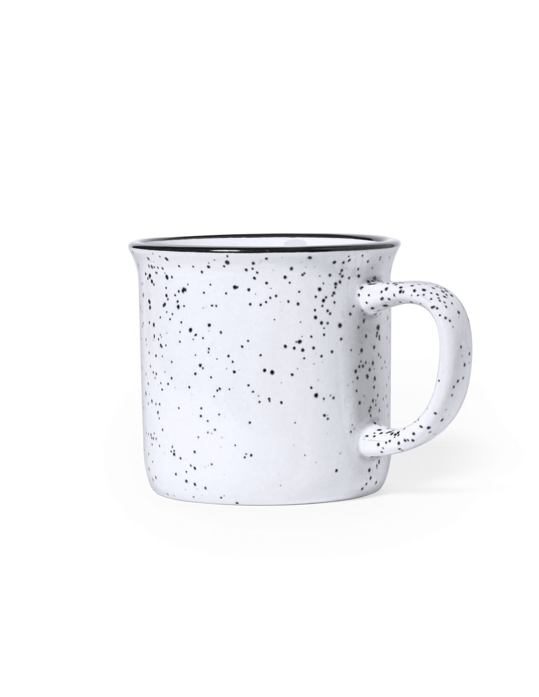 Taza de cerámica de 350ml de capacidad con diseño vintage. En combinación de exterior en colores moteados e interior a juego, con borde negro. Presentada en caja individual acabado kraft.