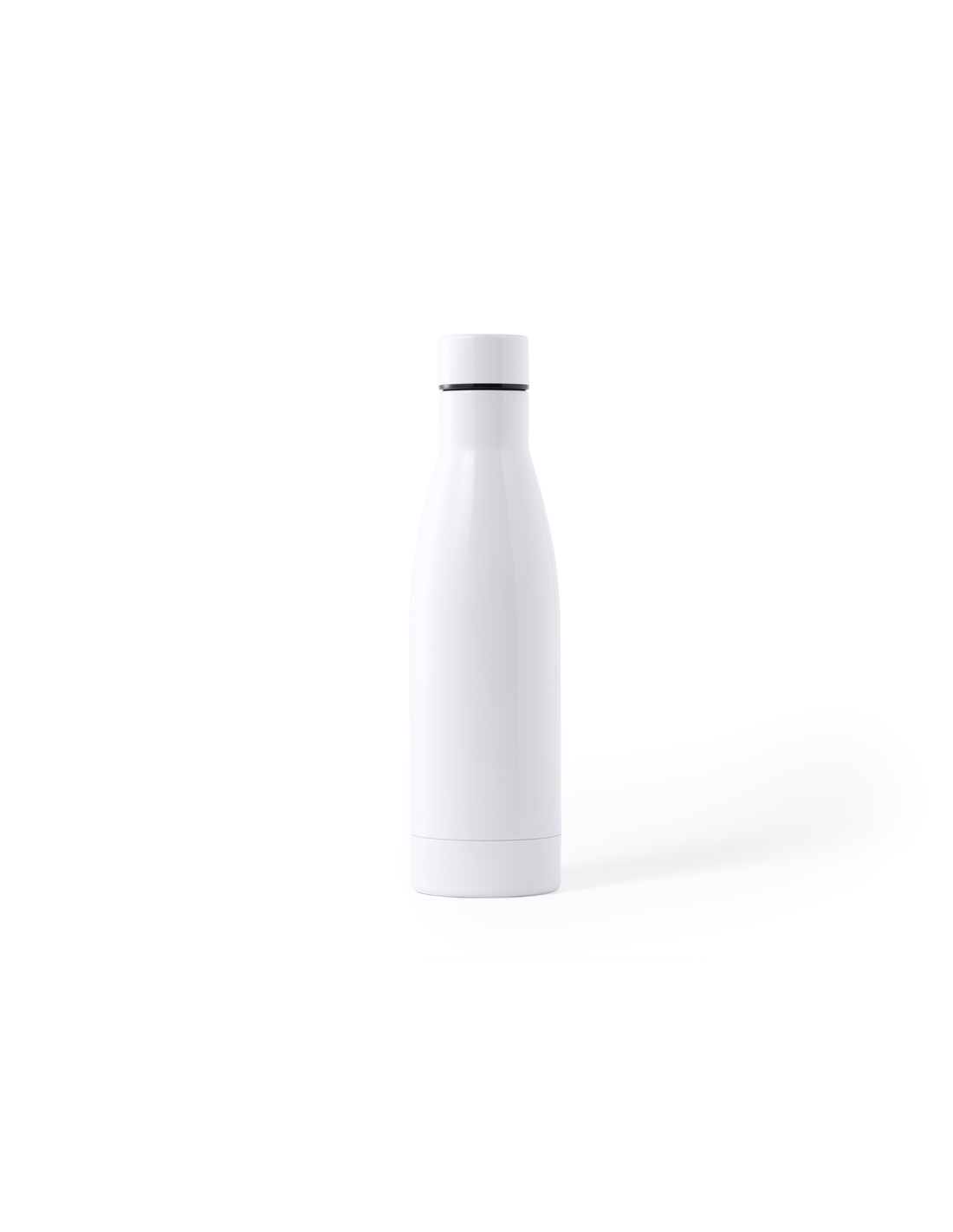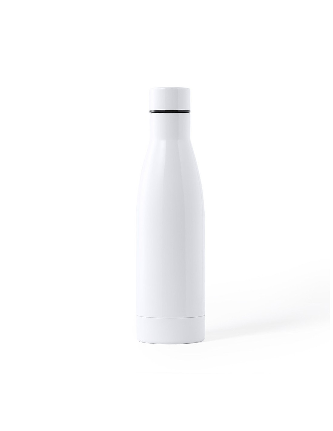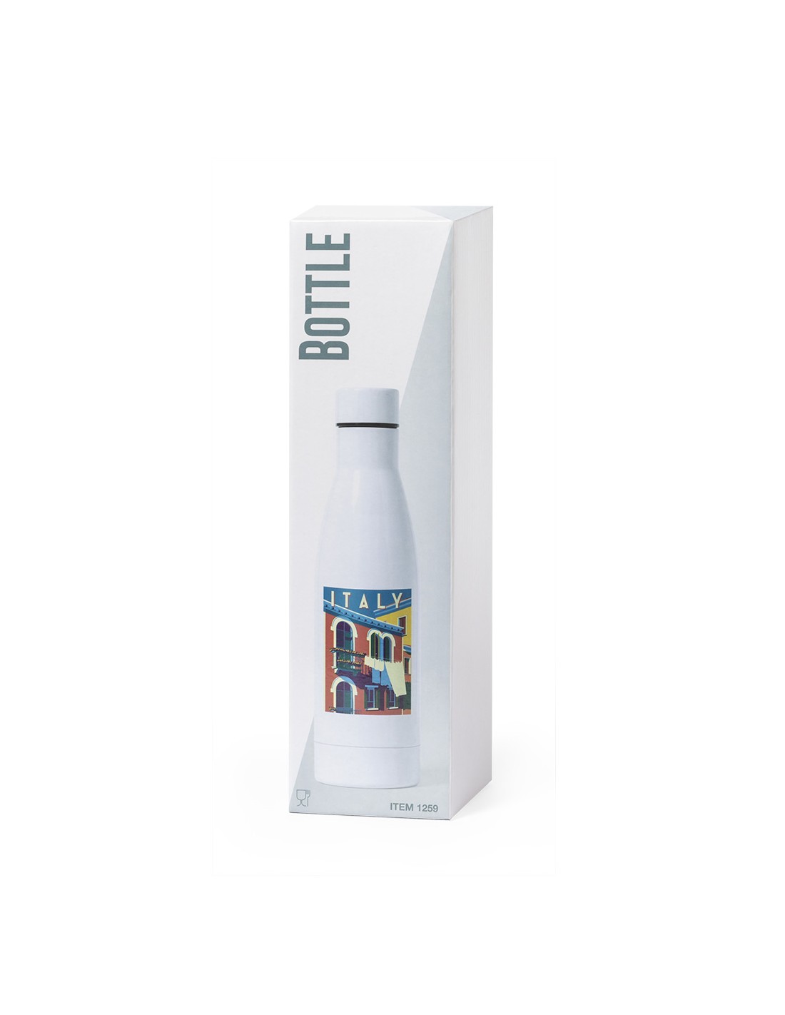 Bidón de acero inox de 700ml de capacidad. Acabado en suave y brillante color blanco, especialmente diseñado para marcaje en sublimación. Con tapón de seguridad en acero inox, libre de BPA. Presentado en atractiva caja de diseño.
