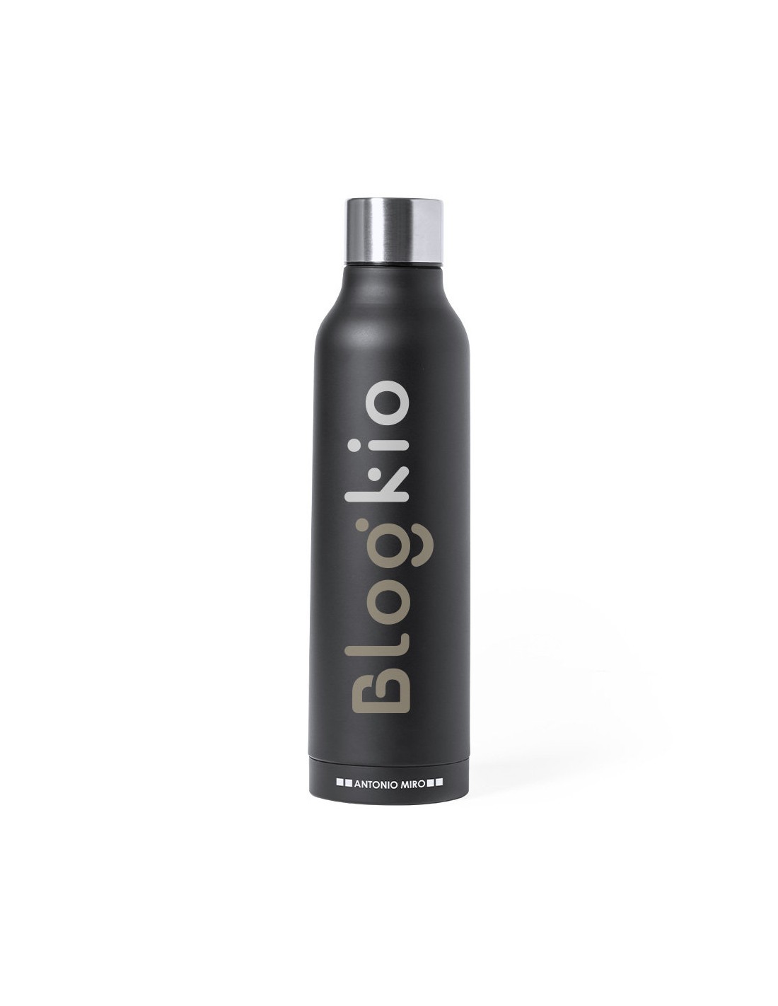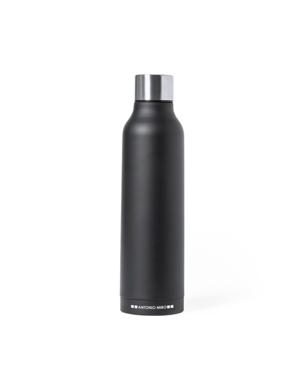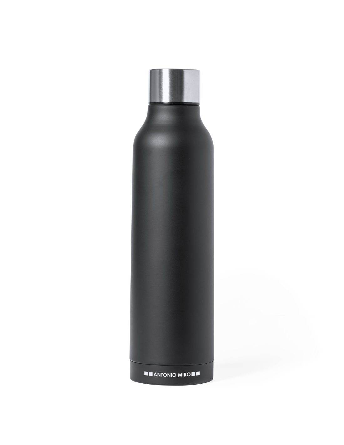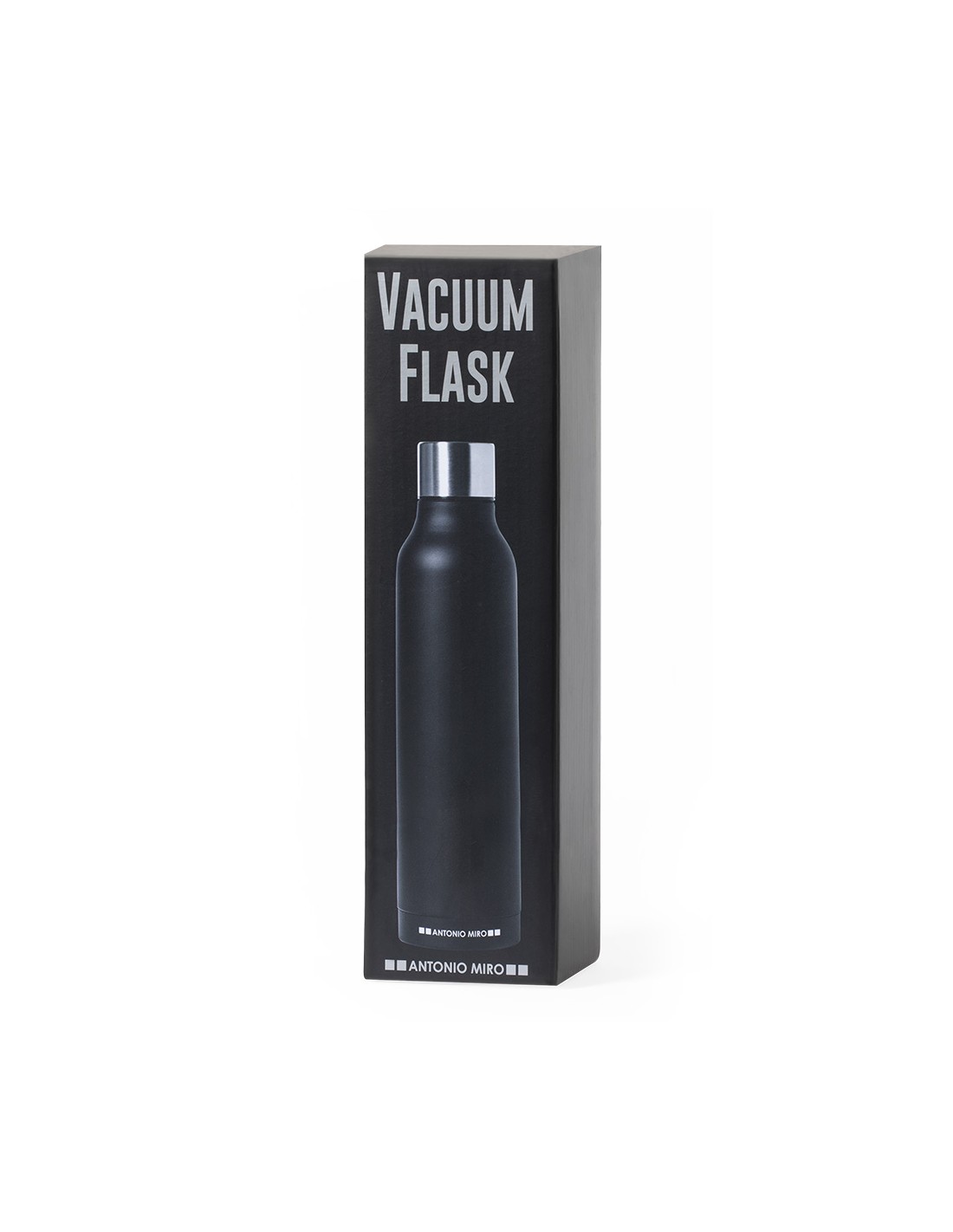 Termo en acero inox de Antonio Miró. De 500ml de capacidad y con doble pared para mejor y más duradera conservación de la temperatura. De sobrio acabado en negro satinado, logotipo de la marca en la base y con tapón cromado a rosca. Presentado en atractiva caja de diseño con logotipo de la marca.