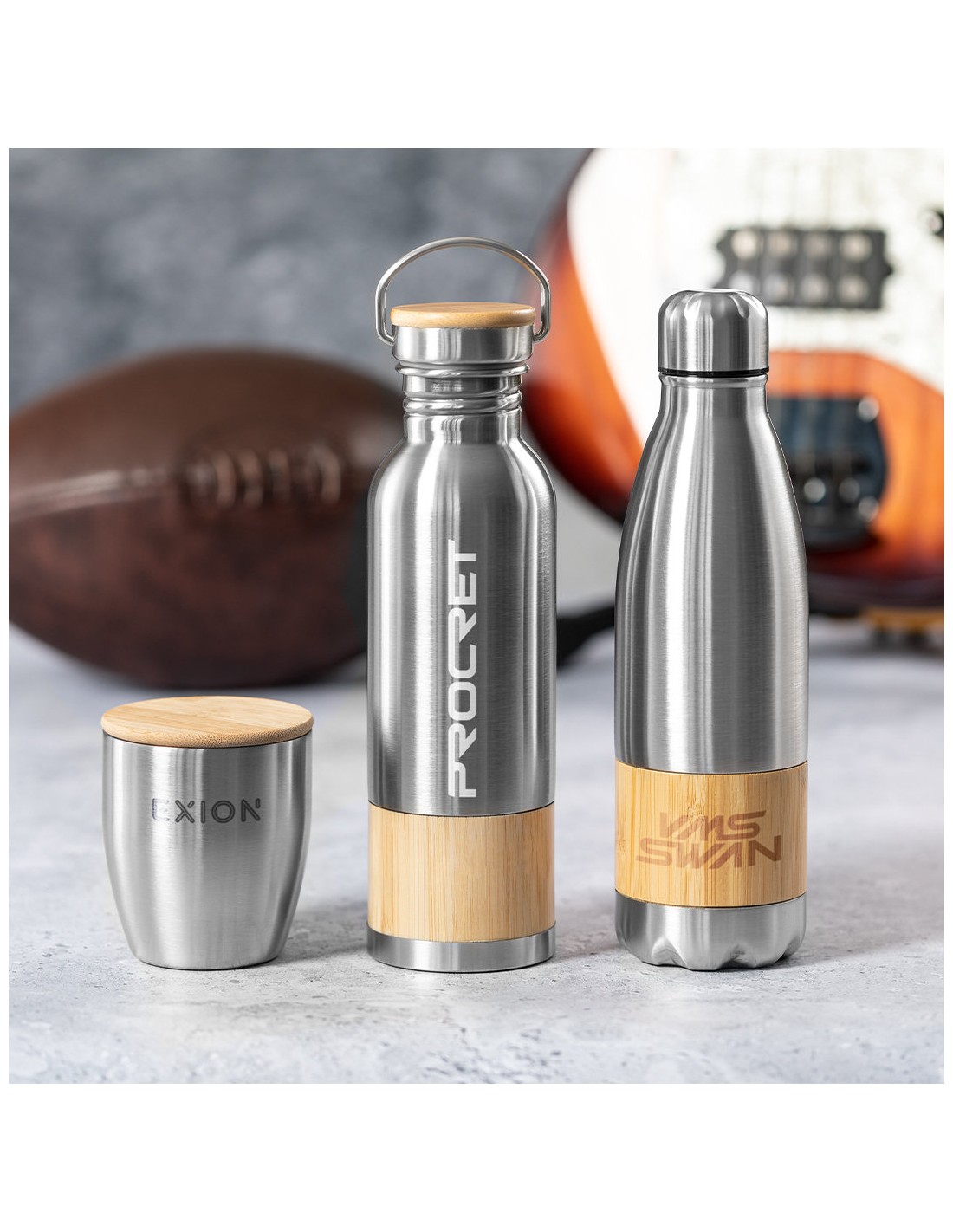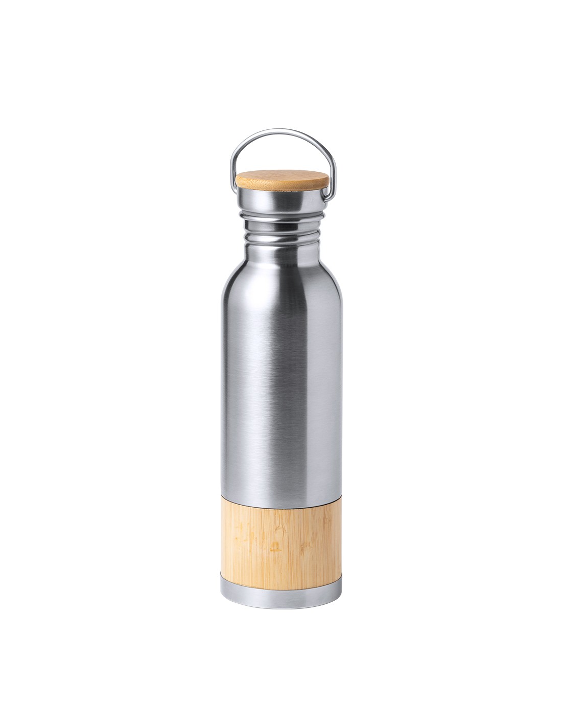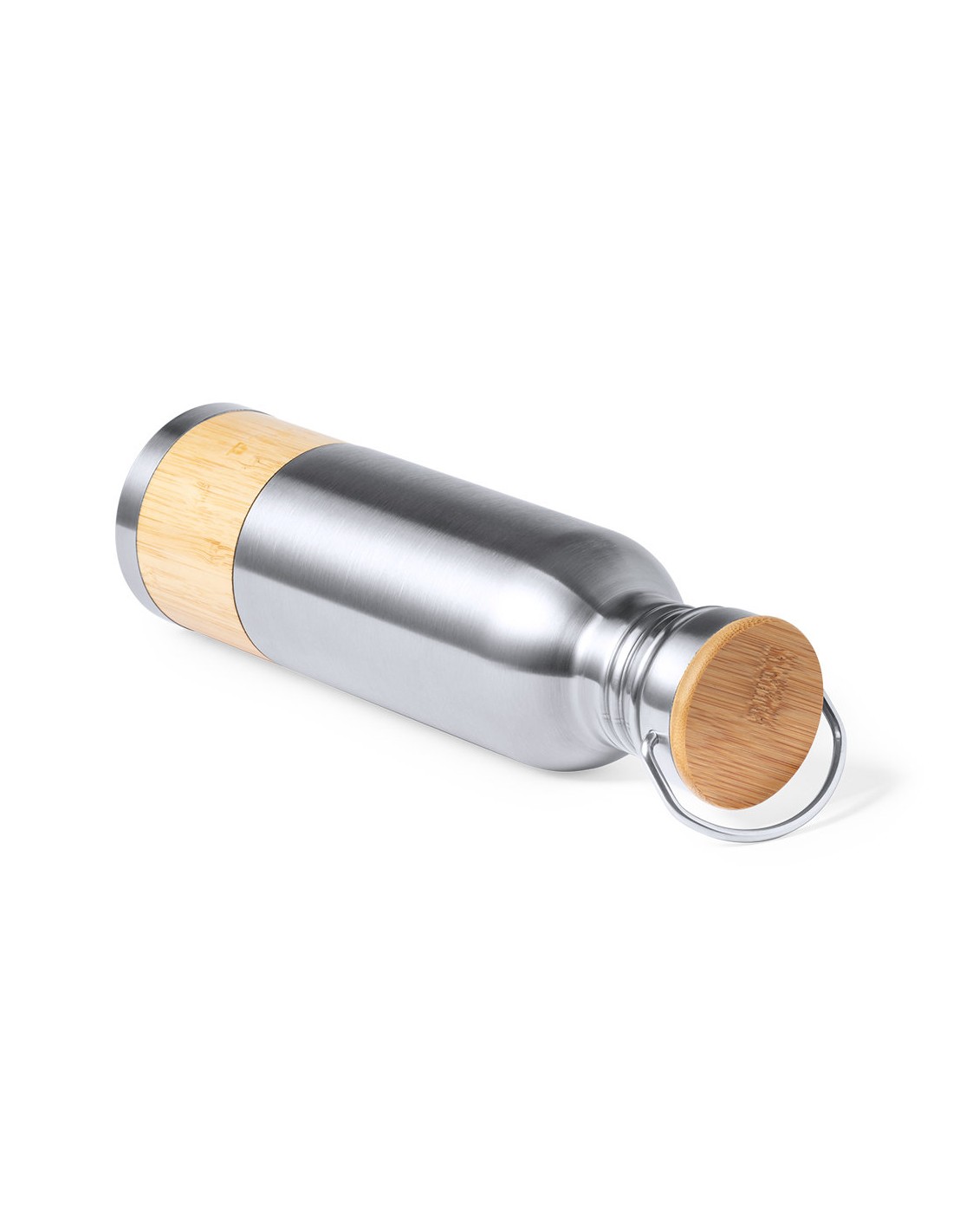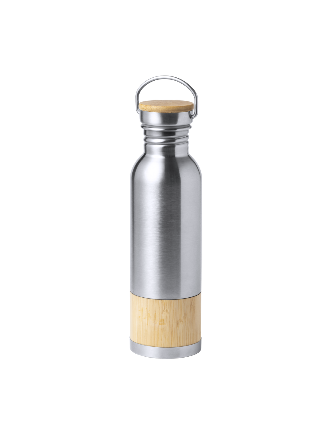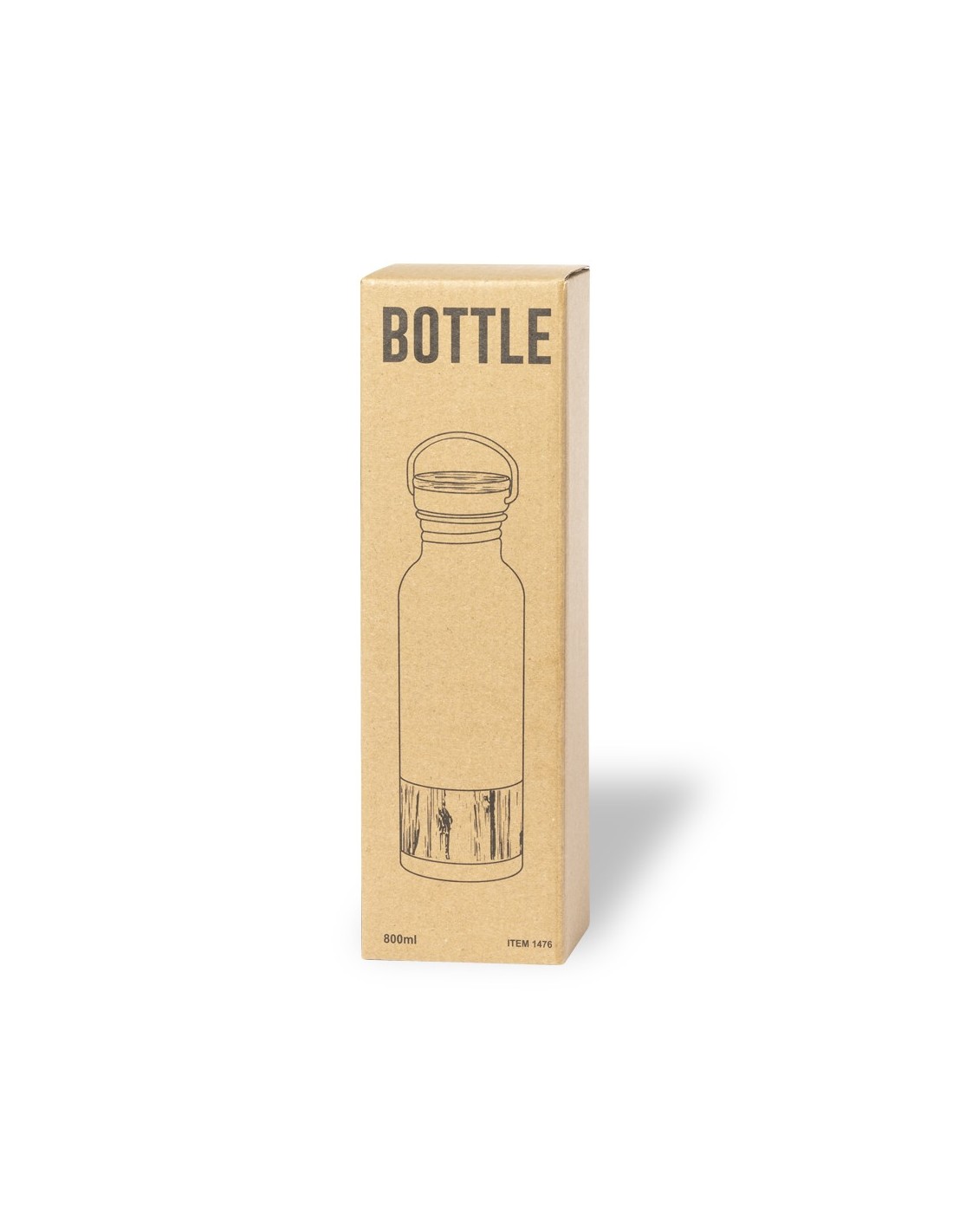 Bidón de original estilo retro y 800 ml de capacidad. Cuerpo en acero inox con franja de bambú, con tapón de seguridad a rosca en acero inox y detalle en bambú. Presentado en caja individual de diseño eco en cartón kraft.