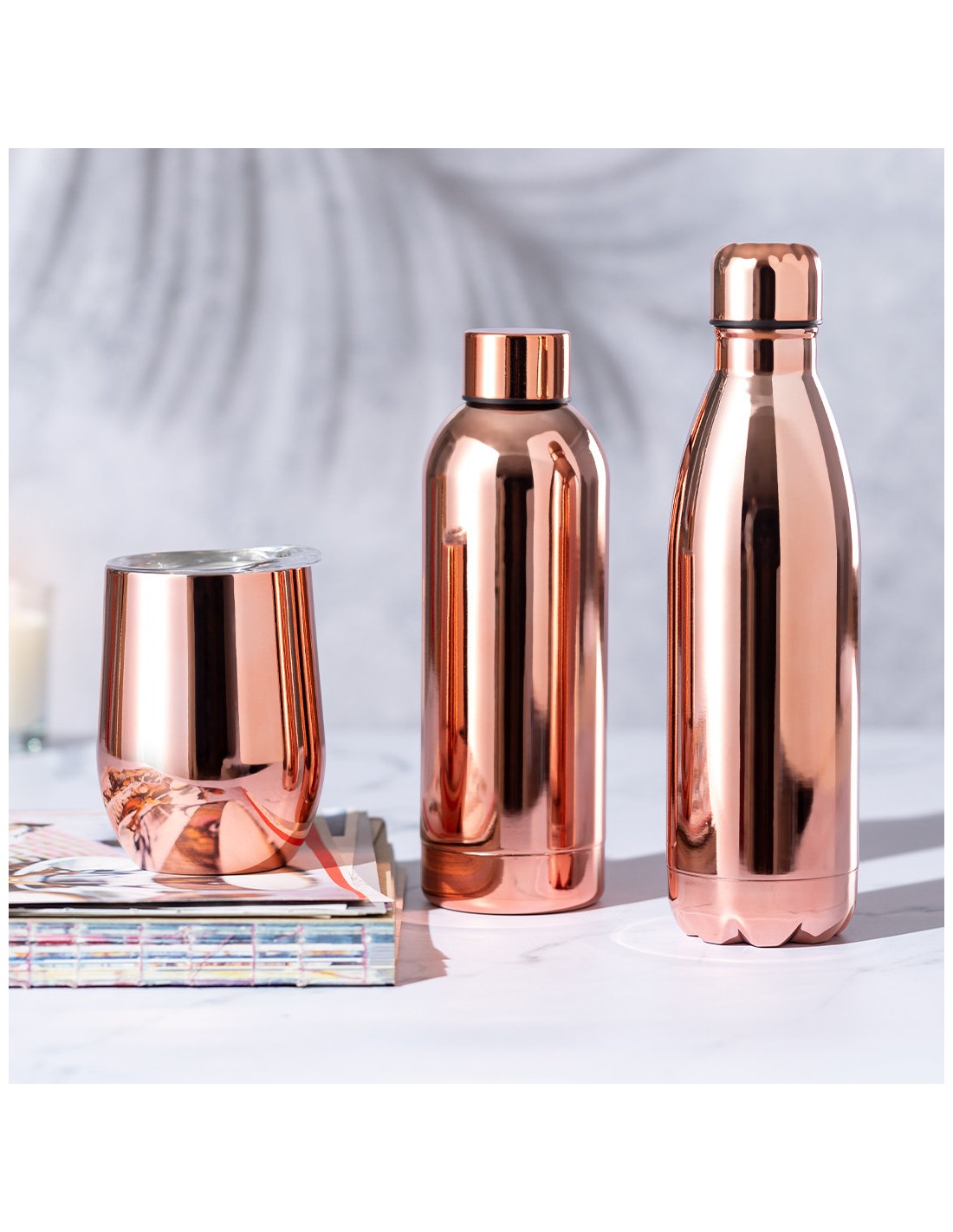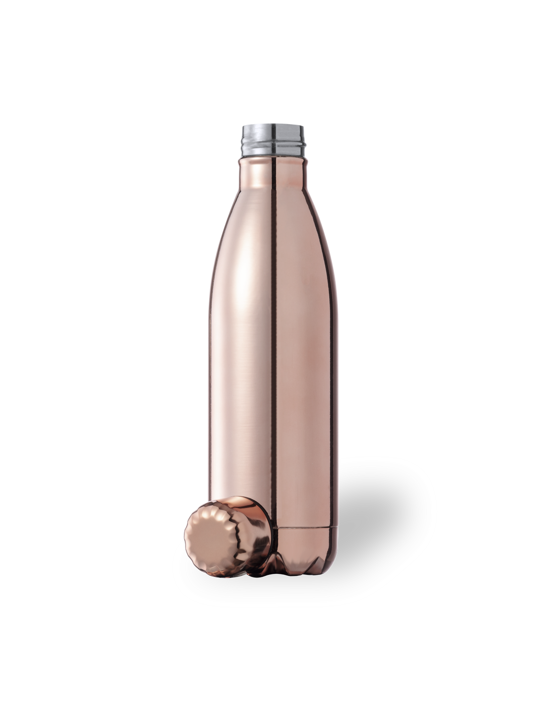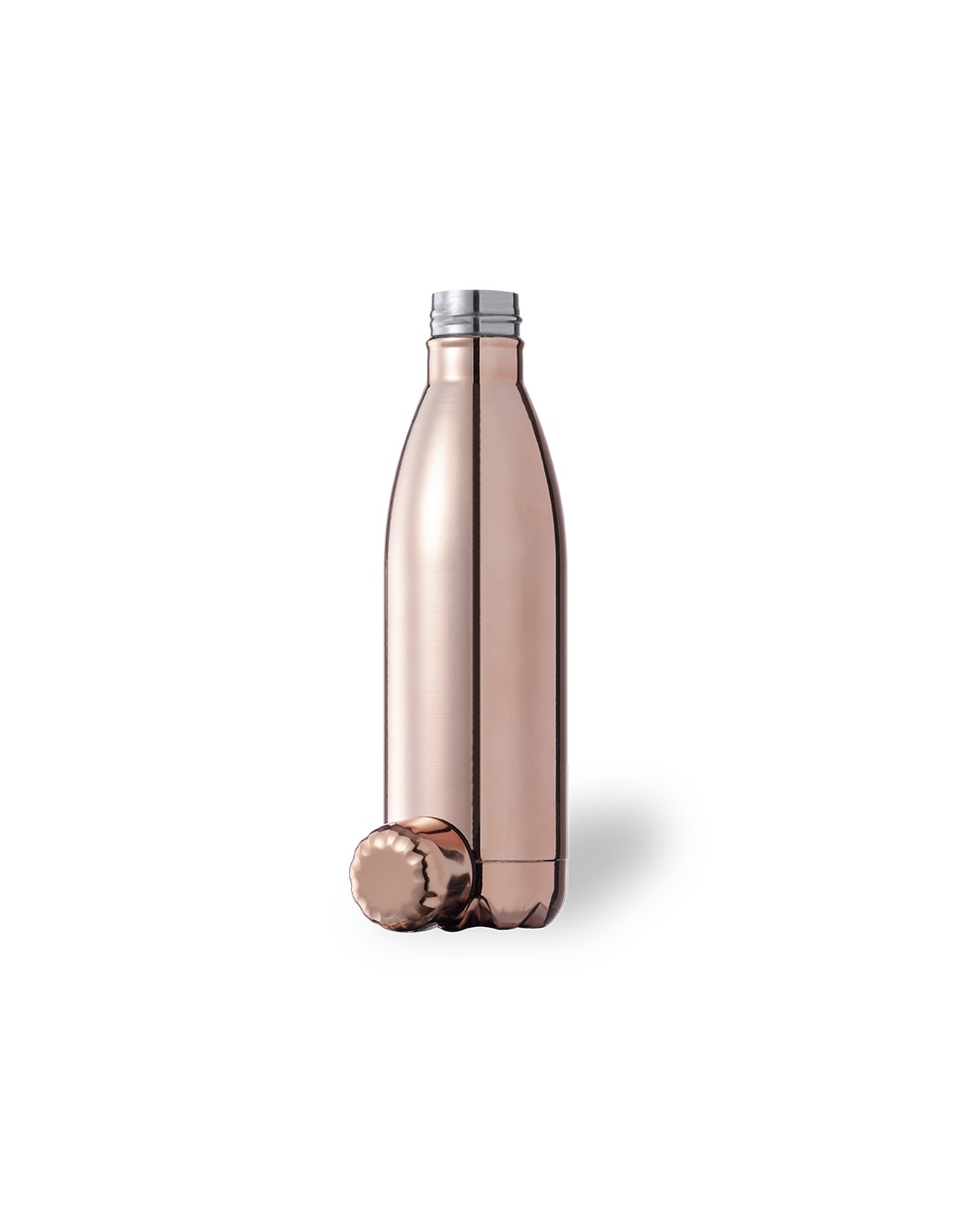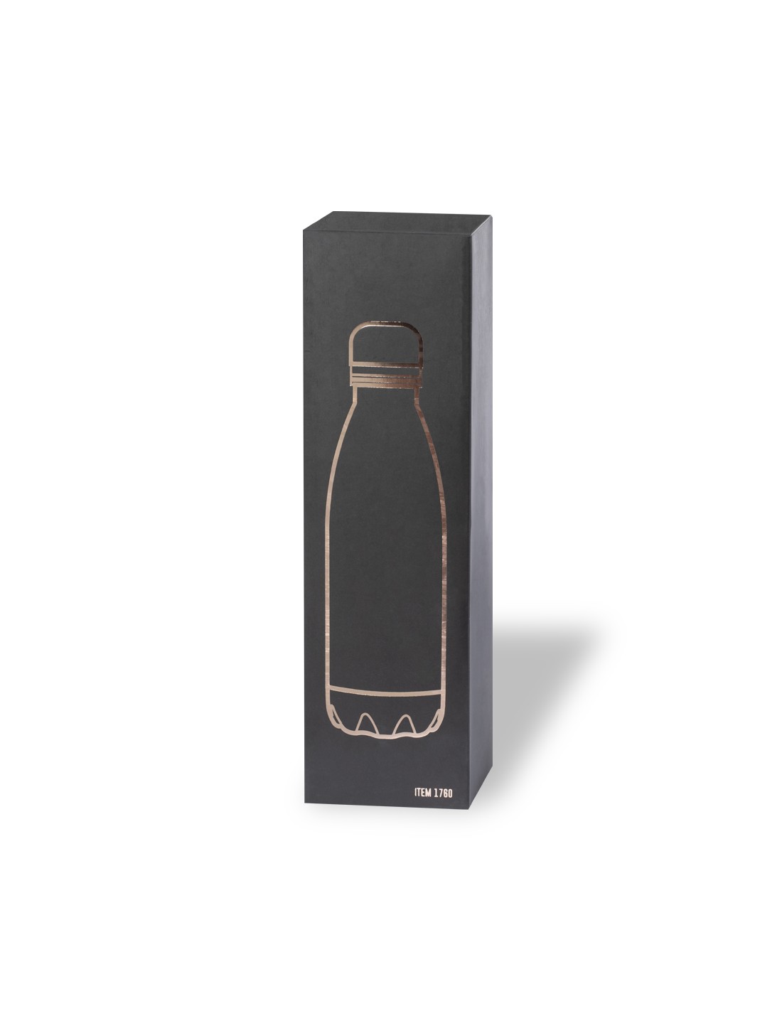 Bidón de 790 ml de capacidad, fabricado en acero inox y con recubrimiento exterior de cobre galvanizado. Tapón a rosca, libre de BPA. Presentado en caja individual negra de elegante diseño.
