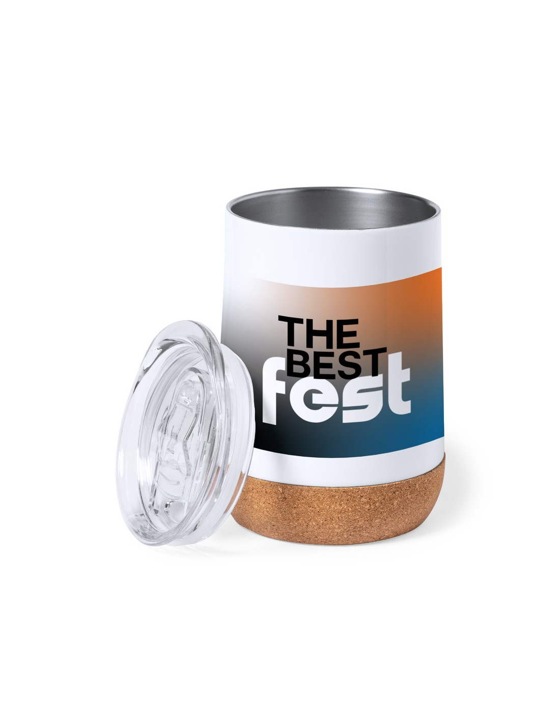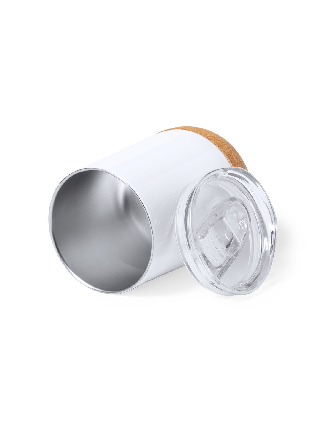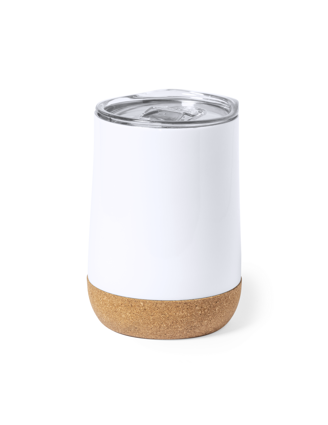 Vaso térmico fabricado en acero inox de doble pared y 330ml de capacidad. Especialmente diseñado para marcaje en sublimación, acabado en blanco brillo. Con dosificador abrefácil en tapa, libre de BPA, y base en corcho natural. Es ideal para tener en tu escritorio, mesa o en cualquier superficie donde disfrutar tranquilamente de tu bebida favorita.