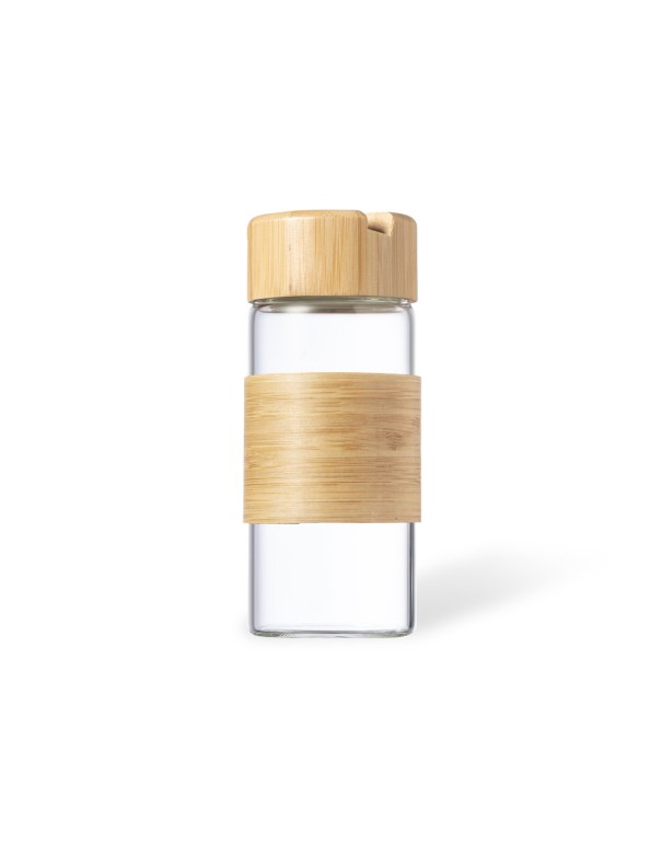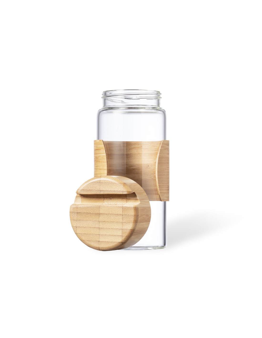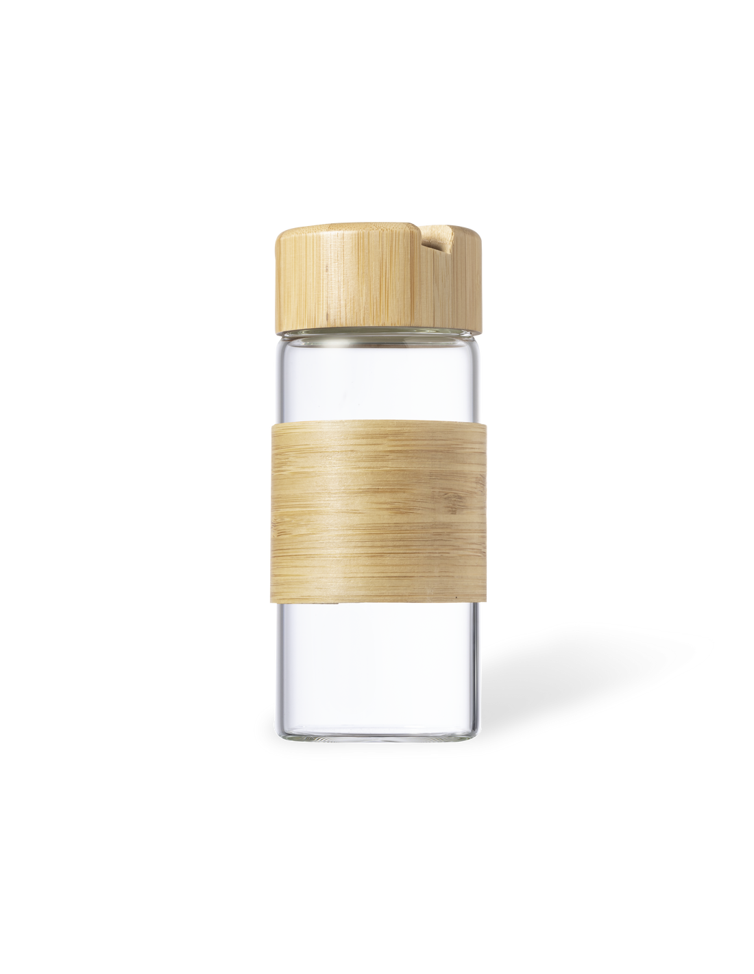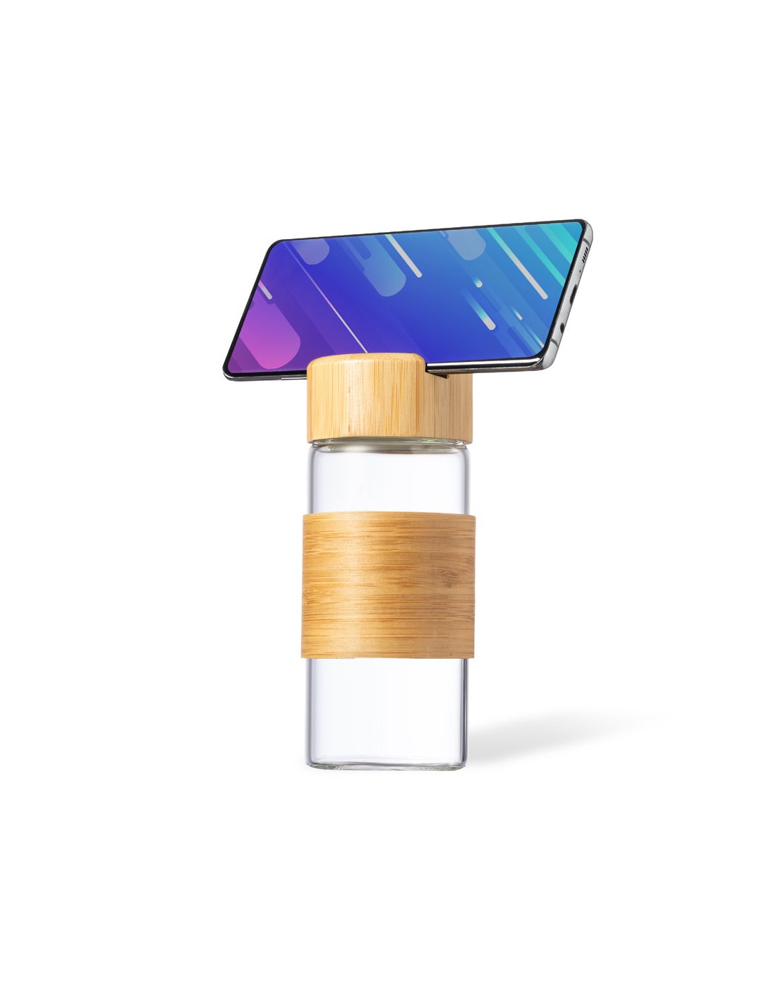 Bidón multifunción de línea nature y 450 ml de capacidad. Cuerpo fabricado en cristal, con tira central en bambú. Incluye tapón a rosca de bambú, con soporte integrado para smartphone. Presentado en caja individual de diseño eco.