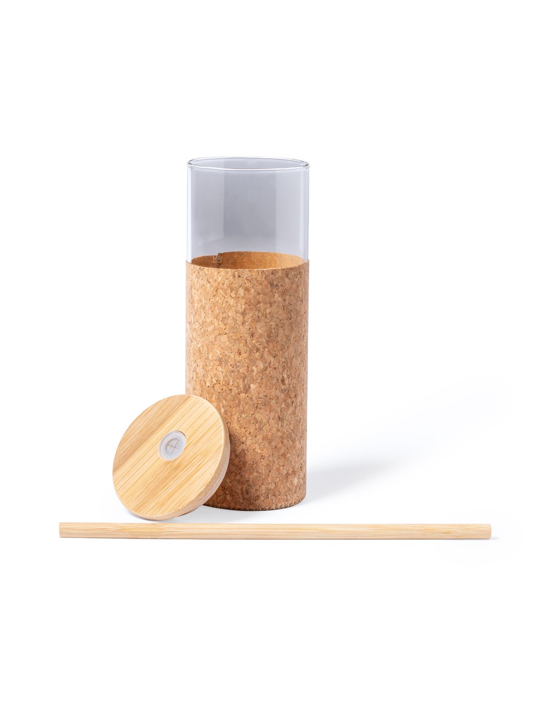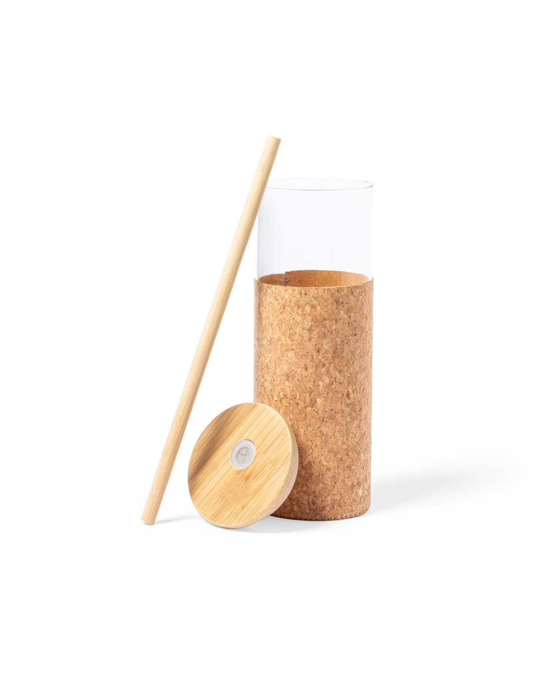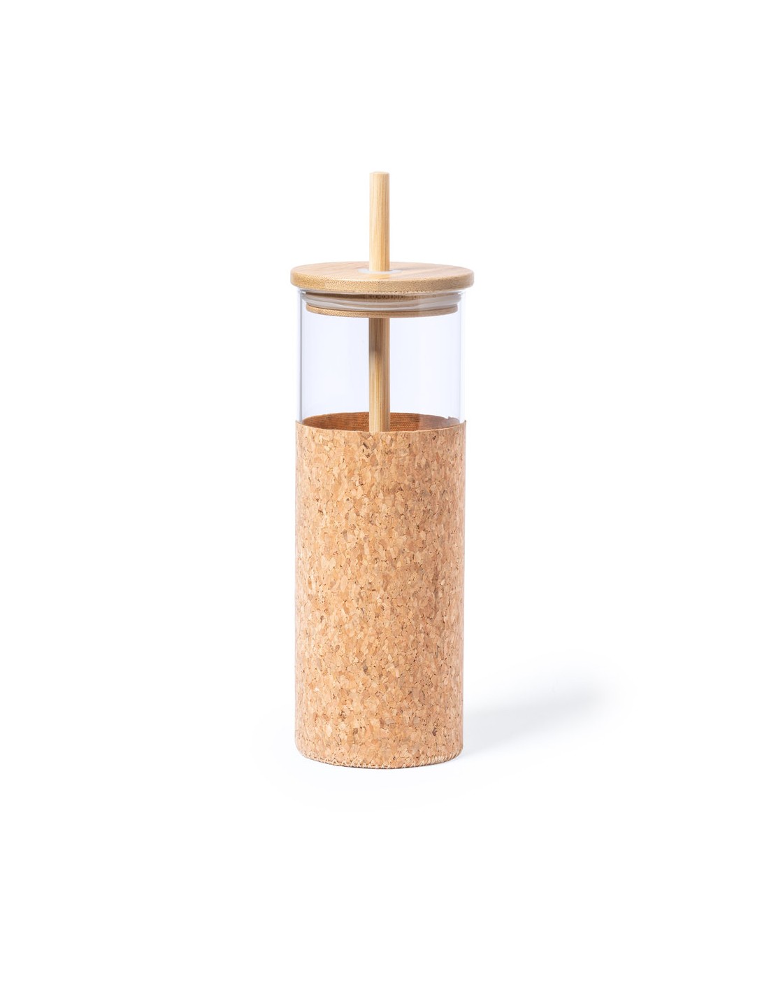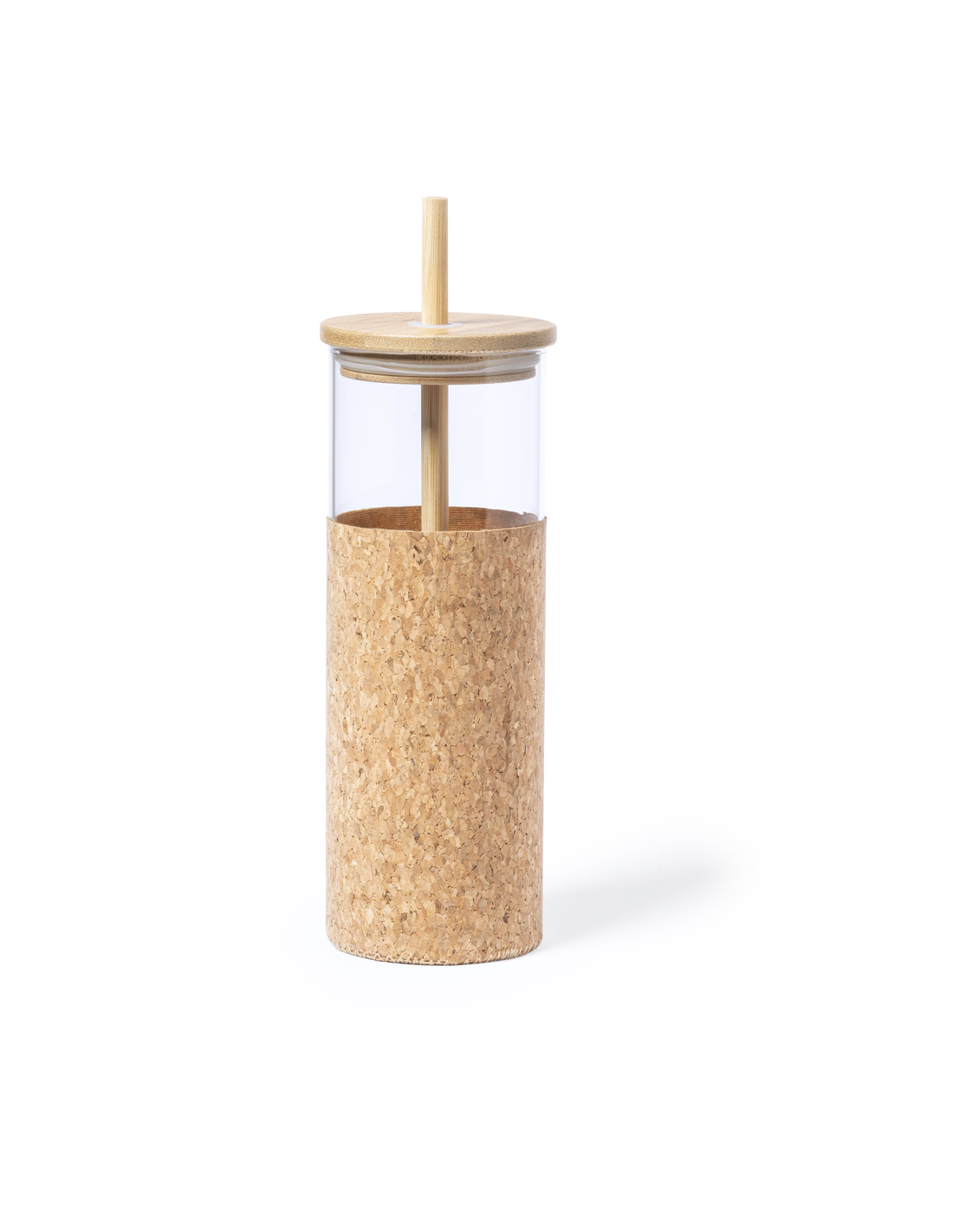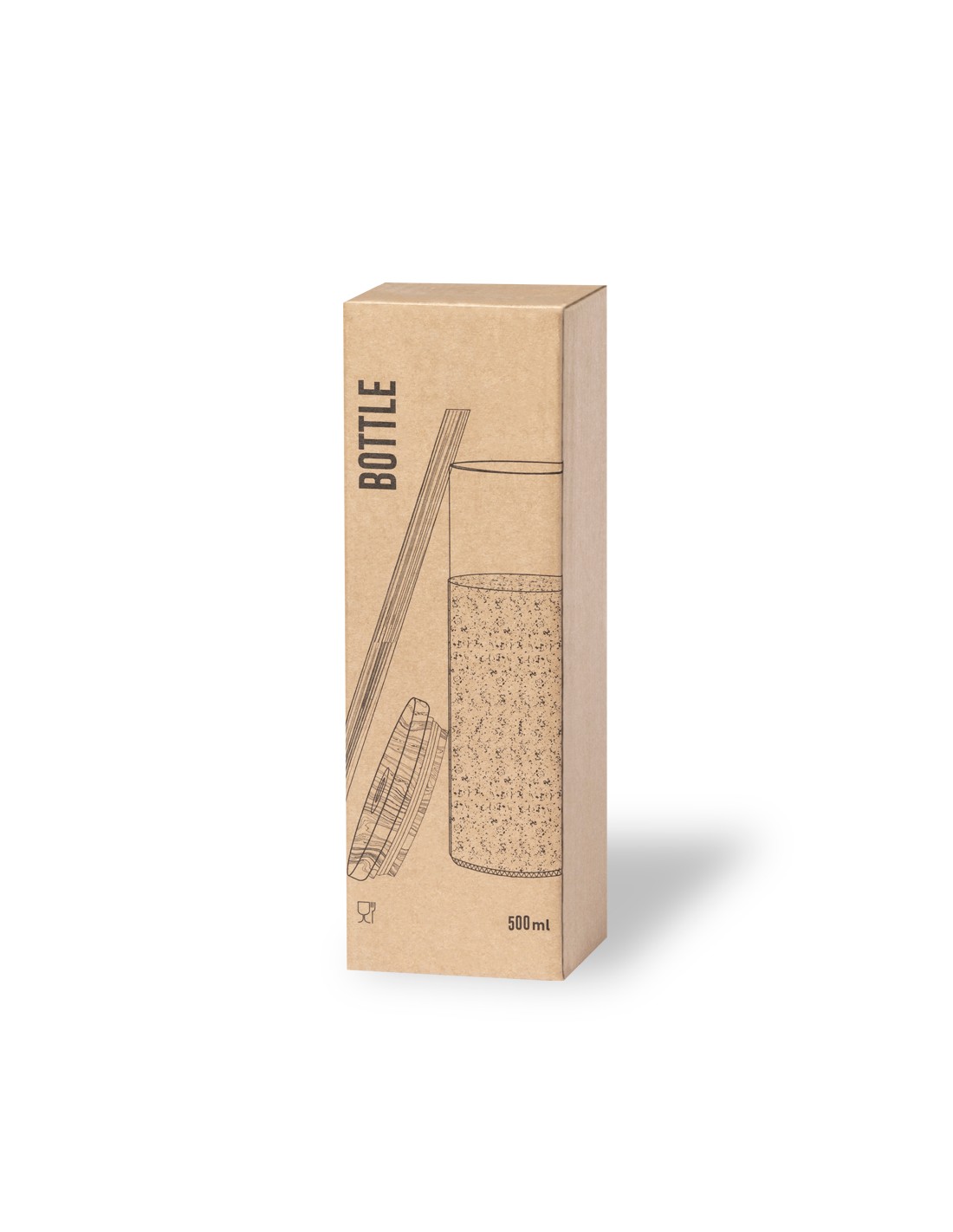 Bidón de línea nature de alta calidad y 500 ml de capacidad. Cuerpo fabricado en cristal de borosilicato, libre de BPA, que ofrece una resistencia y durabilidad excepcionales, alargando su vida útil y pudiendo ser reutilizado infinidad de veces. Incluye funda en corcho natural, tapón de bambú a presión con orificio para pajita y pajita reutilizable de bambú. Presentado en caja individual de diseño eco.