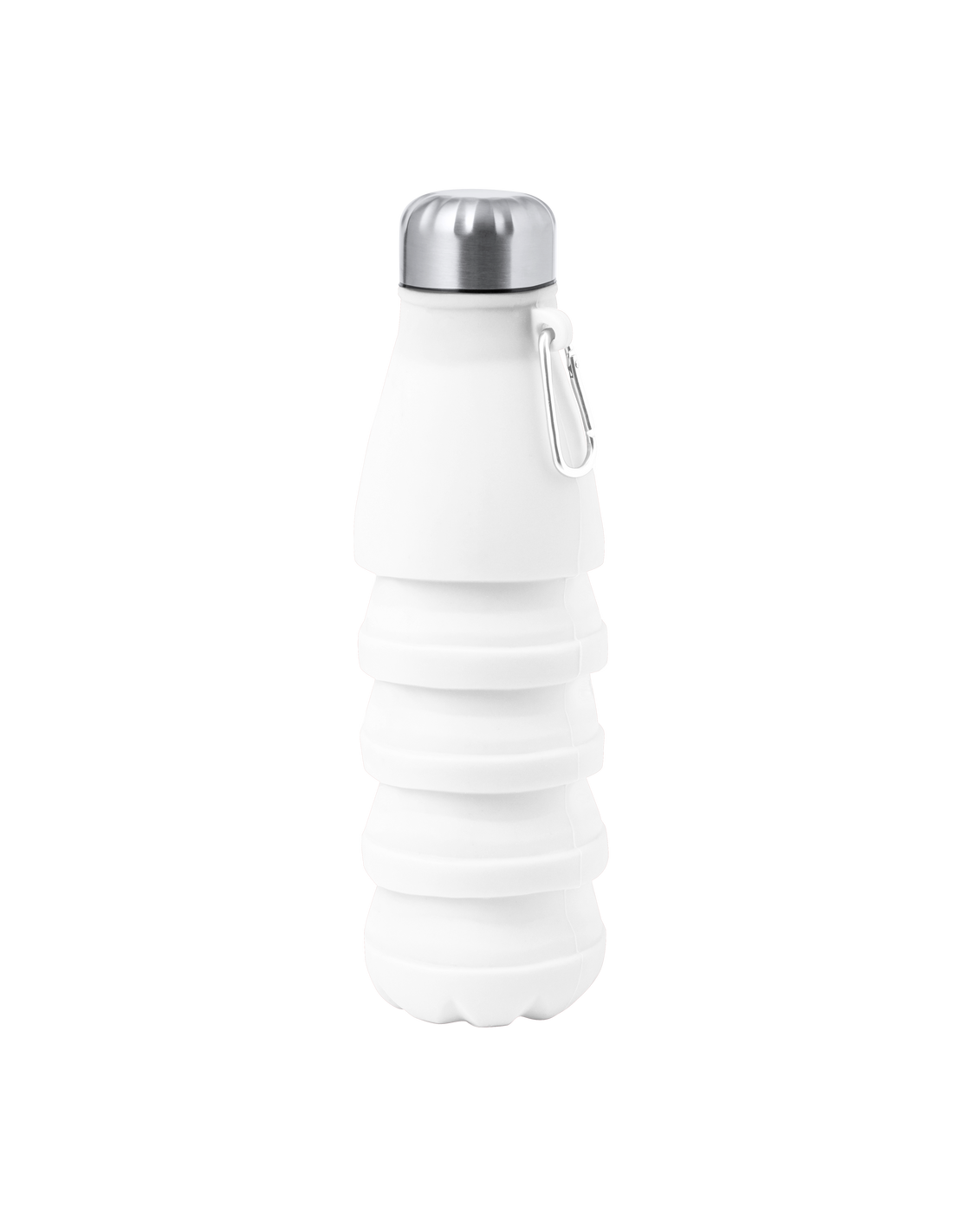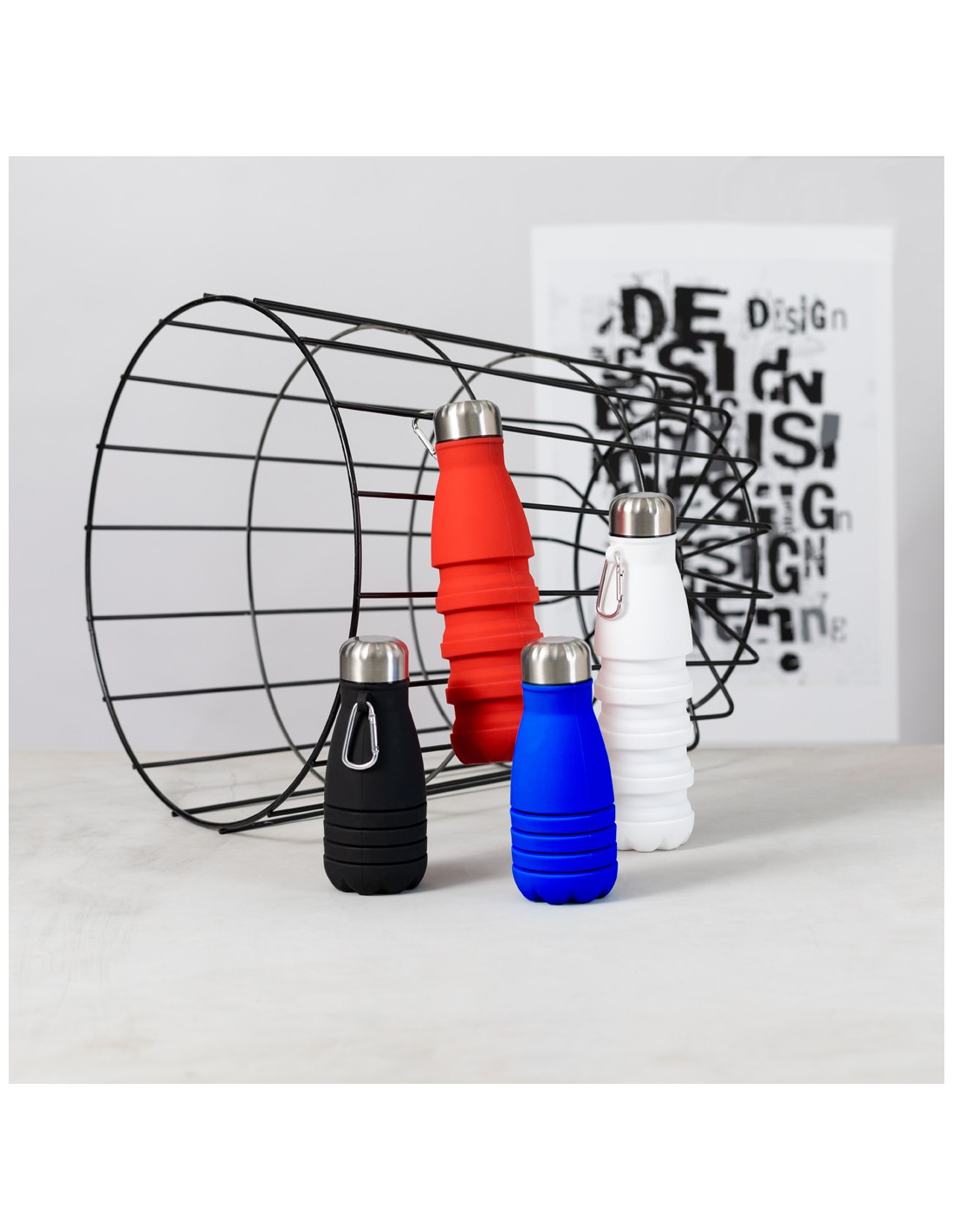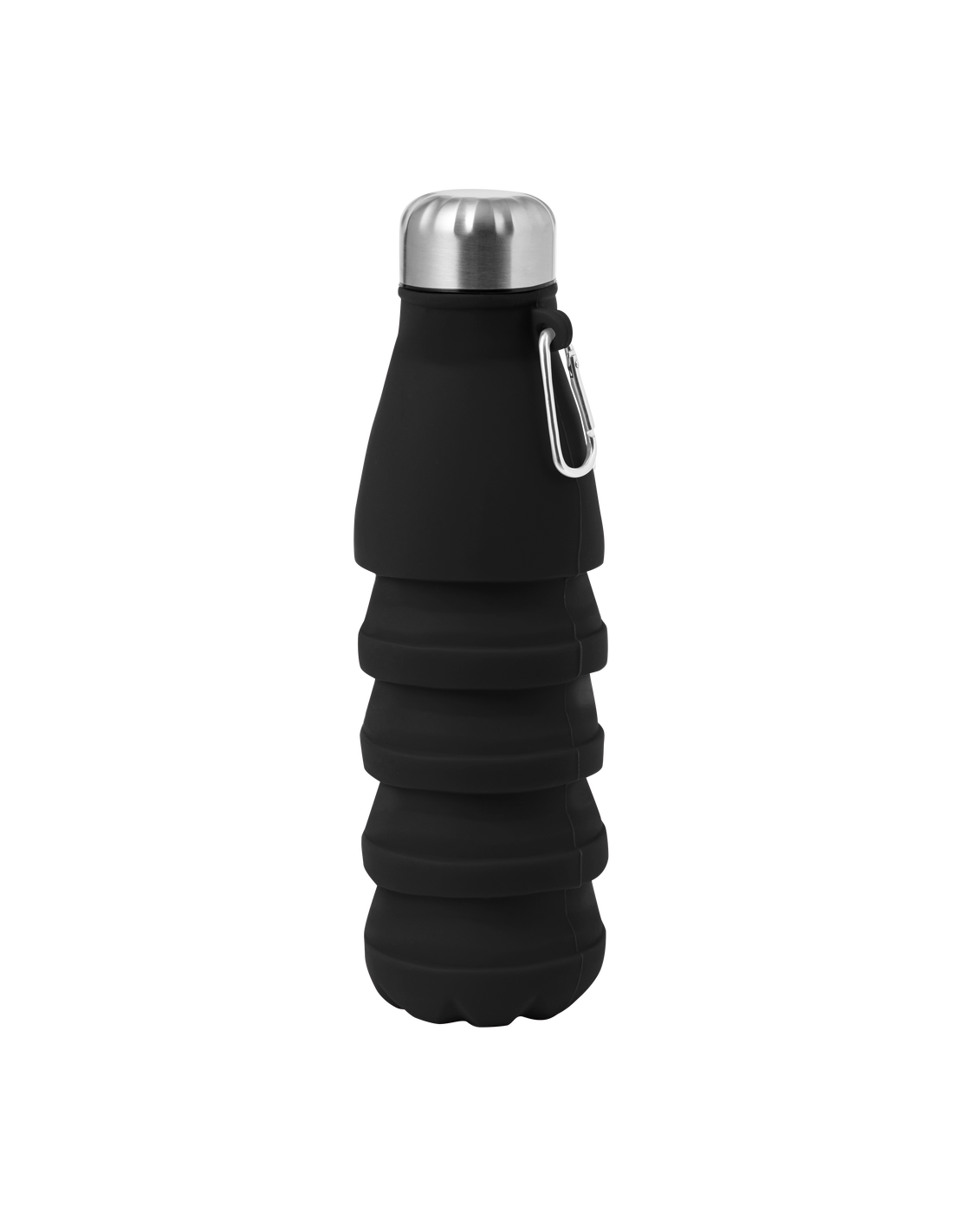 Bidón plegable de 550 ml de capacidad. Fabricado en silicona de alta calidad con tapón de acero inoxidable. Con cuerpo flexible de acabado mate, este bidón puede ser plegado para un cómodo y sencillo almacenamiento. Incluye mosquetón para fácil transporte. Libre de BPA. Es ideal para tener en tu escritorio, mesa o en cualquier superficie donde disfrutar tranquilamente de tu bebida favorita. Medidas plegado: Ø7,1 cm x 16,9 cm de alto. Medidas desplegado Ø7,1 cm hasta 24,8 cm de alto.