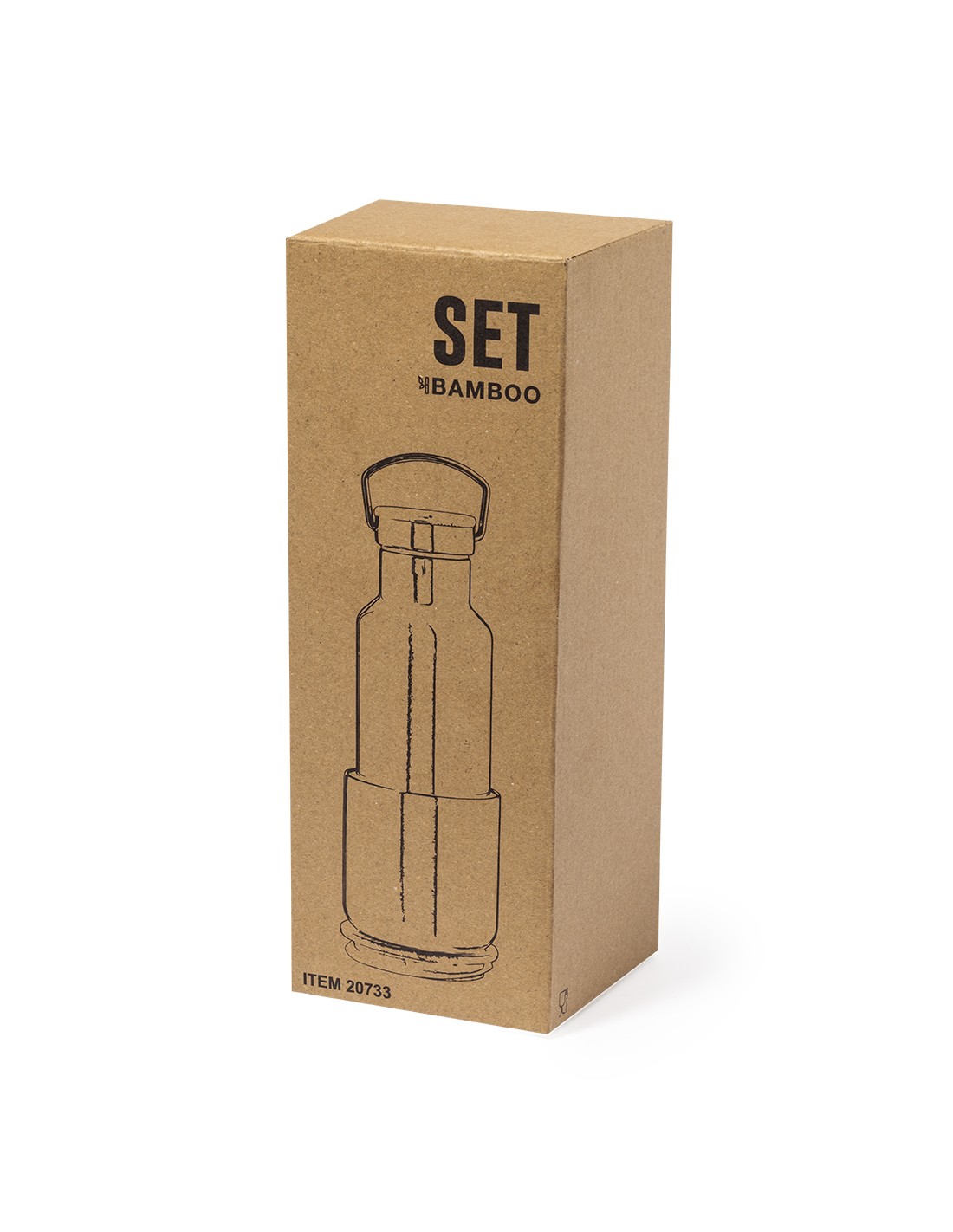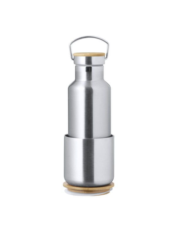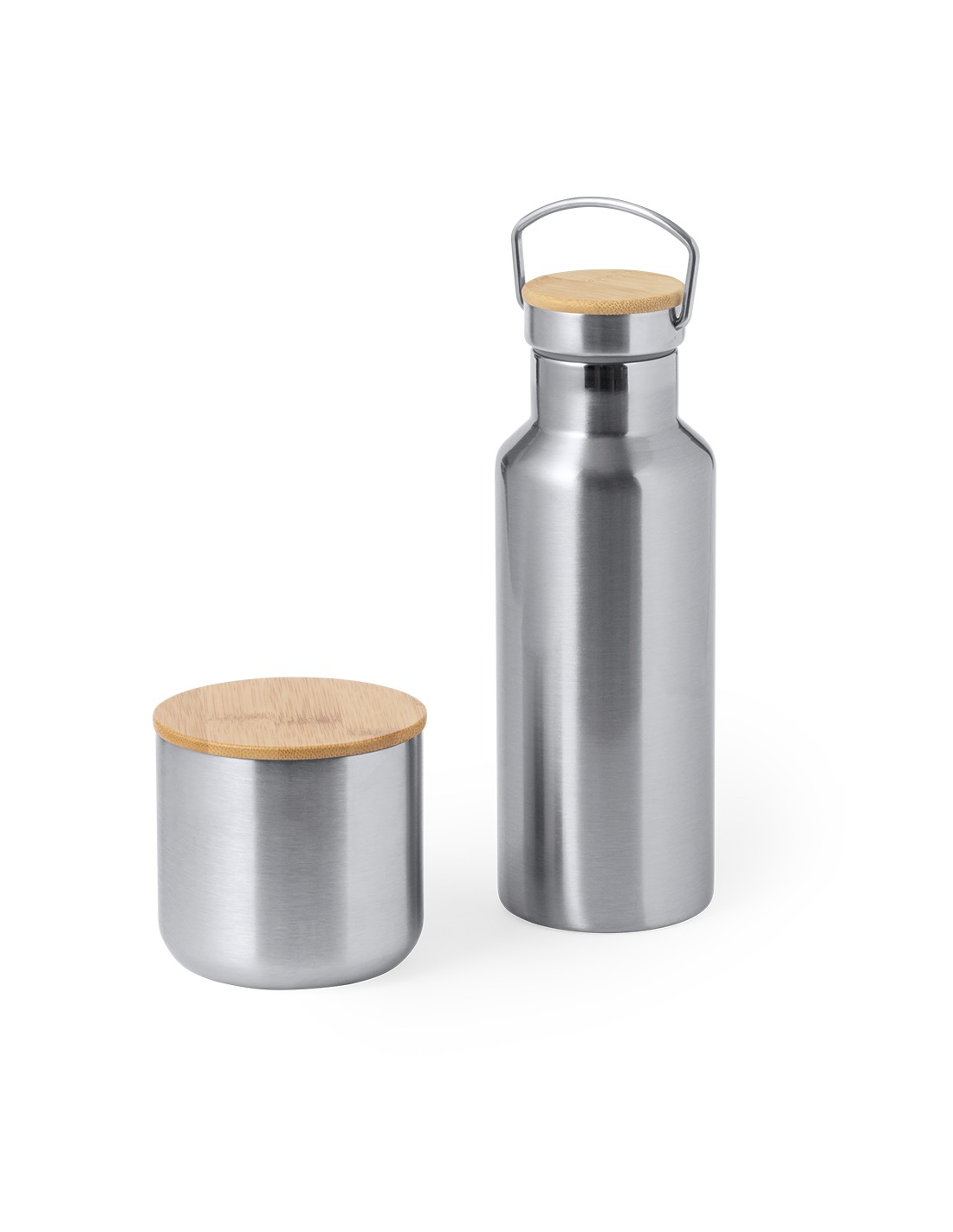 Práctico set de bidón y vaso térmico en acero inox. Incluye, bidón térmico de 500 ml de capacidad fabricado en acero inox, tapón de seguridad a rosca con base de bambú e incluye asa de transporte. Además, contiene 1 vaso de 300 ml de capacidad en acero inox y tapadera bambú con cierre de presión. Presentado en una caja de diseño kraft.