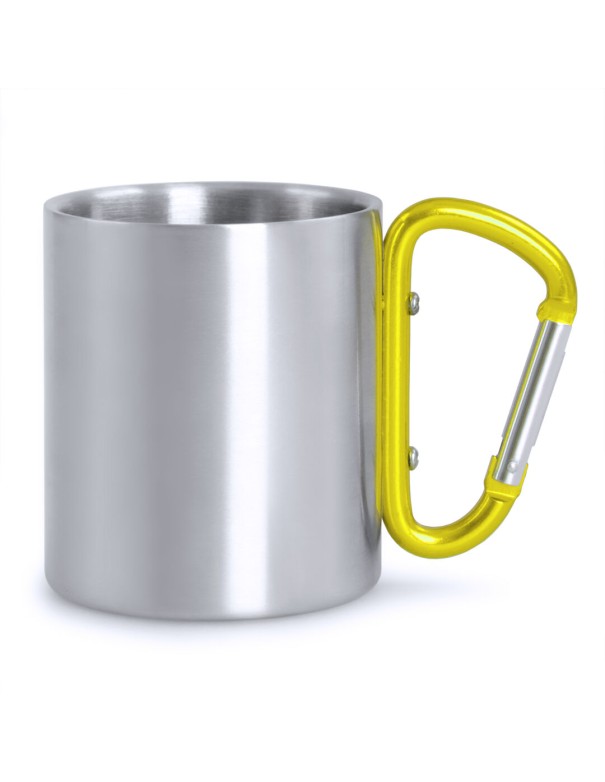 Taza de acero inox de 210ml, con cuerpo de acabado brillante metálico y una funcional asa en forma de mosquetón de colores variados pudiendo ser fácil de transportar. Presentada en una caja de cartón Kraft.