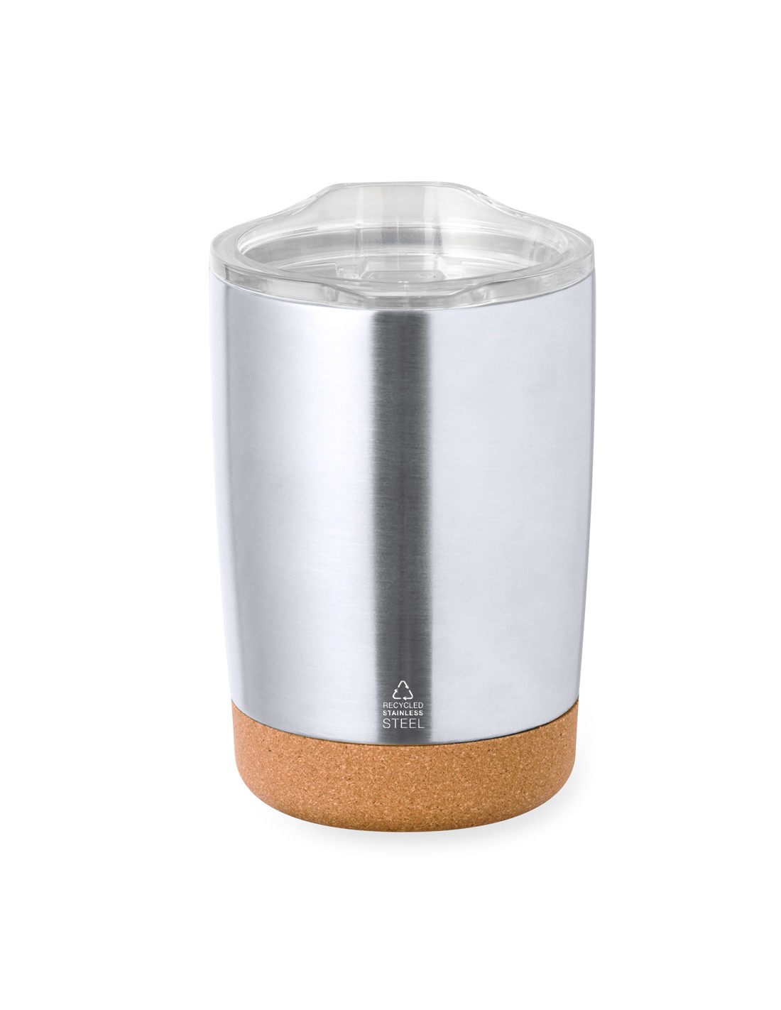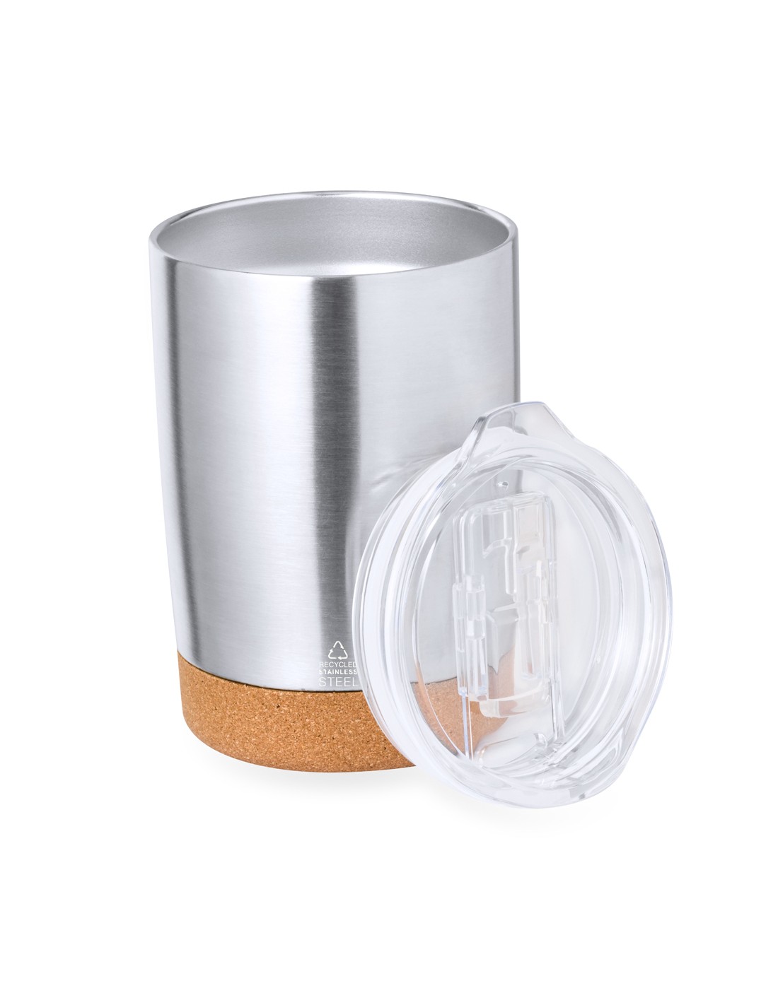 Vaso fabricado en acero inox reciclado en 350 ml de capacidad. Combinación de base en corcho natural con cuerpo en acero inox reciclado de acabado plata. Con doble pared para mejor y más duradera conservación de la temperatura. Original tapón dosificador transparente de fácil apertura, y logotipo Acero Inox Reciclado. Es ideal para tener en tu escritorio, mesa o en cualquier superficie donde disfrutar tranquilamente de tu bebida favorita.El acero es uno de los materiales más demandados y que puede encontrarse casi en todas partes, desde productos de uso diario a grandes construcciones. Con innumerables propiedades, entre las que cabe destacar la durabilidad y su alto grado de reutilización, convirtiéndolo en una alternativa muy valorada en soluciones de sostenibilidad. Debidamente tratado, permite obtener nuevos recursos de infinita utilización.
