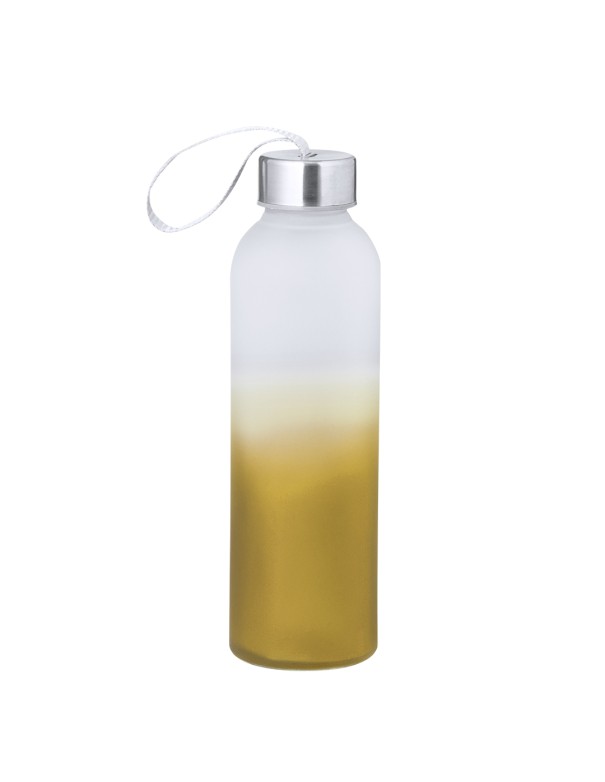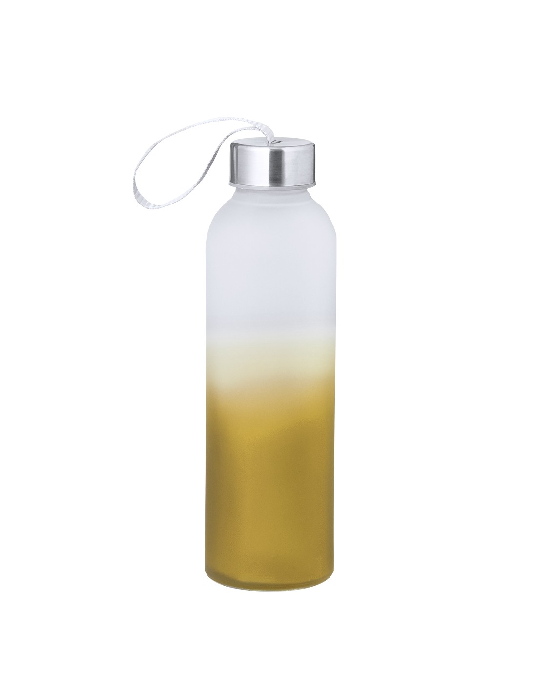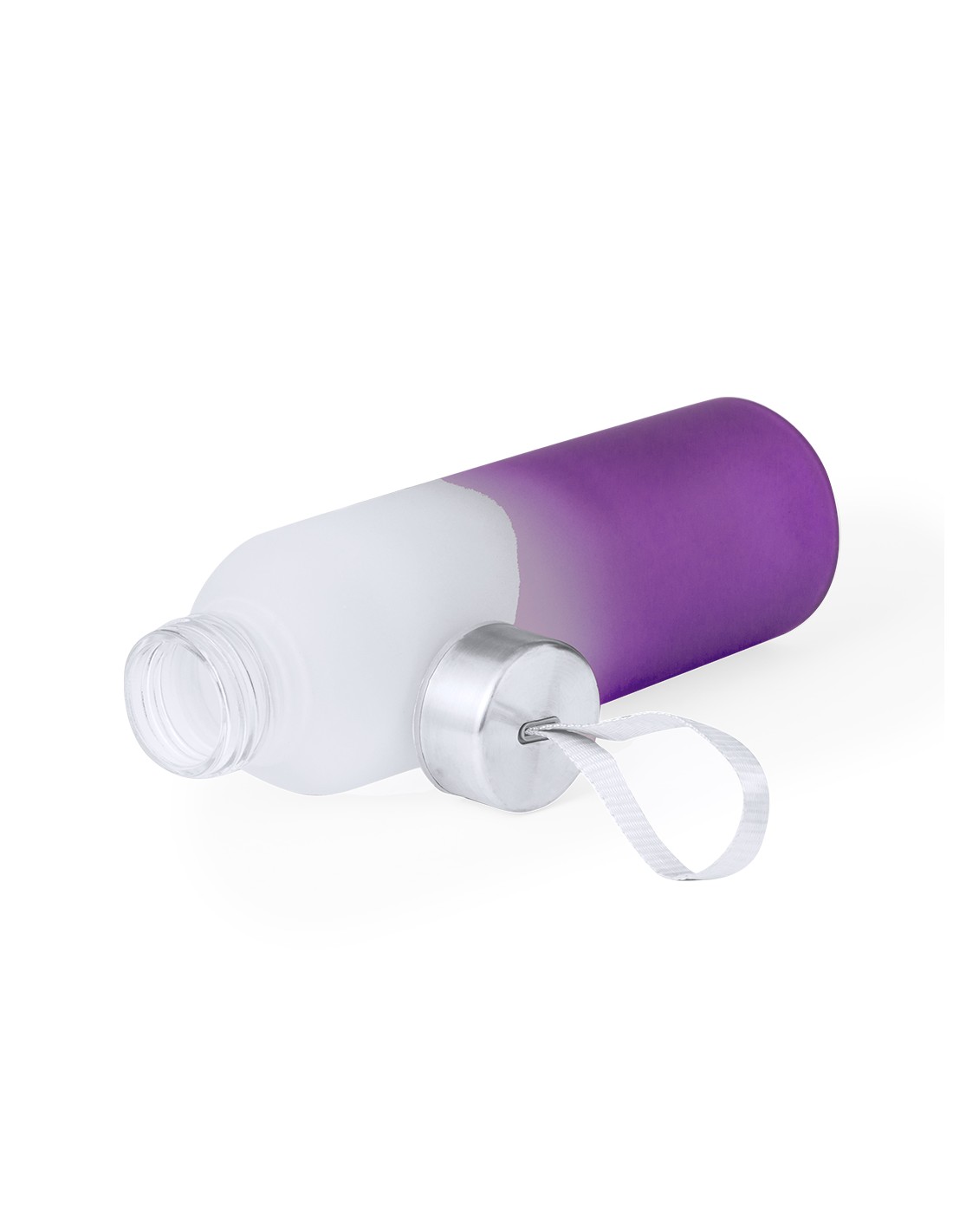 Bidón de cristal y acero inox con 500 ml de capacidad. Original diseño degradado de color blanco translúcido a diversos colores mate. Tapón de rosca con sellado perfecto con correa para su fácil transporte. Presentado individualmente en caja de diseño kraft.