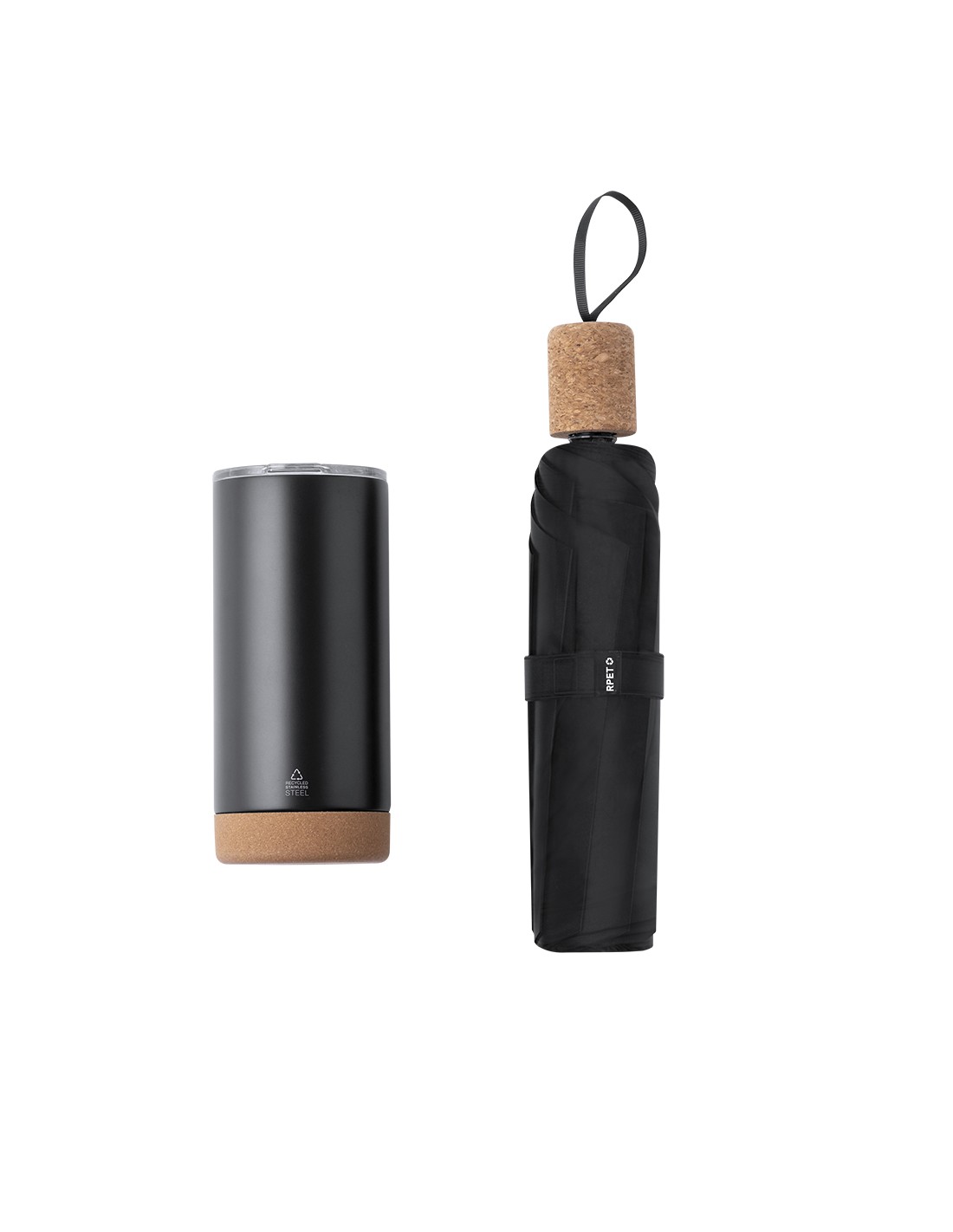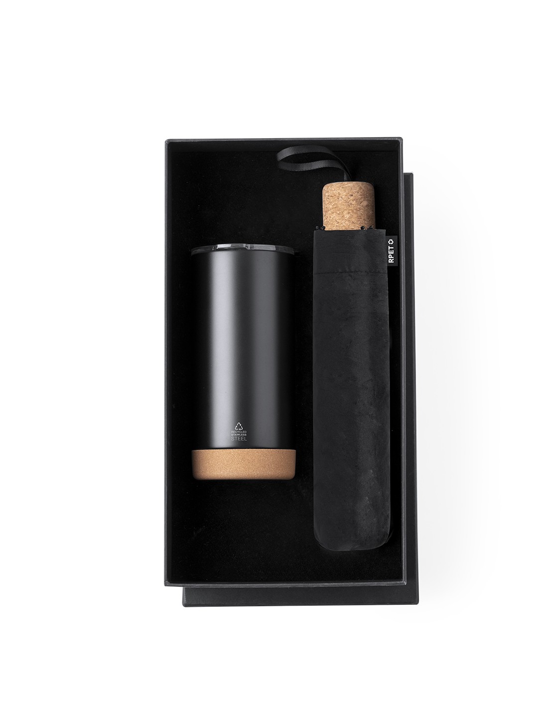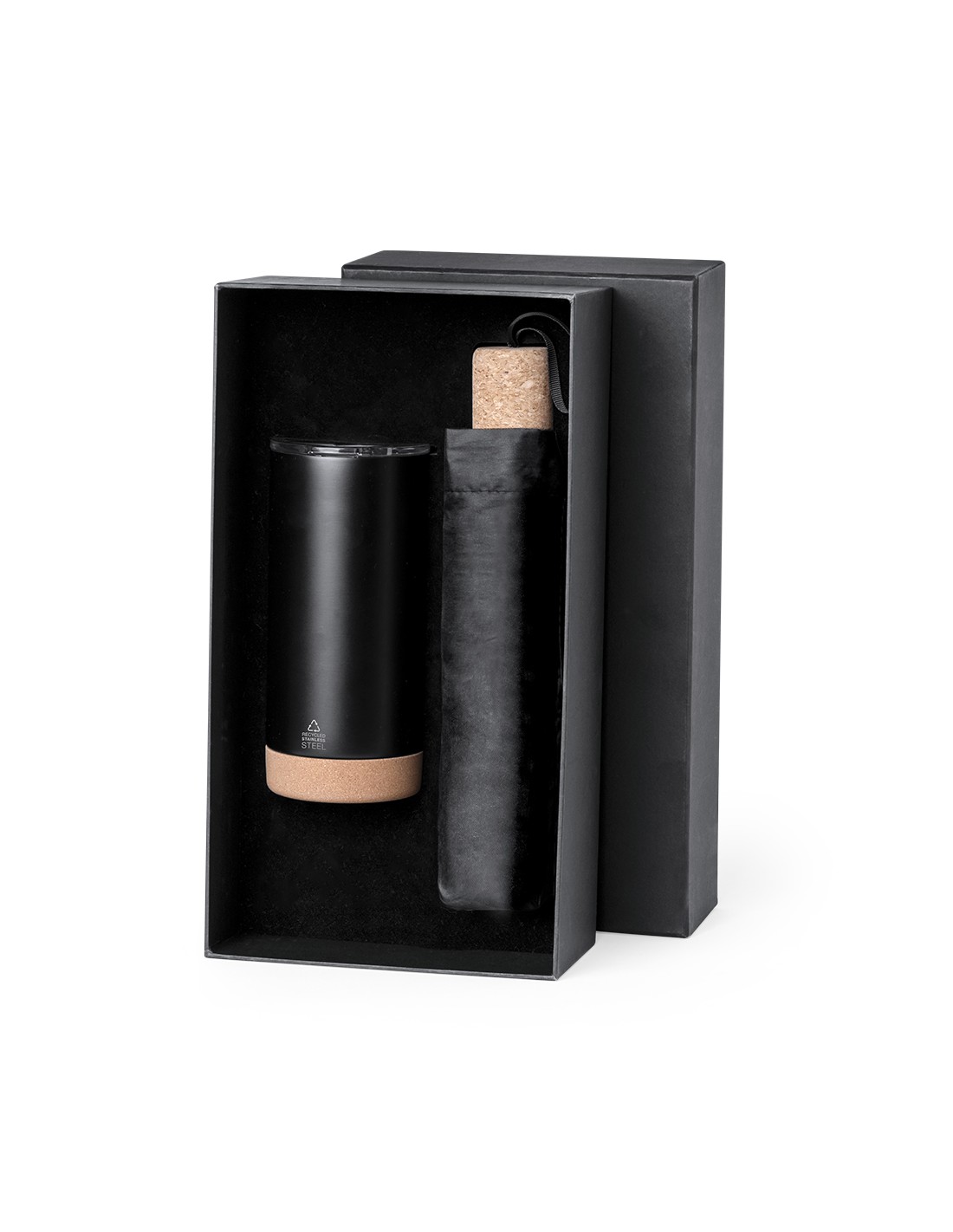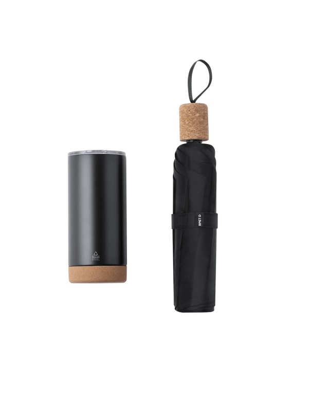 Elegante set premium que incluye: Vaso térmico de doble pared en Acero Inox Reciclado y 550 ml de capacidad, con elegante acabado negro mate. Base de corcho, con tapadera a presión y dosificador. Es ideal para tener en tu escritorio, mesa o en cualquier superficie donde disfrutar tranquilamente de tu bebida favorita. Paraguas plegable de color negro con 98cm de diámetro. En material pongee 190T RPET y mango de corcho. De apertura manual, con sistema anti viento y varillas en fibra de vidrio. Con etiqueta distintiva RPET. Set presentado en estuche individual de acabado mate, con troquelado interior para cada uno de los elementos del set. El material RPET se elabora a partir de plástico reciclado, para así fomentar la reutilización de residuos plásticos y ayudar a la sostenibilidad del planeta.