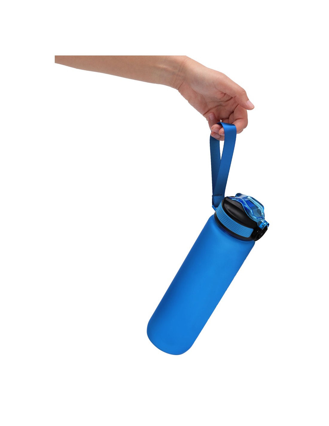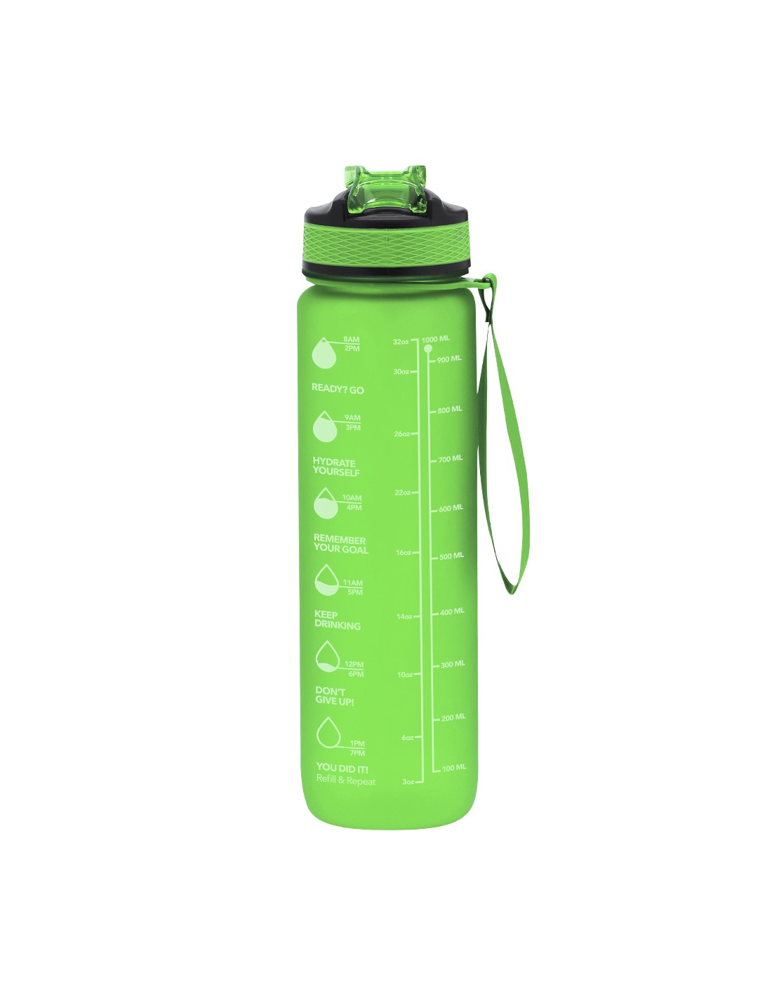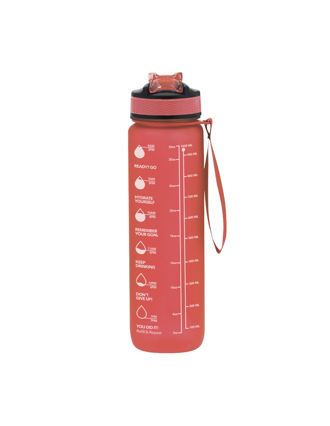Bidón de 1L de capacidad, fabricado en resistente PETG y en acabado translúcido mate.Con indicador de capacidad en litros y onzas, junto con frases motivadoras que invitan a mantener una adecuada hidratación. Con tapón negro de rosca. Incluye dosificador con cierre de seguridad y cómoda cinta de transporte. Libre de BPA.