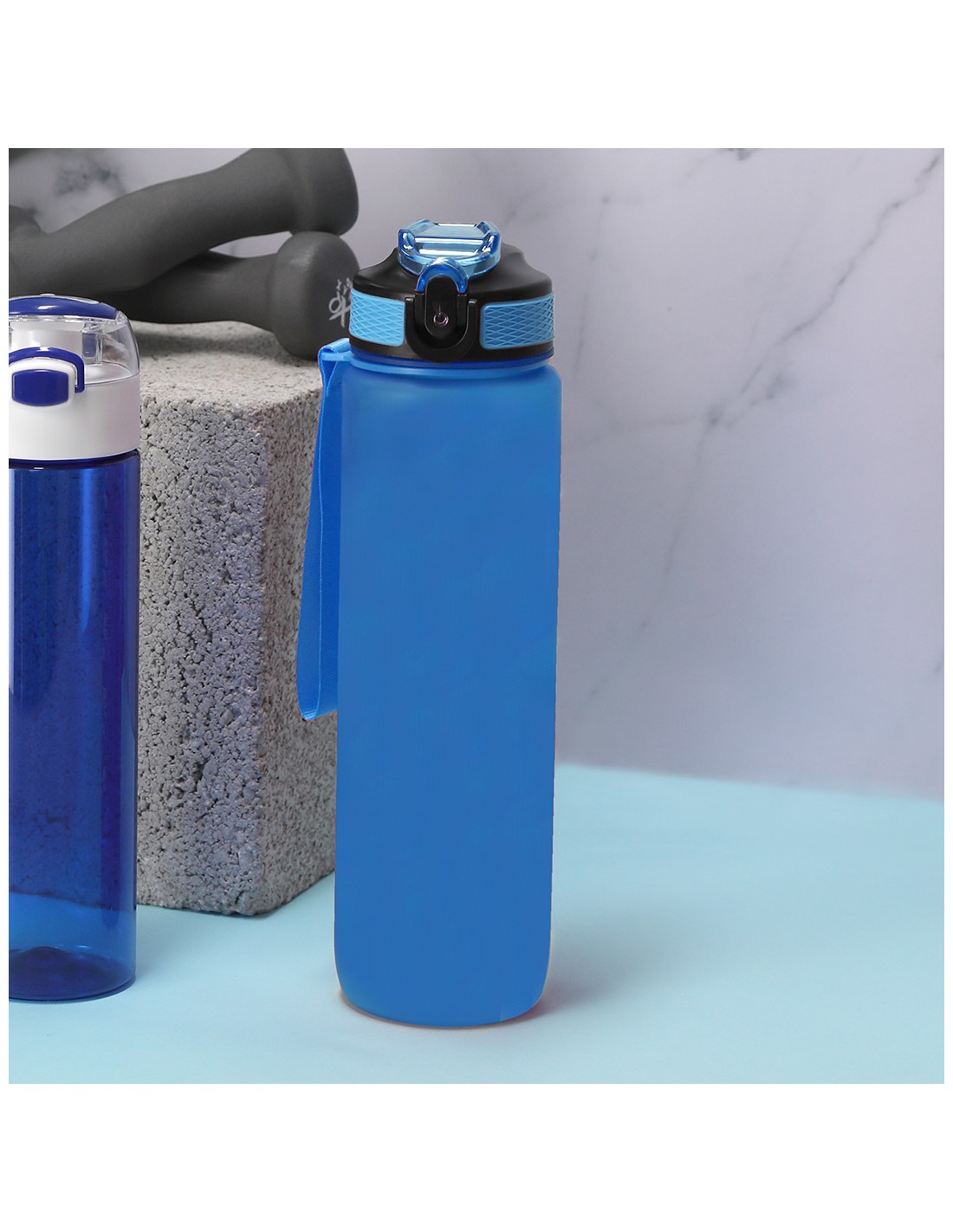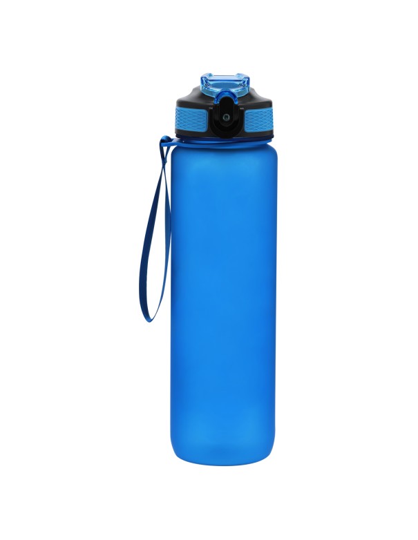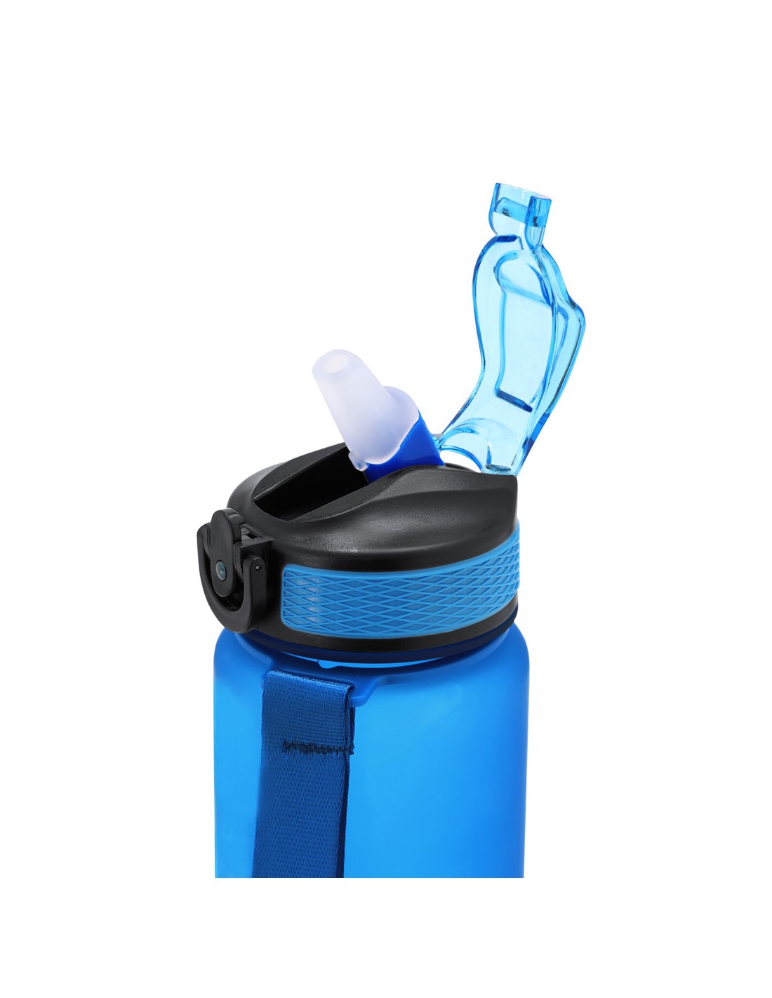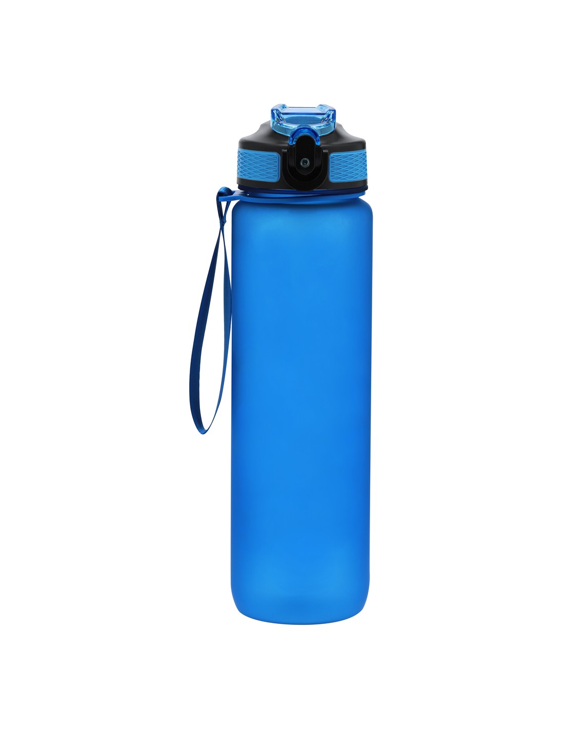 Bidón de 1L de capacidad, fabricado en resistente PETG y en acabado translúcido mate.Con indicador de capacidad en litros y onzas, junto con frases motivadoras que invitan a mantener una adecuada hidratación. Con tapón negro de rosca. Incluye dosificador con cierre de seguridad y cómoda cinta de transporte. Libre de BPA.