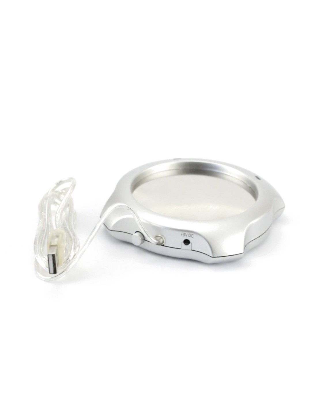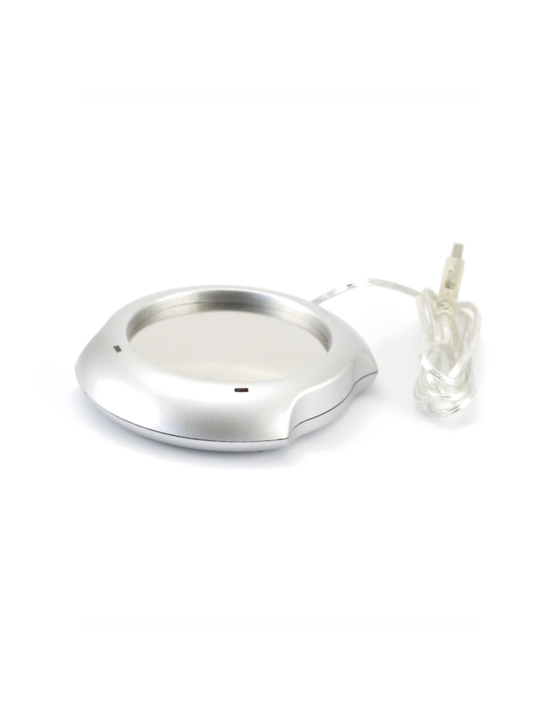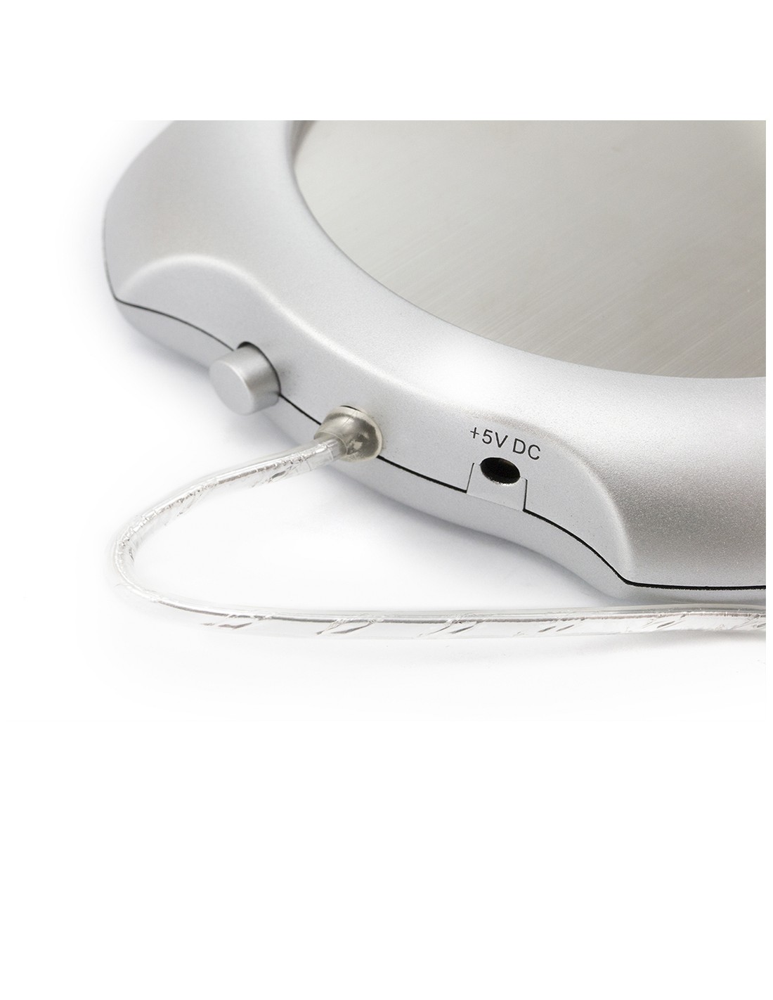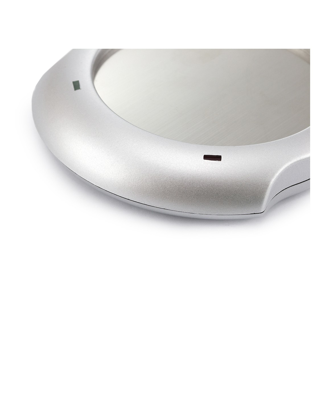 Calentador de tazas con conexión USB y de superficie metálica, especialmente diseñada para mantener el calor. De elegante diseño en color gris y compatible con tazas de hasta 7,4cm de diámetro, incorpora interruptor en la parte trasera y luces de estado. Presentada en caja individual.
