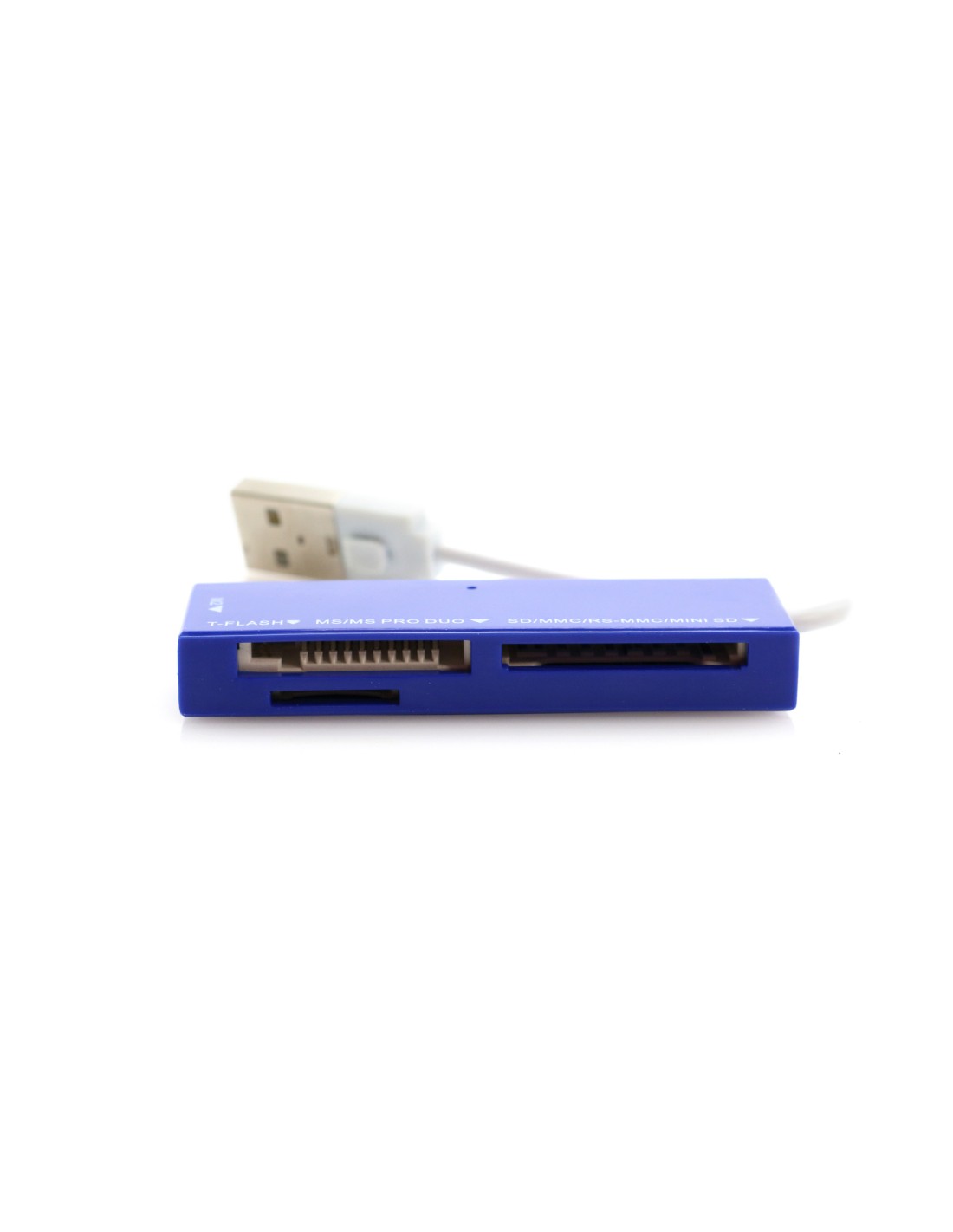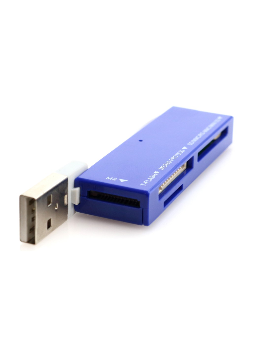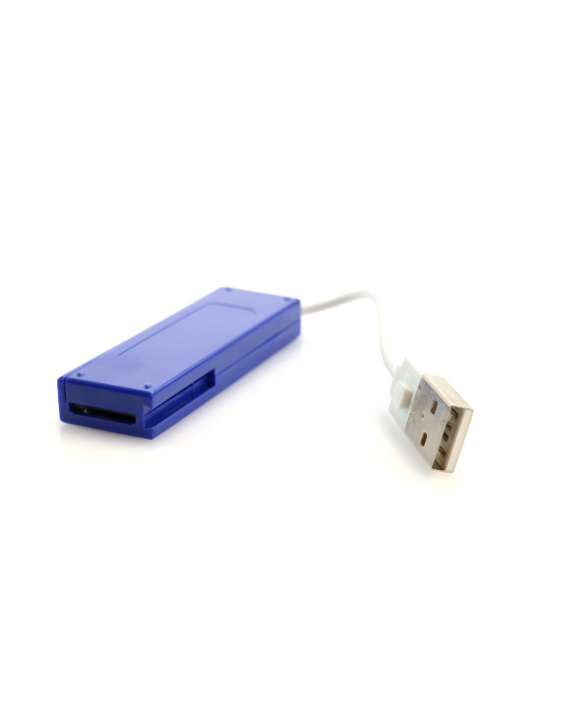Completo lector de tarjetas con conexión USB 2.0. De diseño cuadrado, en variados colores y compatible con prácticamente todos los formatos de tarjeta de memoria existentes en el mercado: M2, MS Duo, MS Pro Duo, MS, MS Pro, MicroSD, MiniSD, RSmmC, SD,mmC. Presentado en caja individual.