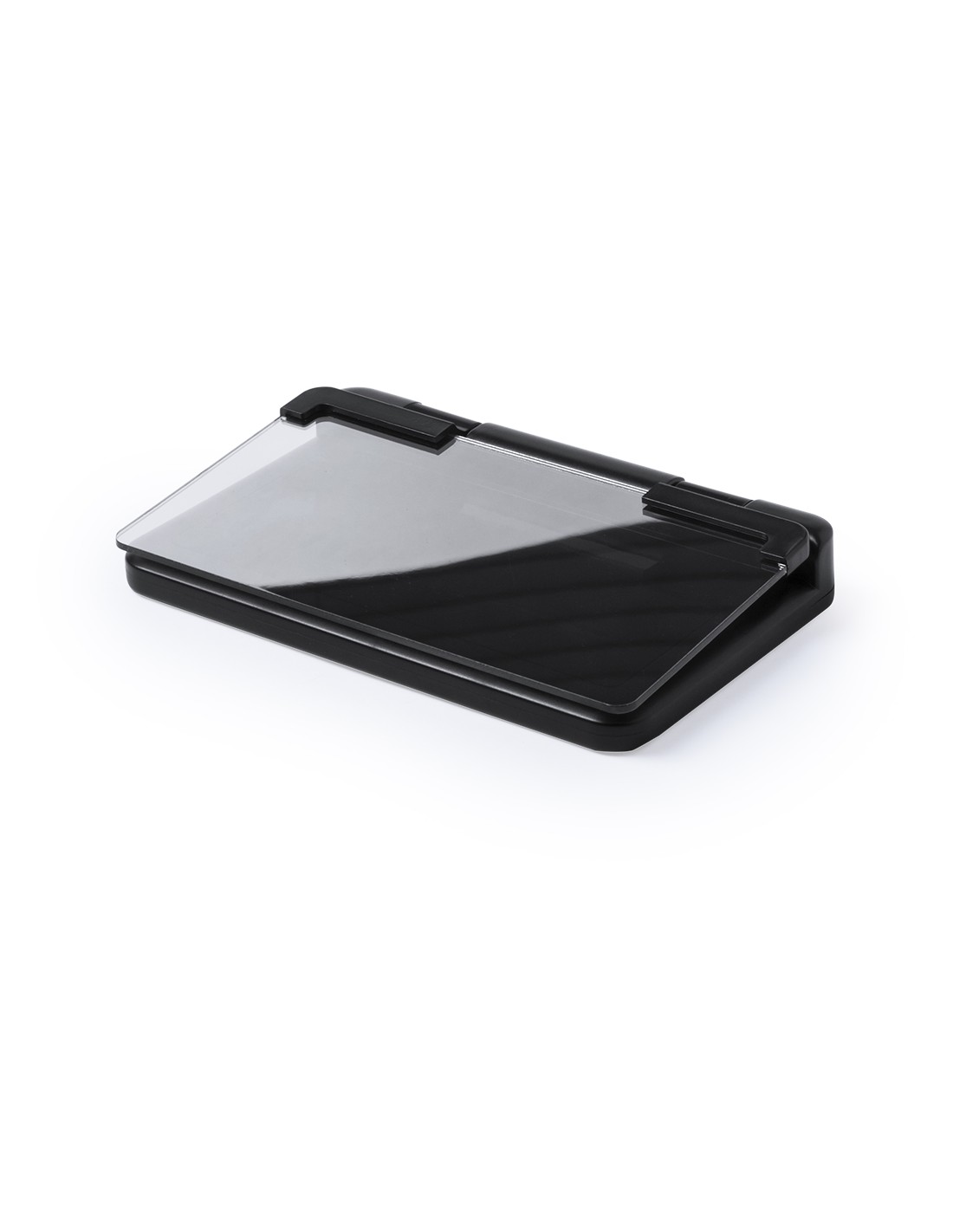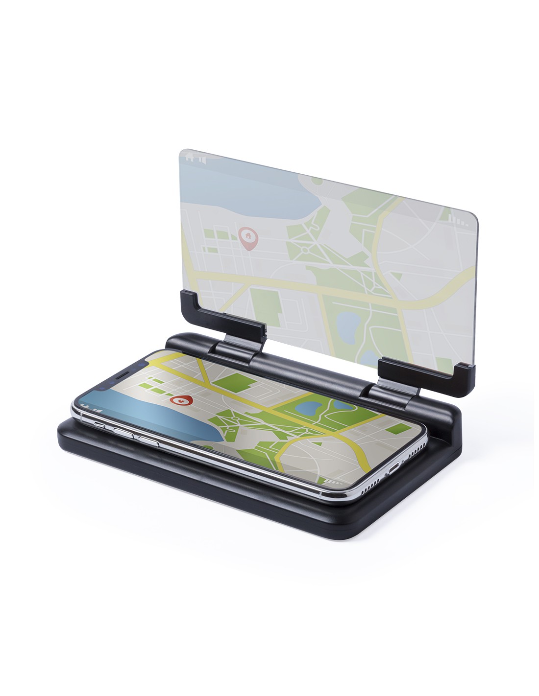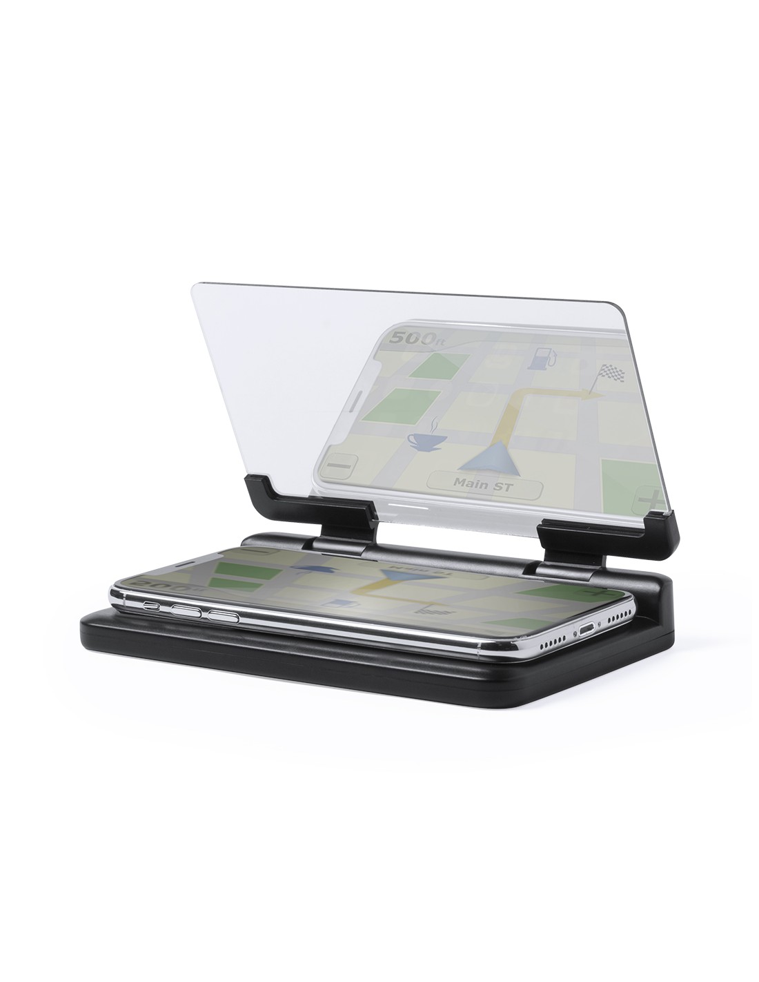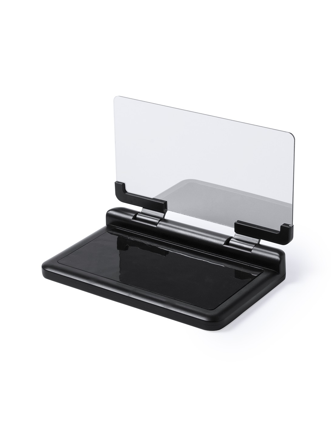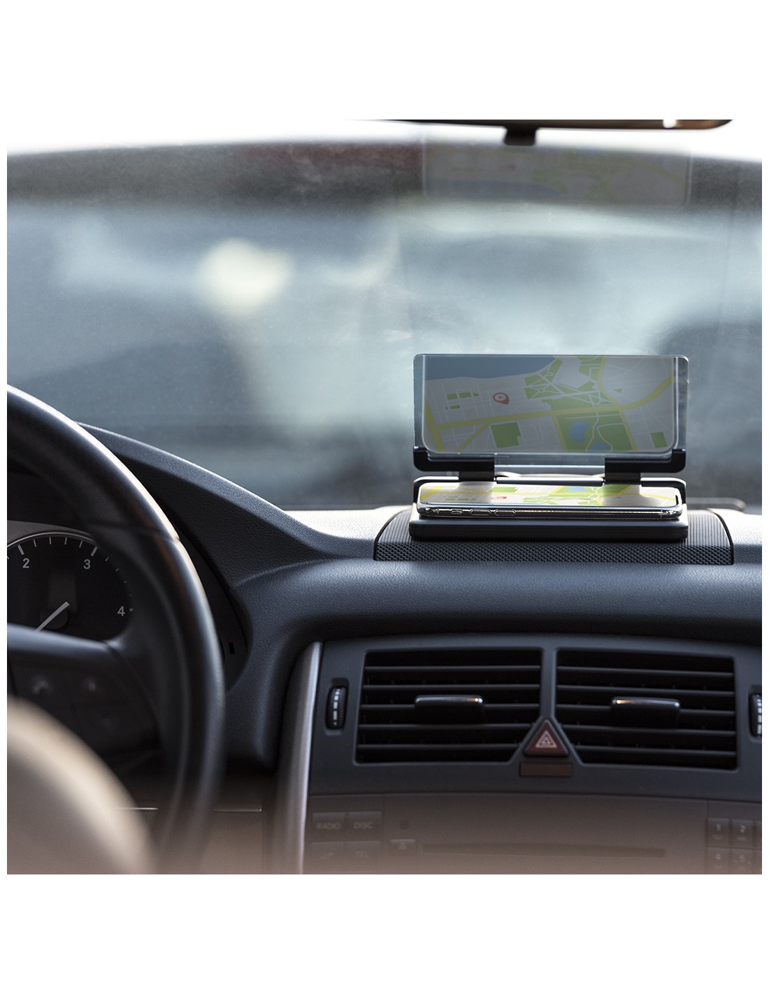 Pantalla soporte para automóvil. Con espejo duplicador de imagen ajustable y superficie anti deslizante ultra adherente para salpicadero y smartphone. Presentado en atractiva caja de diseño.