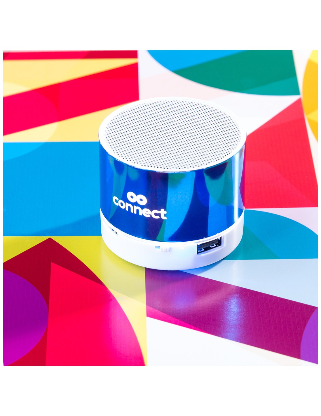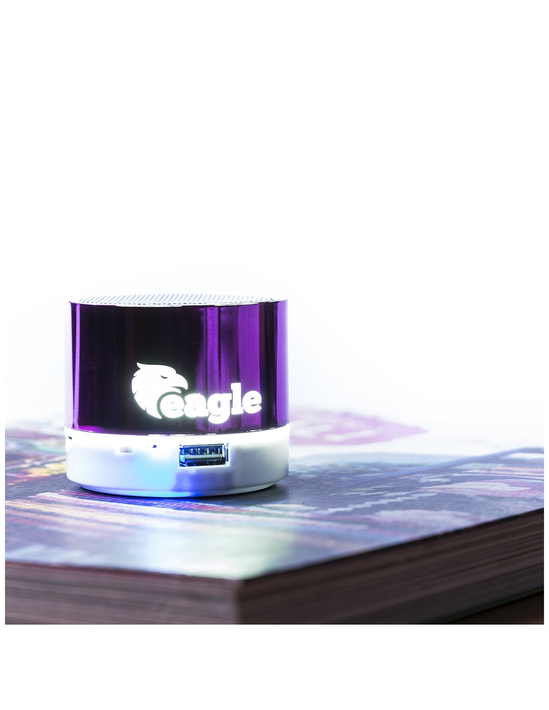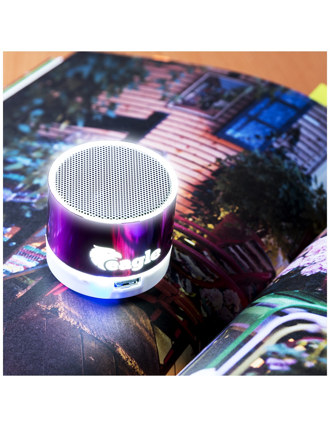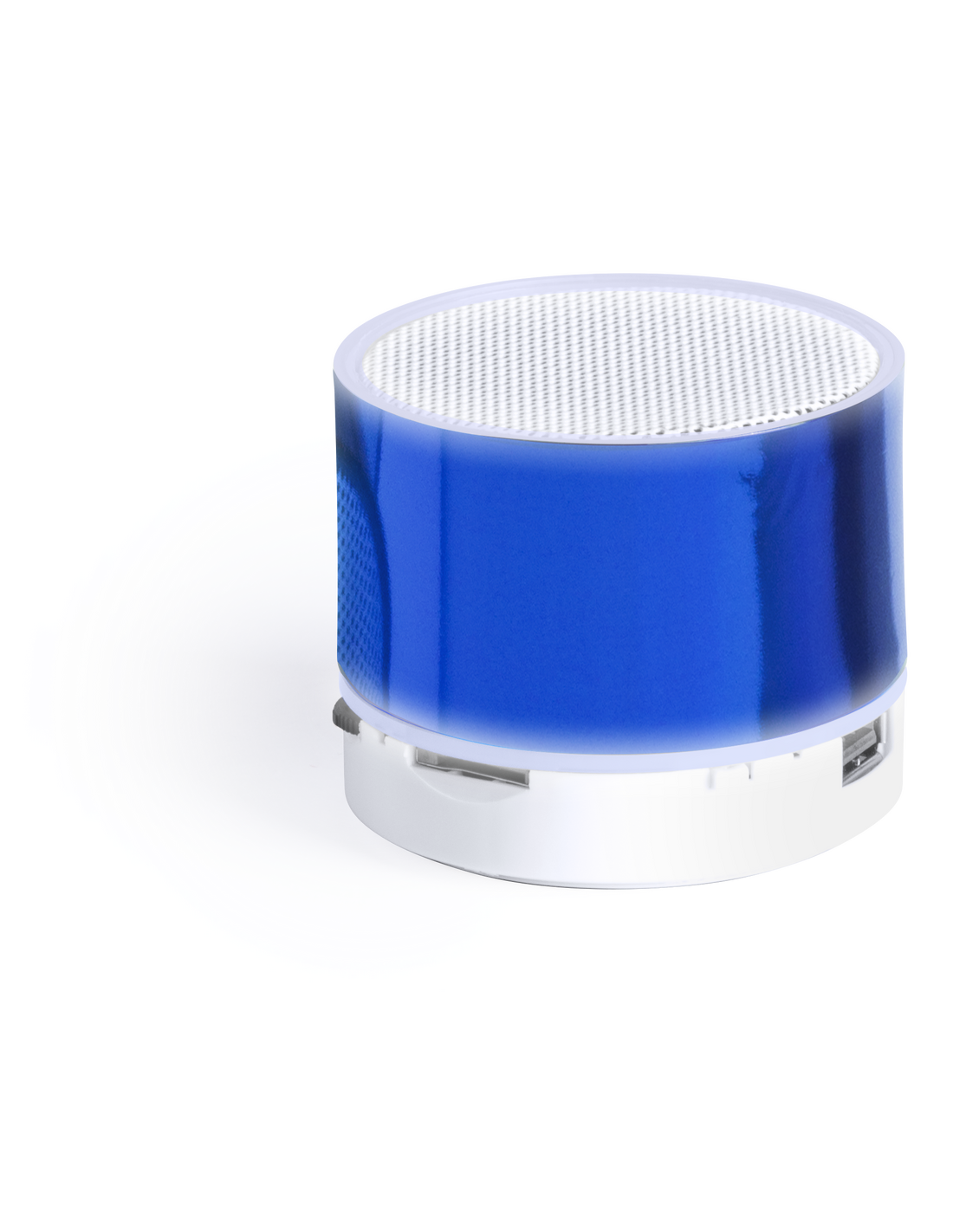 Compacto altavoz de conexión Bluetooth con interior iluminado. Superficie exterior especialmente diseñada para marcaje en láser y así iluminar el logotipo marcado. De diseño bicolor con suave acabado y conexión Bluetooth 3.0, ofrece 3W de potencia, tiene función de manos libres, una ranura para tarjetas micro SD de hasta 32 GB de capacidad, función radio FM, entrada auxiliar de línea mediante conexión jack de 3,5mm y soportes de goma antideslizantes en la base. Compatible con iOS y Android, incluye cable de carga mini USB, cable auxiliar jack de 3,5mm y viene presentado en atractiva caja de diseño. Con base antideslizante.