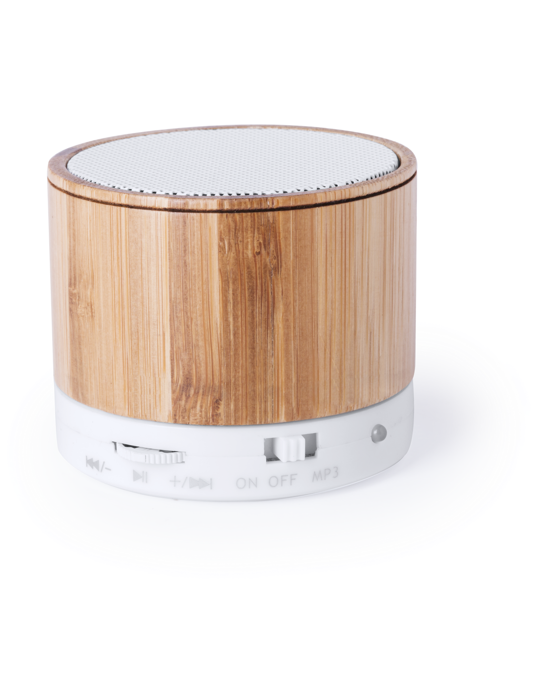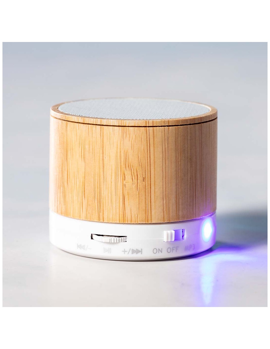 Compacto altavoz con cuerpo en bambú y conexión Bluetooth. Rejilla metálica, con 3W de potencia, función manos libres, una ranura para tarjetas mini SD, función radio FM, y base antideslizante. Recargable mediante cable USB -incluido- y presentado en una atractiva caja de diseño.