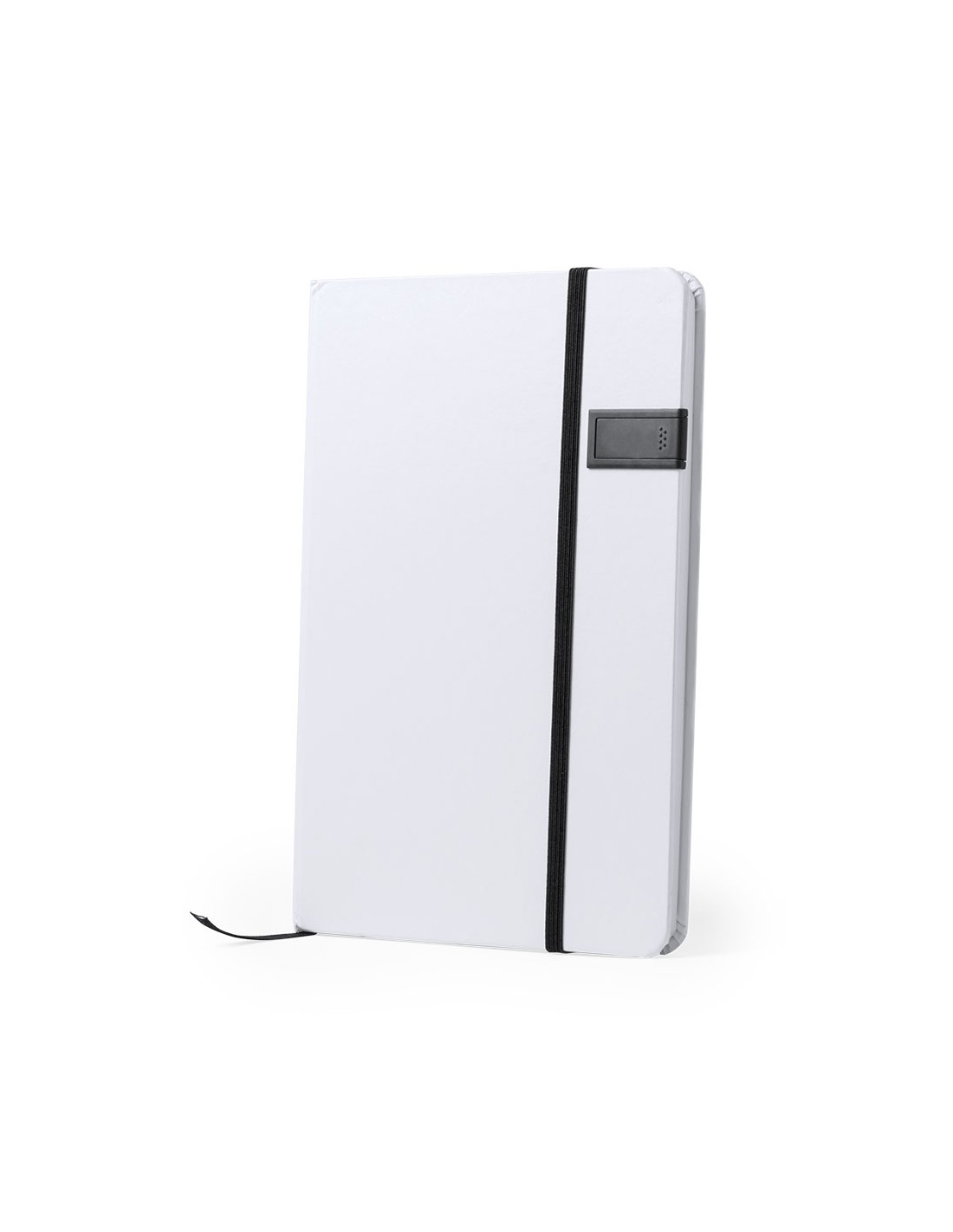 Bloc de notas de elegante acabado en color blanco, con memoria USB de 16GB de capacidad integrada en la tapa frontal. Cinta elástica, memoria USB y marcapáginas a juego, en variada gama de colores. Incluye 100 hojas con disposición a una raya.