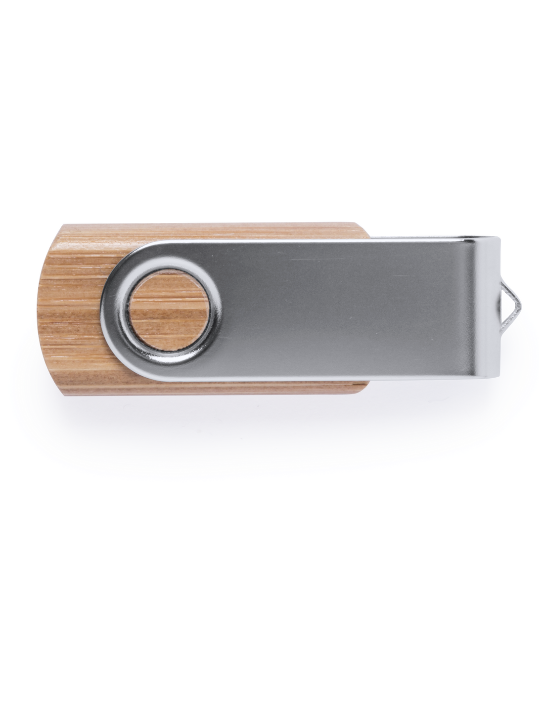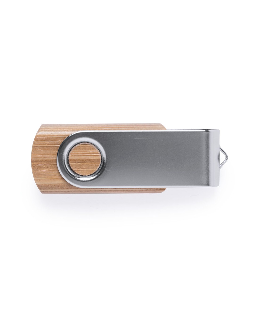 Memoria USB nature de 16GB de capacidad, con mecanismo giratorio, cuerpo acabado en madera de bambú y clip metálico. Presentada en estuche individual de cartón reciclado.