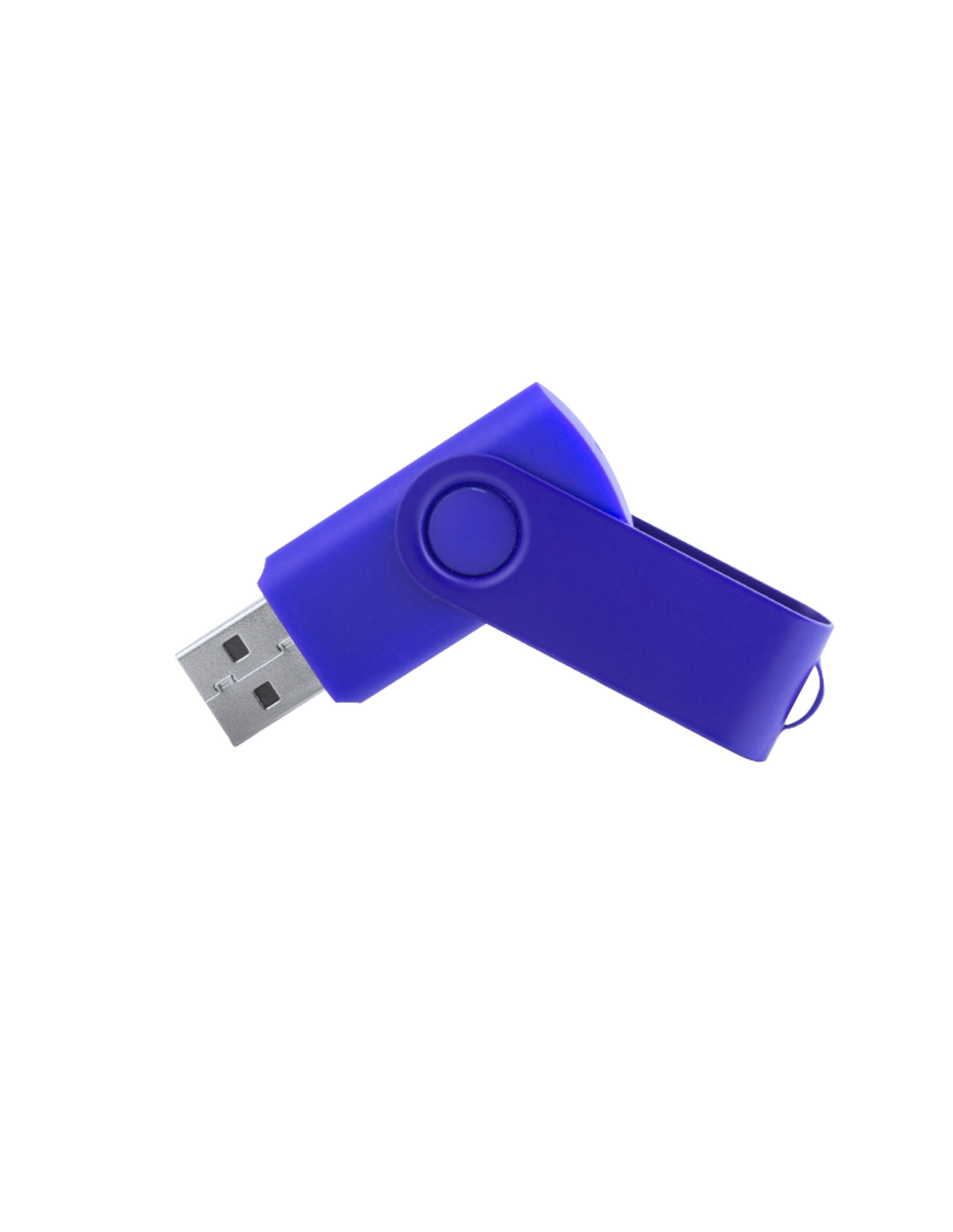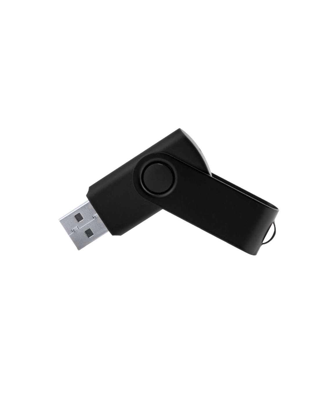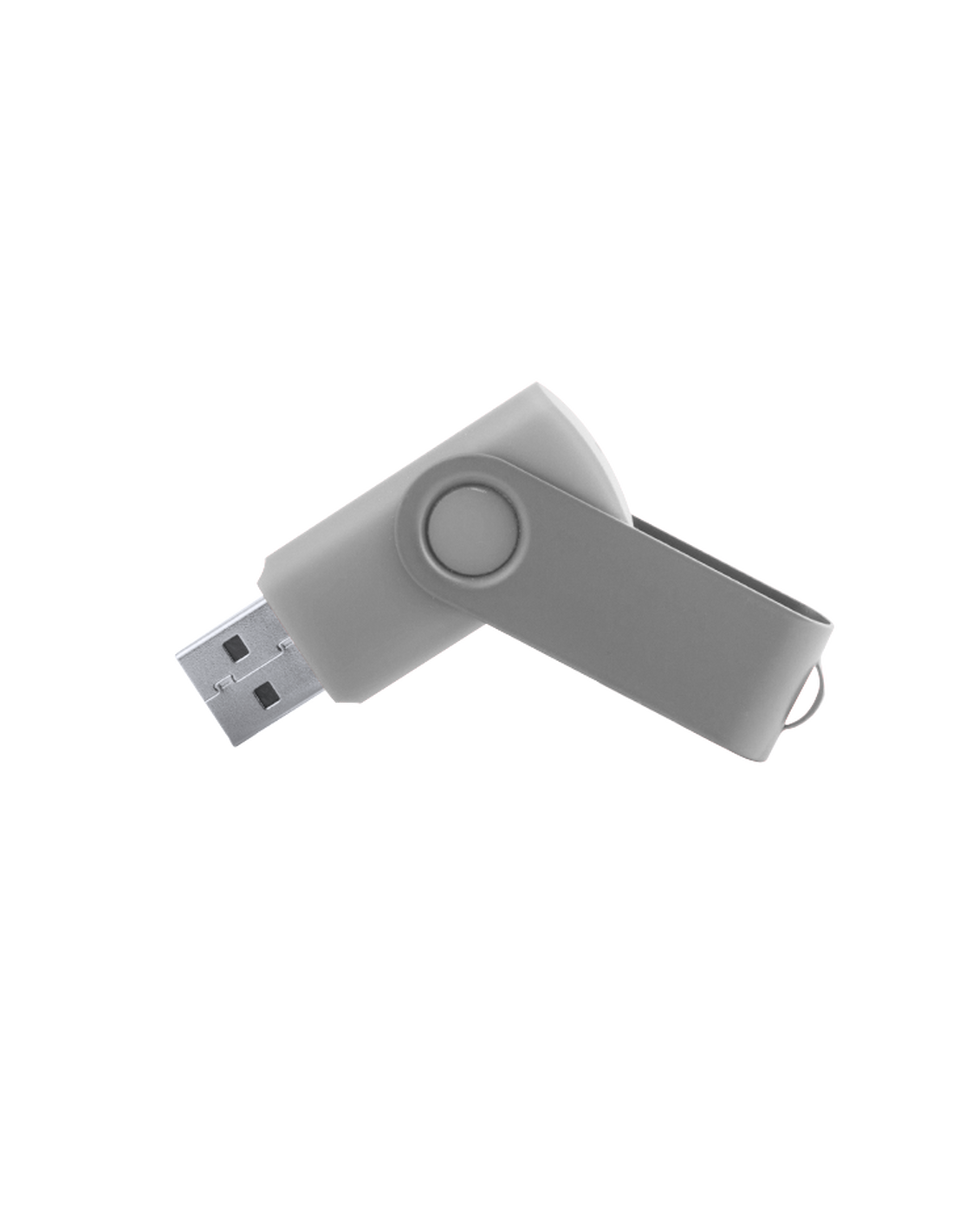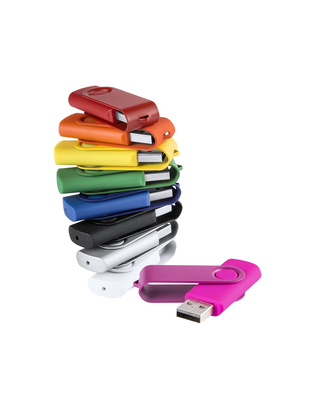 Memoria USB de 16GB de capacidad, con mecanismo giratorio, cuerpo de suave acabado y clip metálico a juego en acabado brillante. Presentada en estuche individual.