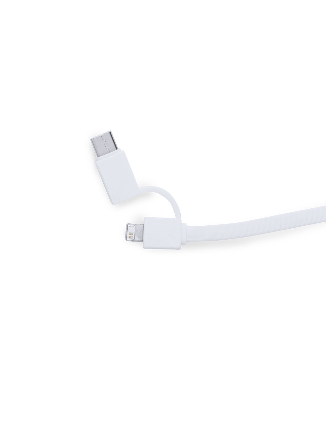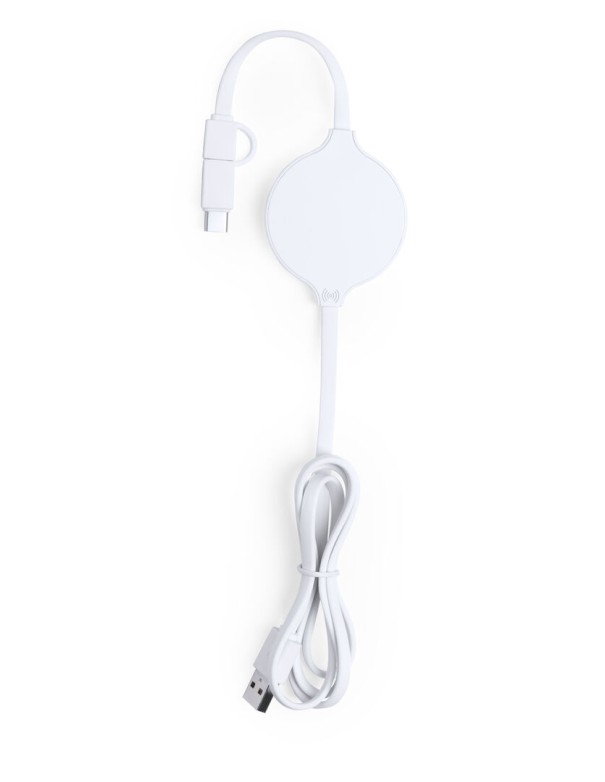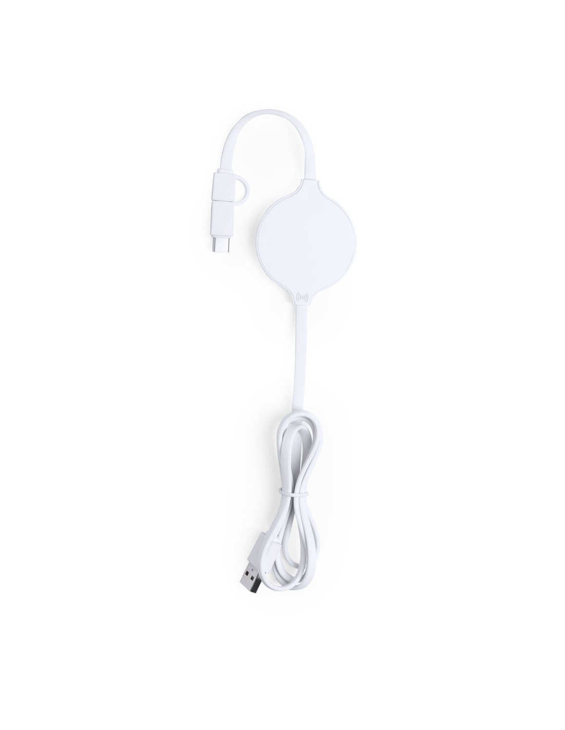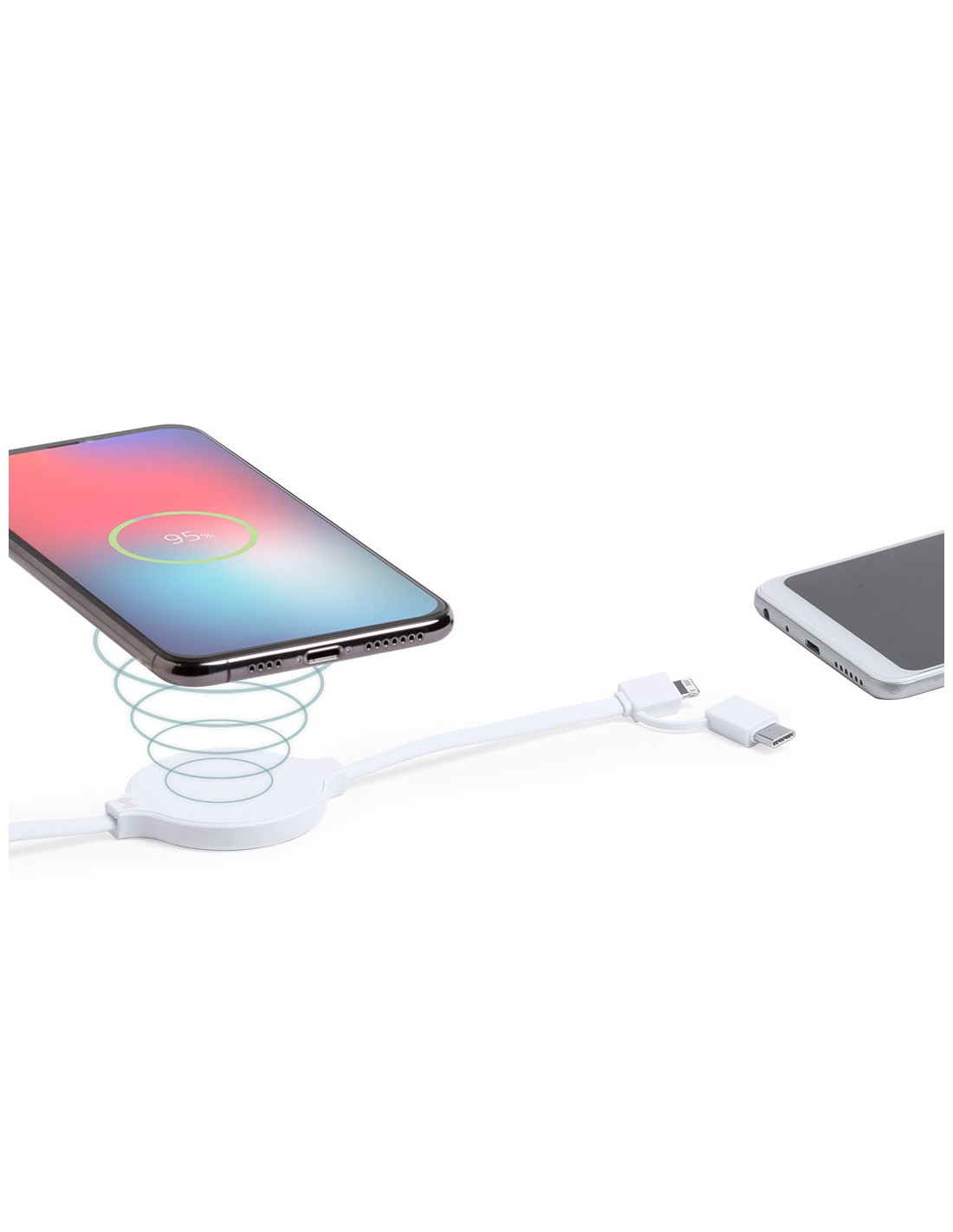 Cargador inalámbrico de diseño ultra compacto en diseño monocolor blanco. Conexión dual micro USB y Lightning, con adaptador Tipo C y luz indicadora de carga. Compatible con dispositivos equipados con tecnología de carga inalámbrica.