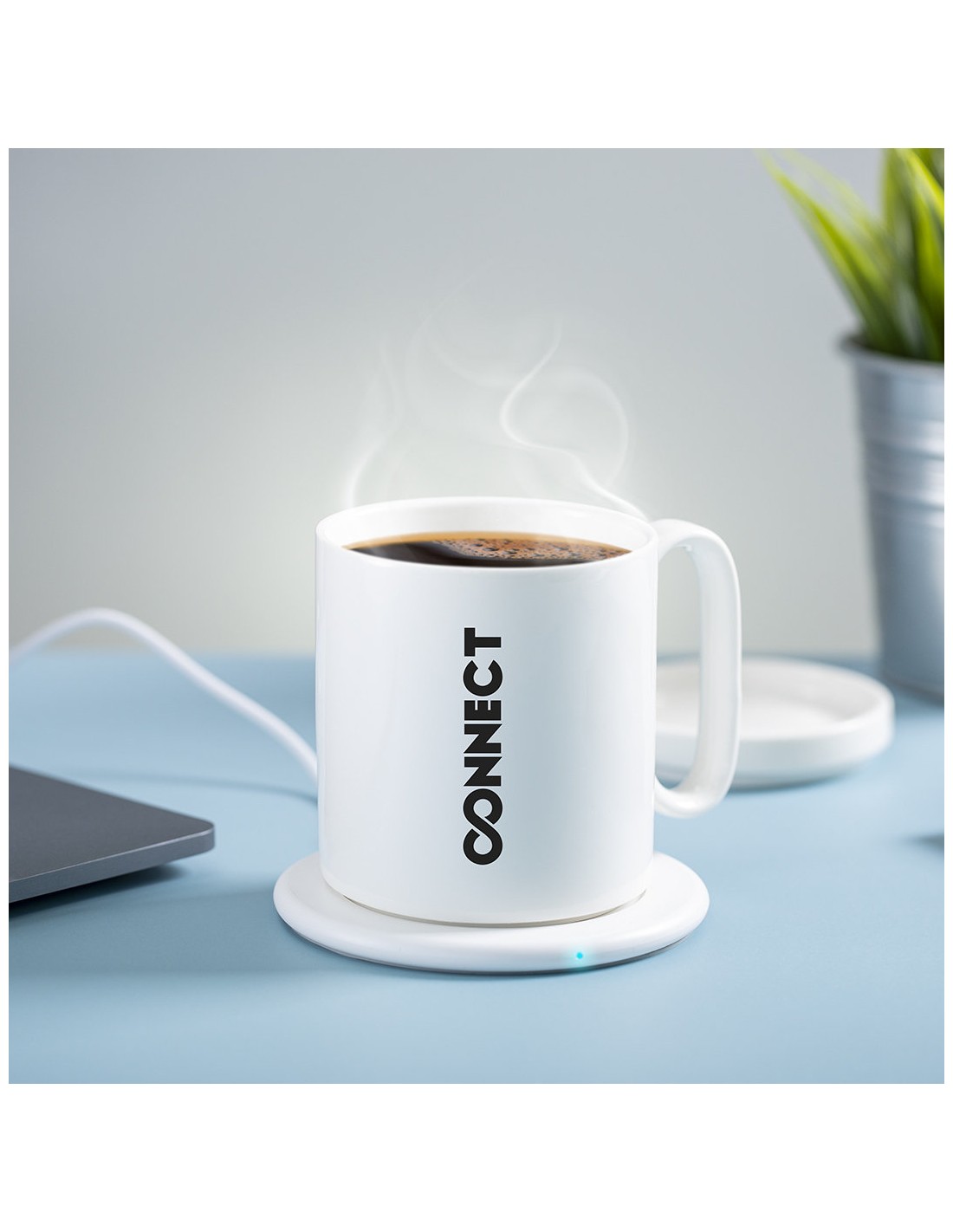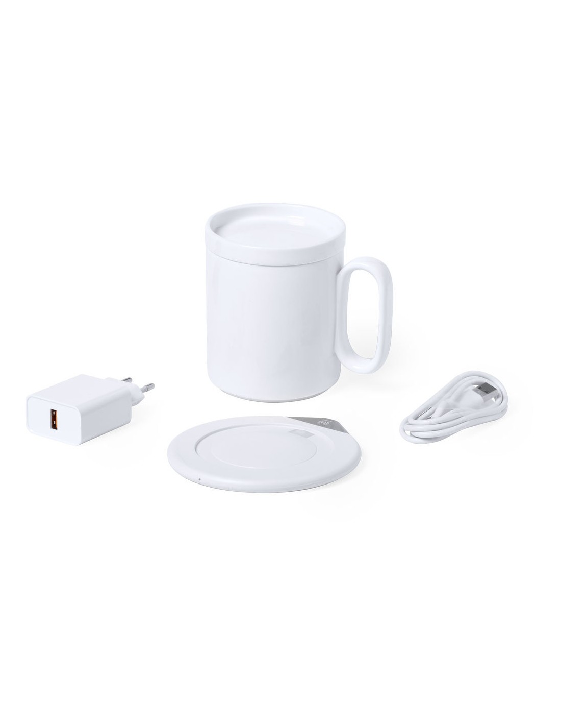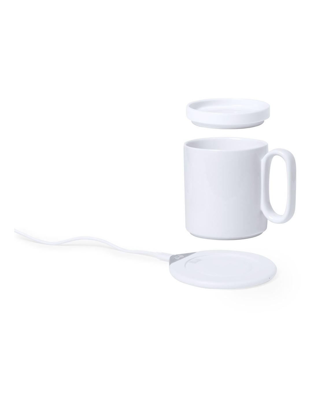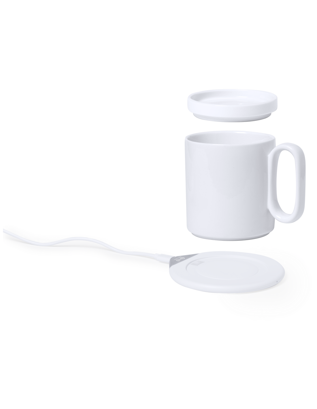 Calentador de tazas con cargador inalámbrico integrado de carga rápida -10W-. Con taza de cerámica de 350 ml, especialmente diseñada para calentar y mantener la temperatura de la bebida, con tapa a juego. Incluye cargador de pared y cable de carga Tipo C. Set presentado en atractiva caja de diseño.