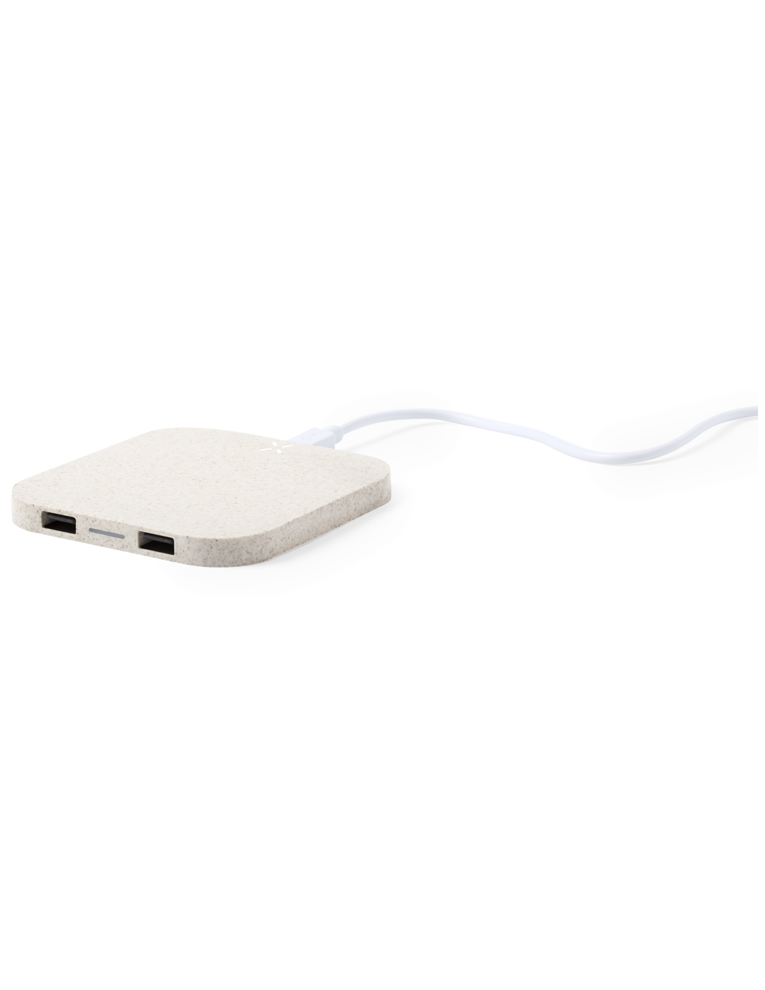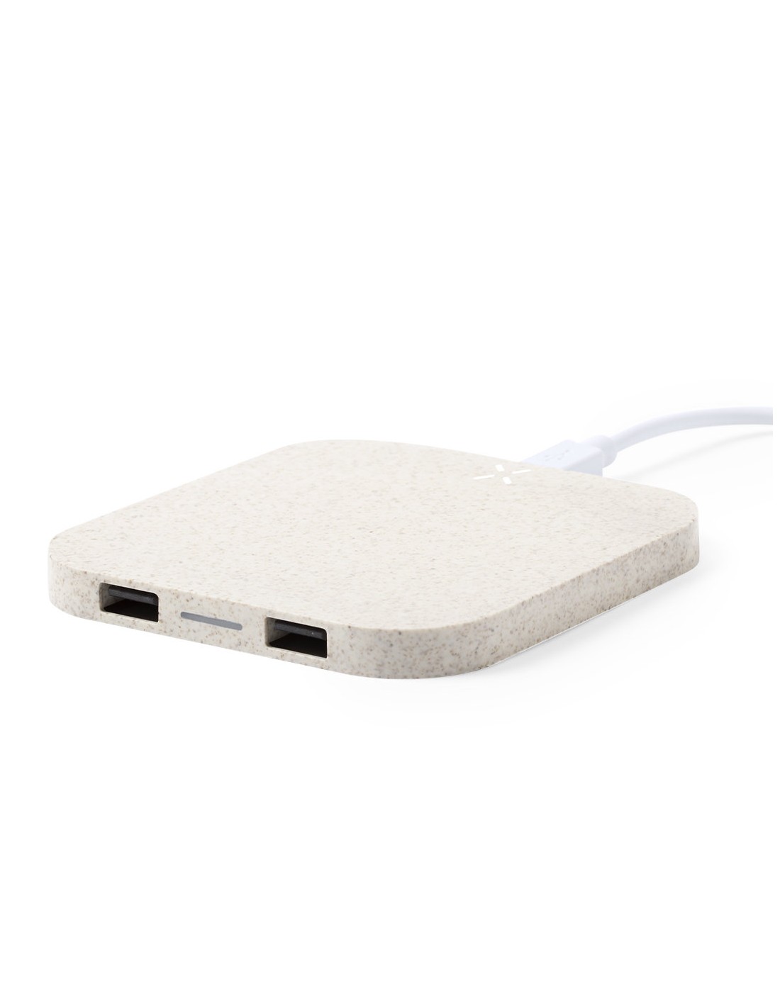 Cargador inalámbrico de línea nature. Carcasa en caña de trigo, para así fomentar la utilización de materias primas naturales y reducir las emisiones contaminantes. Con salida USB dual de 2.100 mA de capacidad para carga simultánea de hasta 3 dispositivos (1 por carga inalámbrica y 2 por cable). Base antideslizante y compatible con dispositivos equipados con tecnología de carga inalámbrica. Presentado en atractiva caja de diseño eco.