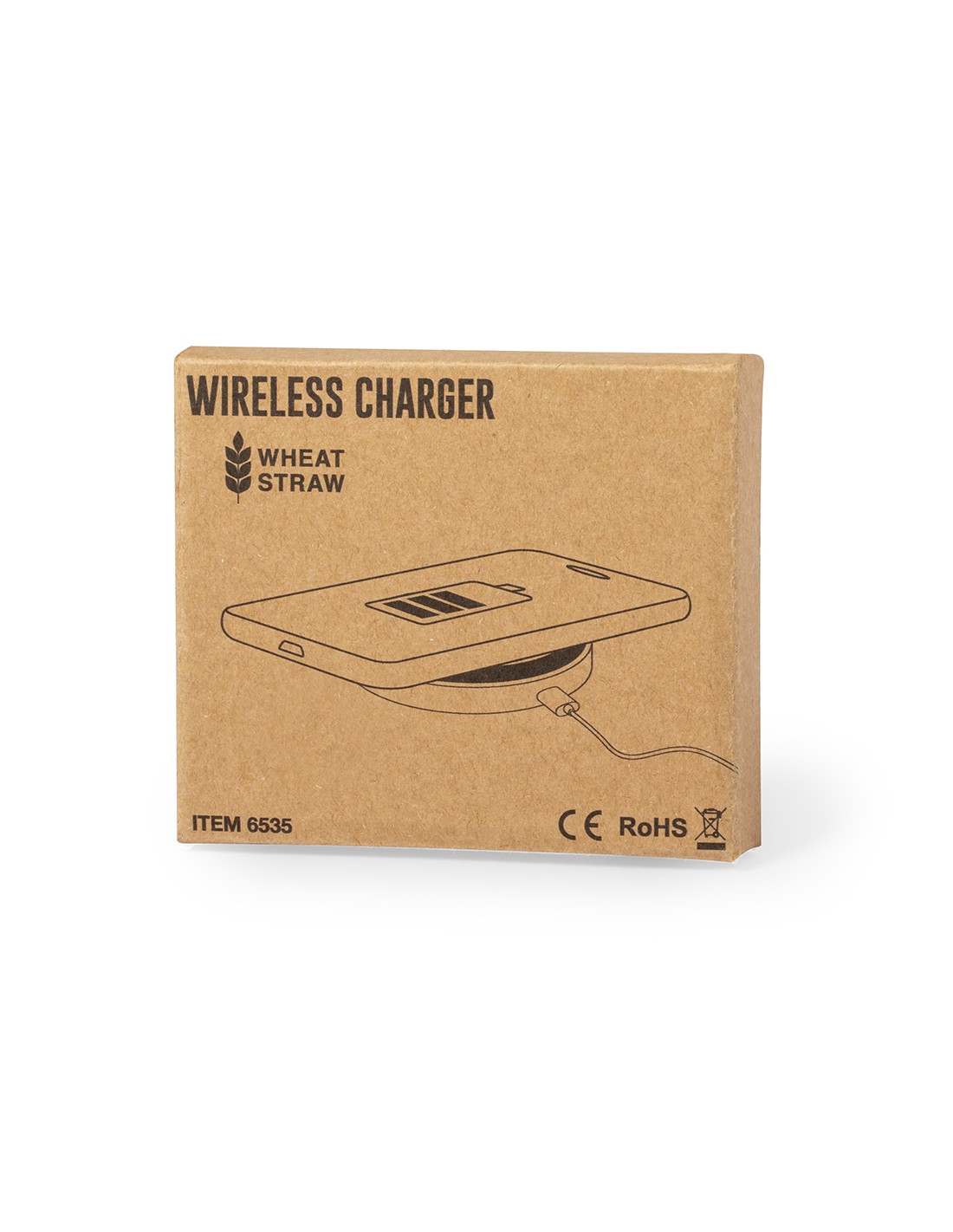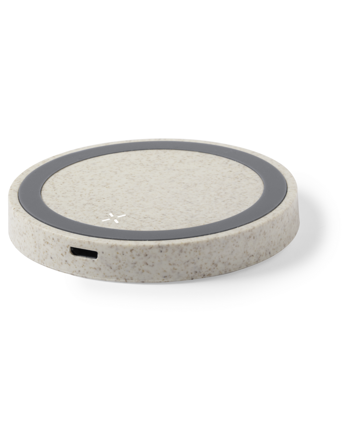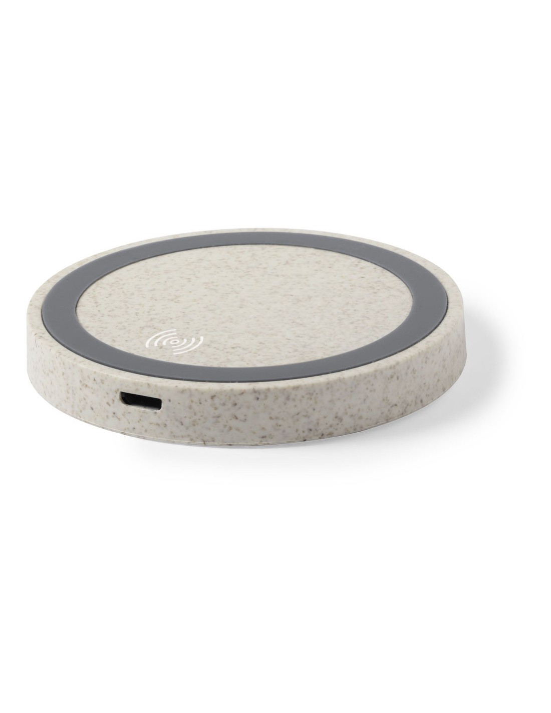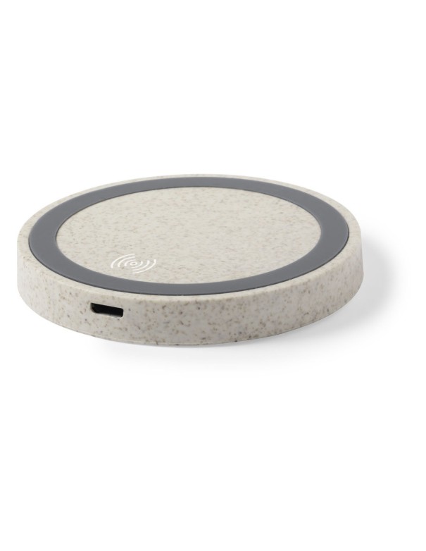 Cargador inalámbrico circular de línea nature. Carcasa en caña de trigo, para así fomentar la utilización de materias primas naturales y reducir las emisiones contaminantes. Con base antideslizante e indicador LED de estado de carga. Compatible con smartphones con tecnología de carga inalámbrica y presentado en atractiva caja de diseño eco.