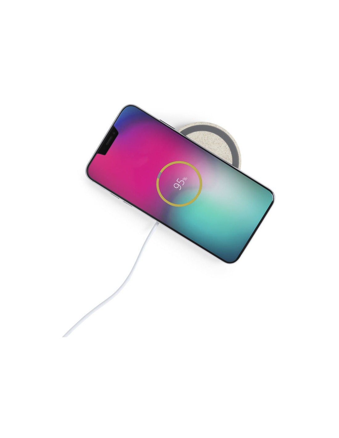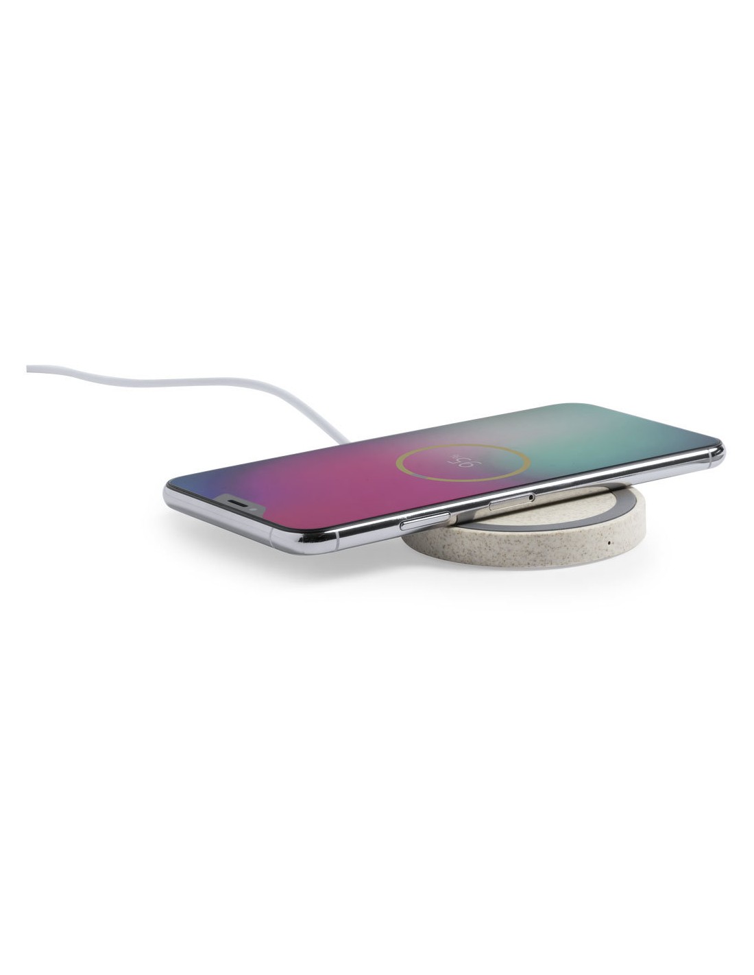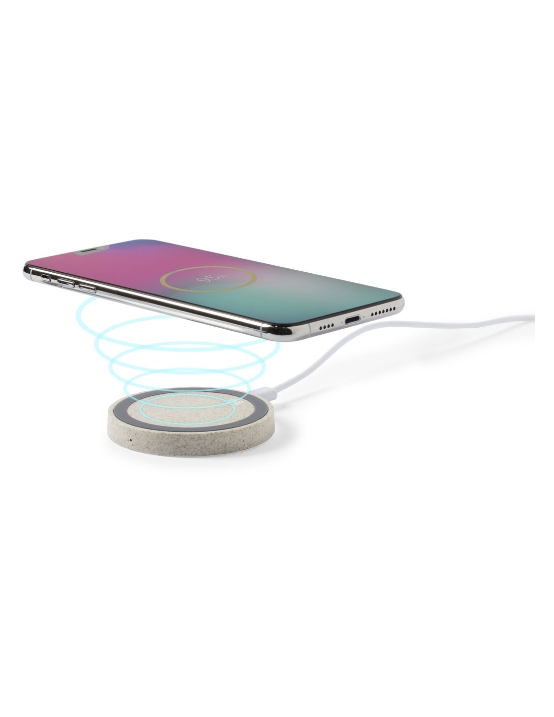 Cargador inalámbrico circular de línea nature. Carcasa en caña de trigo, para así fomentar la utilización de materias primas naturales y reducir las emisiones contaminantes. Con base antideslizante e indicador LED de estado de carga. Compatible con smartphones con tecnología de carga inalámbrica y presentado en atractiva caja de diseño eco.