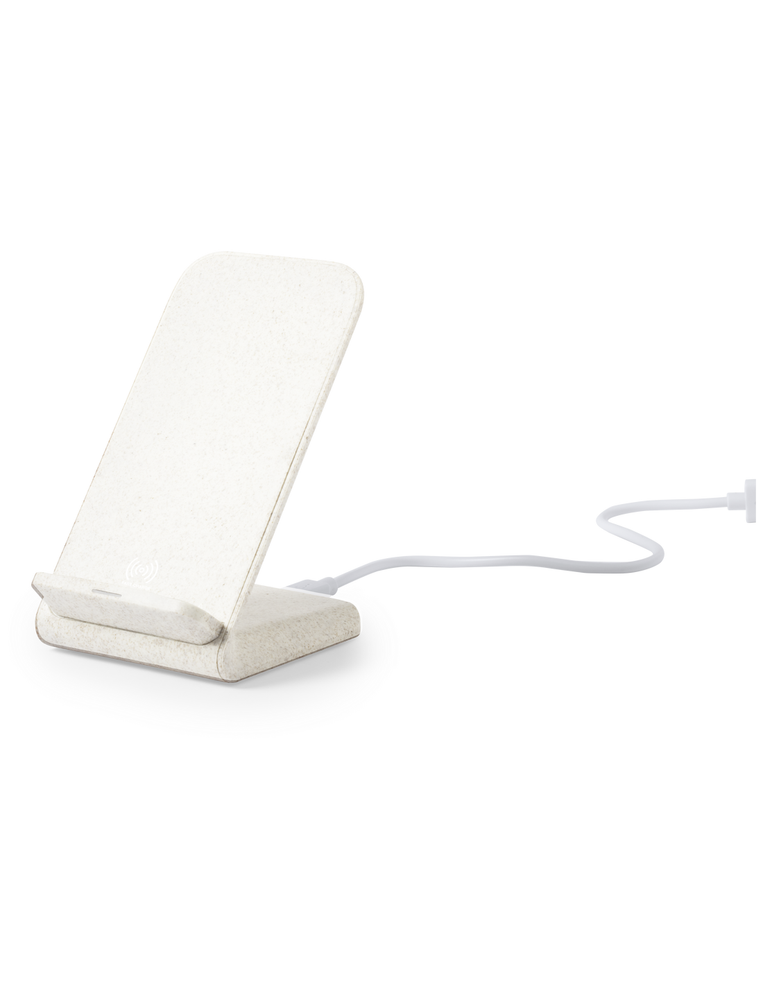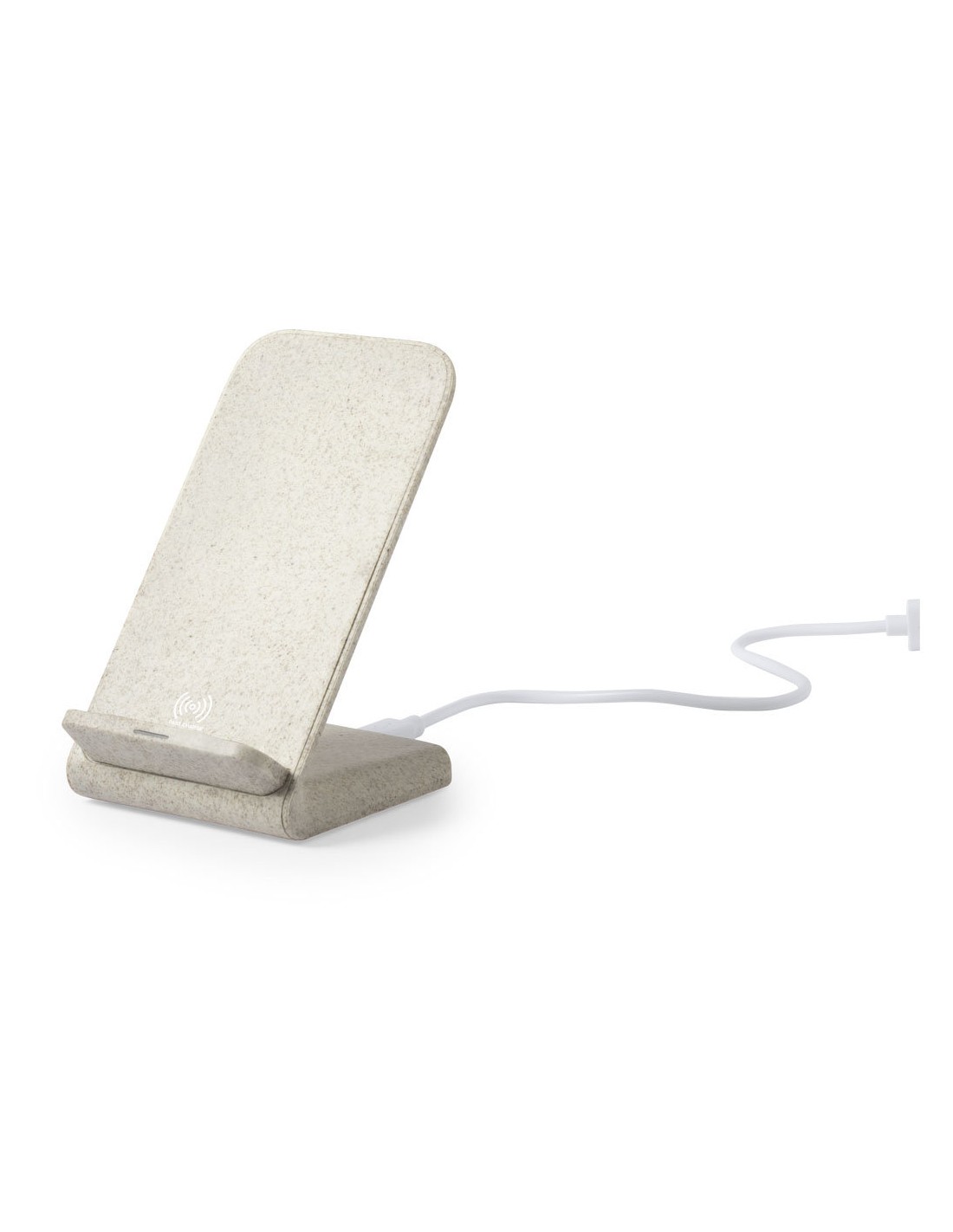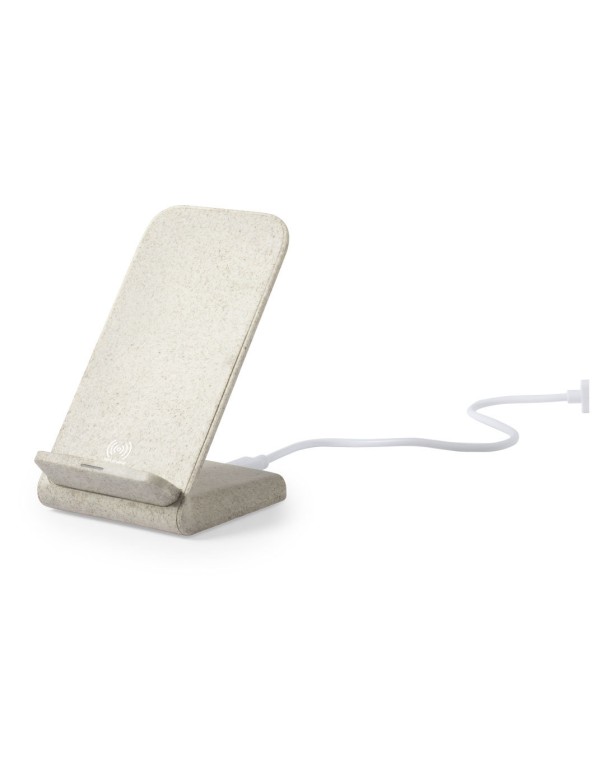 Cargador inalámbrico de línea nature con función soporte para móvil. Carcasa en caña de trigo, para así fomentar la utilización de materias primas naturales y reducir las emisiones contaminantes. Con función carga rápida de 10W y compatible con dispositivos equipados con tecnología de carga inalámbrica. Con luz indicadora de estado de carga y cable de 100 cm. Amplia superficie de marcaje, presentado en atractiva caja de diseño eco.