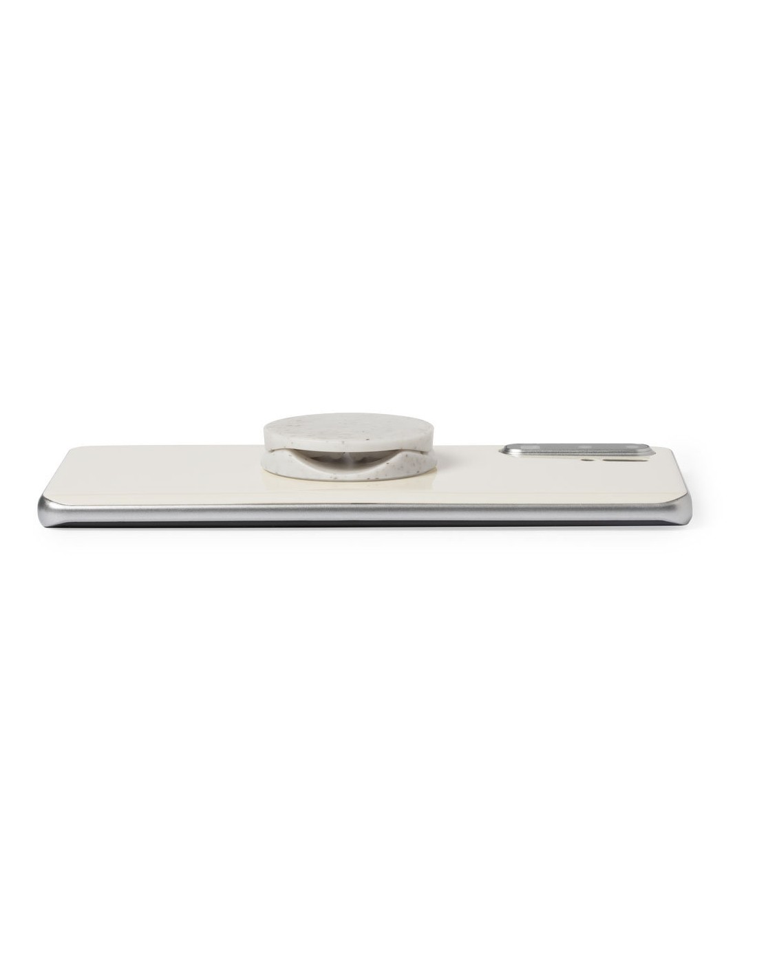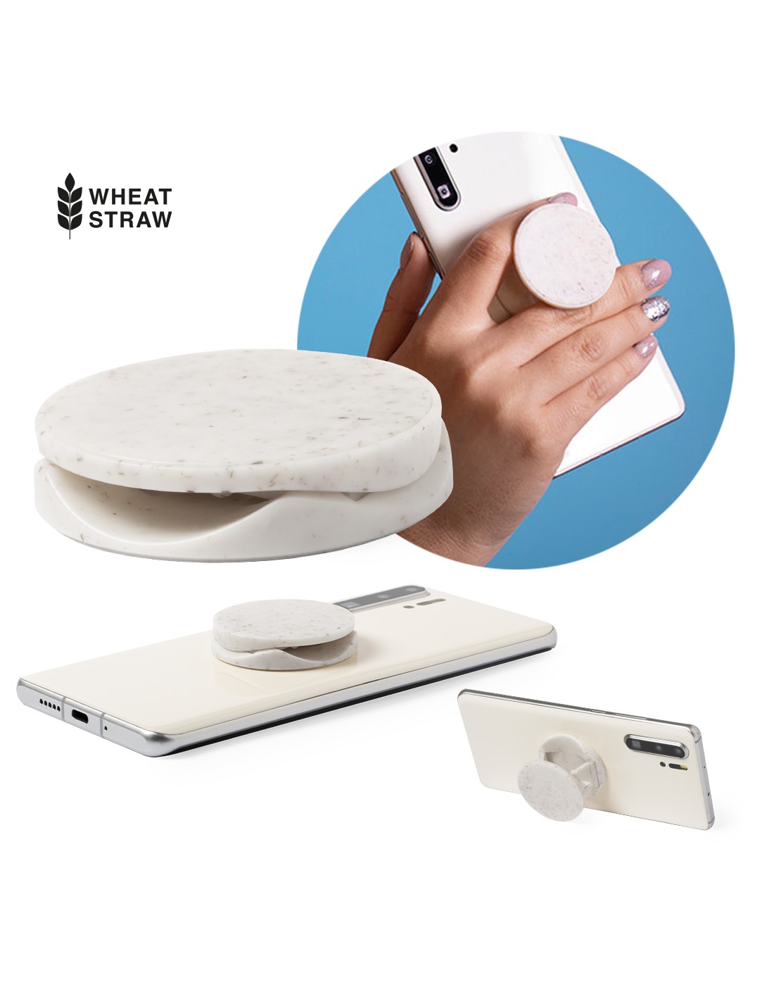 Soporte para smartphone plegable en línea nature, fabricado en caña de trigo, para así fomentar la utilización de materias primas naturales y reducir las emisiones contaminantes. Especialmente diseñado para marcaje en tampografía, con adhesivo 3M de fijación extra fuerte y libre de residuos al despegarlo del dispositivo.