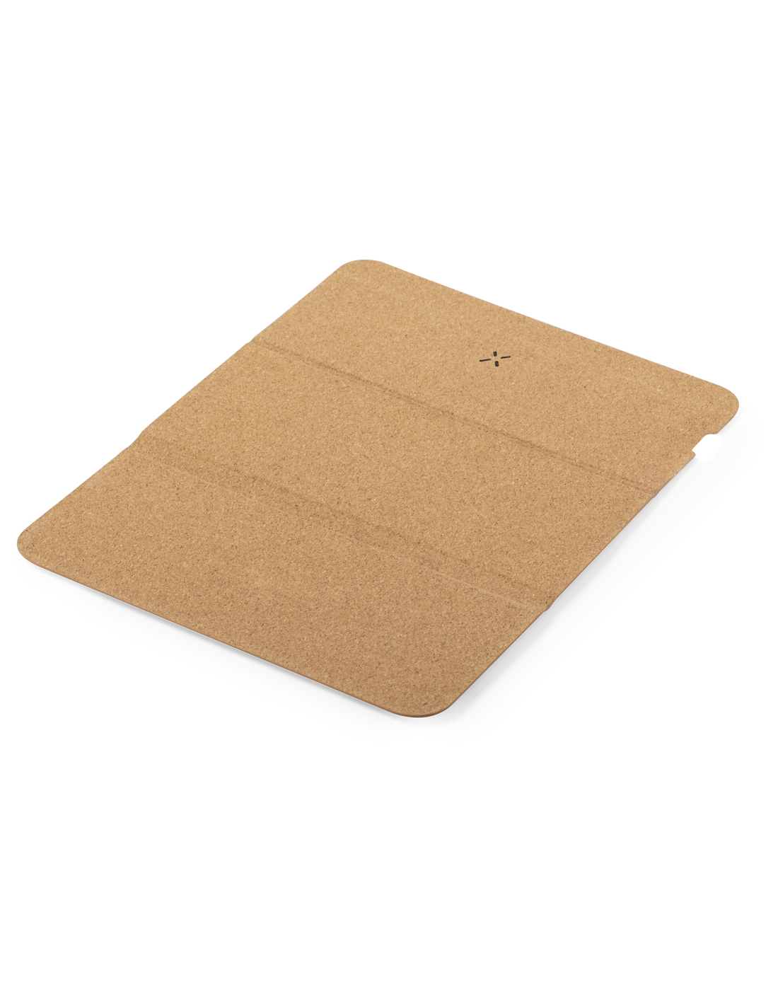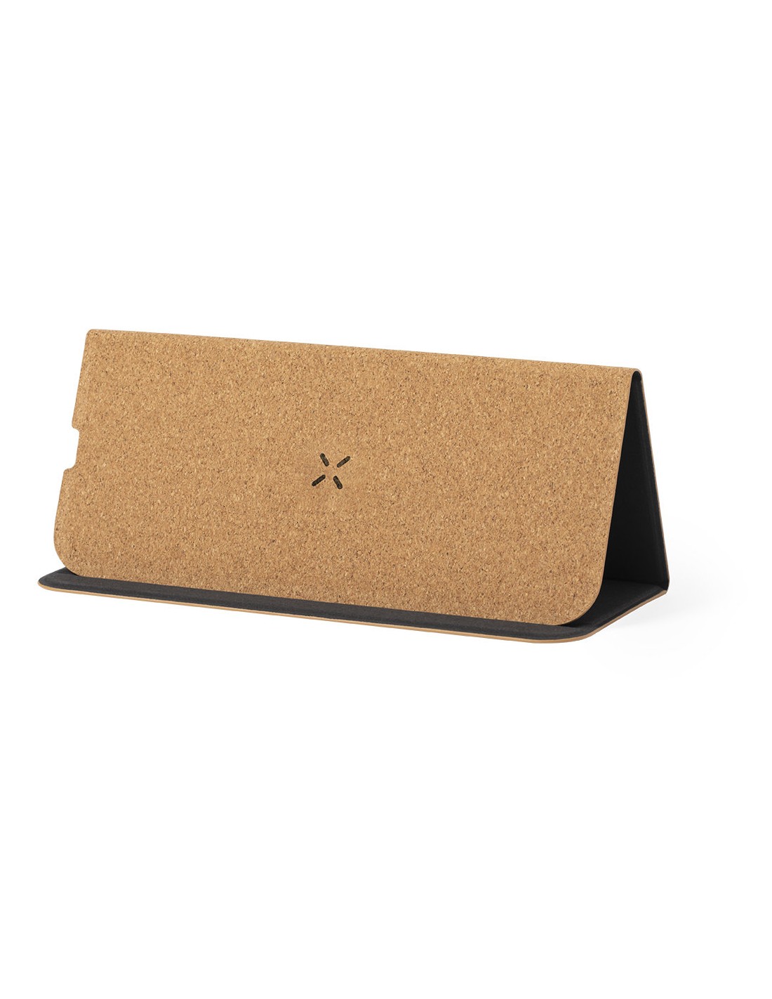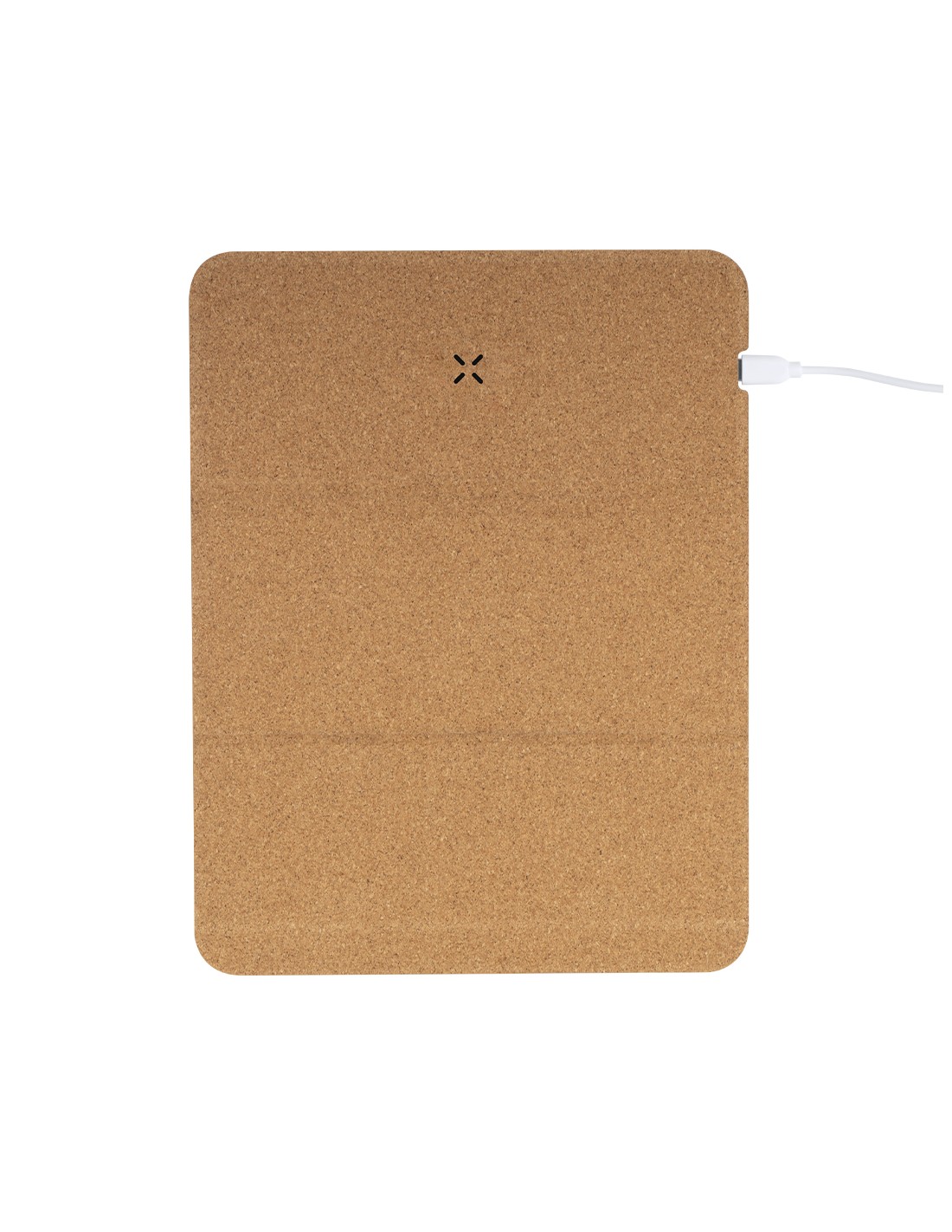 Alfombrilla de línea nature en corcho natural. Con cargador inalámbrico integrado -cable Tipo C incluido-, base antideslizante y soporte para móvil integrado. Compatible con dispositivos equipados con tecnología de carga inalámbrica y presentada en atractiva caja de diseño eco.