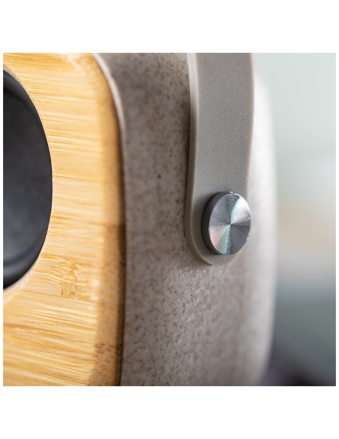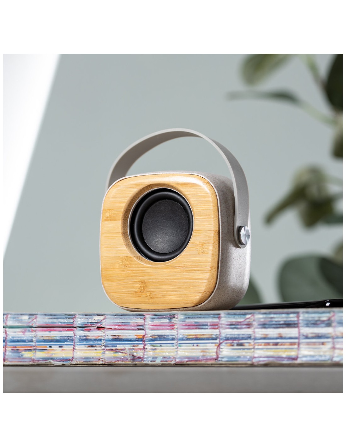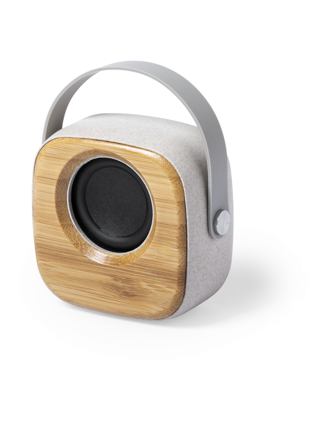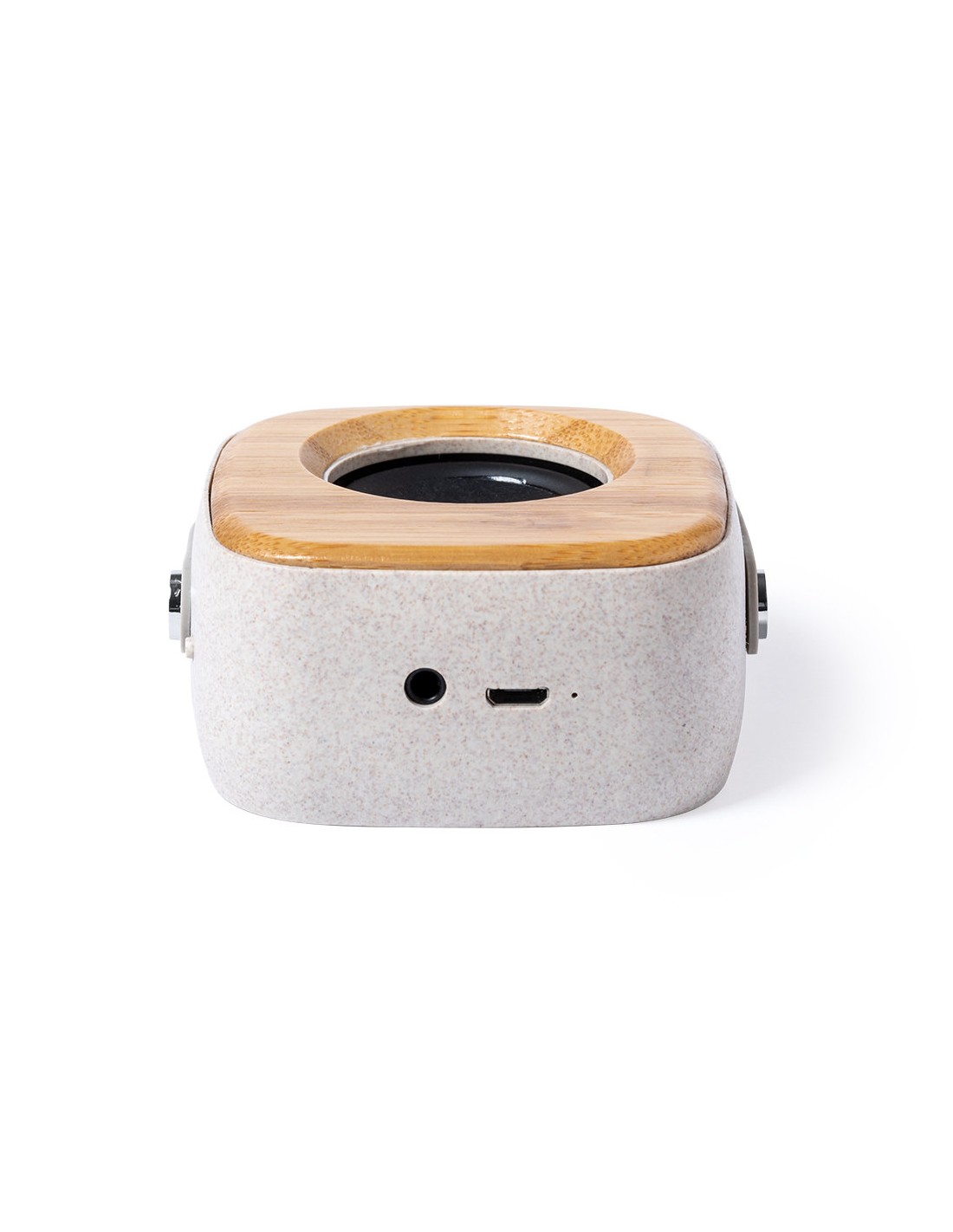 Altavoz Bluetooth en combinación de piezas de bambú de corte nature y carcasa en caña de trigo, para así fomentar la utilización de materias primas naturales y reducir las emisiones contaminantes. De tamaño compacto y con práctica asa de transporte en suave silicona, se convierte en un complemento perfecto para el smartphone. Conexión Bluetooth 5.0 y 3W de potencia, con entrada de línea jack 3,5mm (cable incluido). Compatible con iOS y Android, incluye cable de carga micro USB y viene presentado en atractiva caja de diseño. Disponible manual de instrucciones español e inglés.