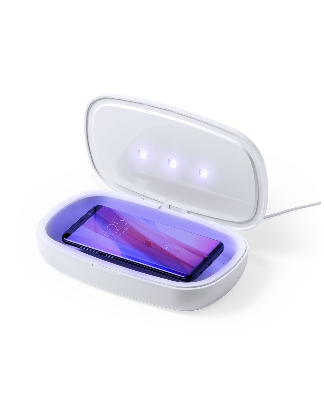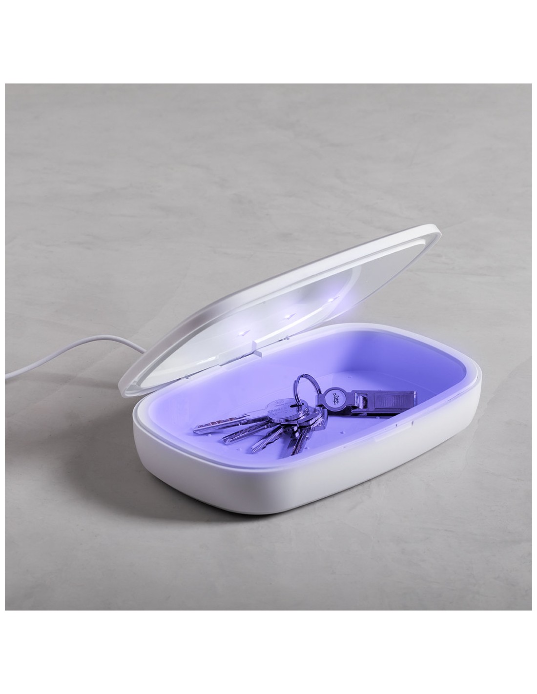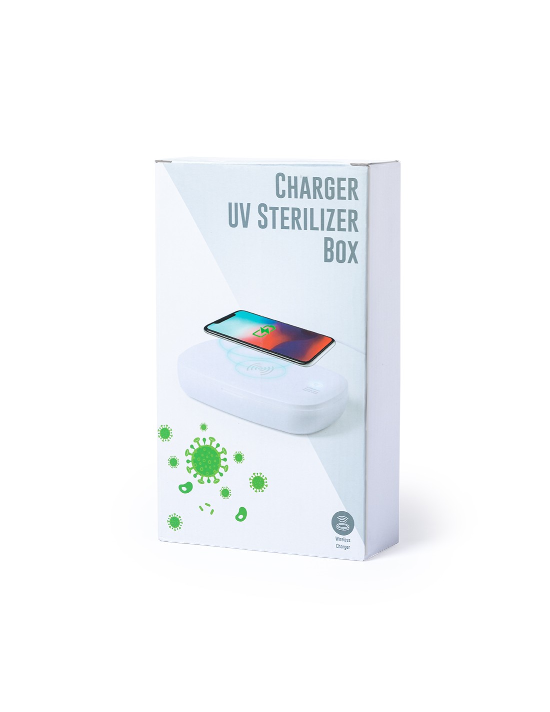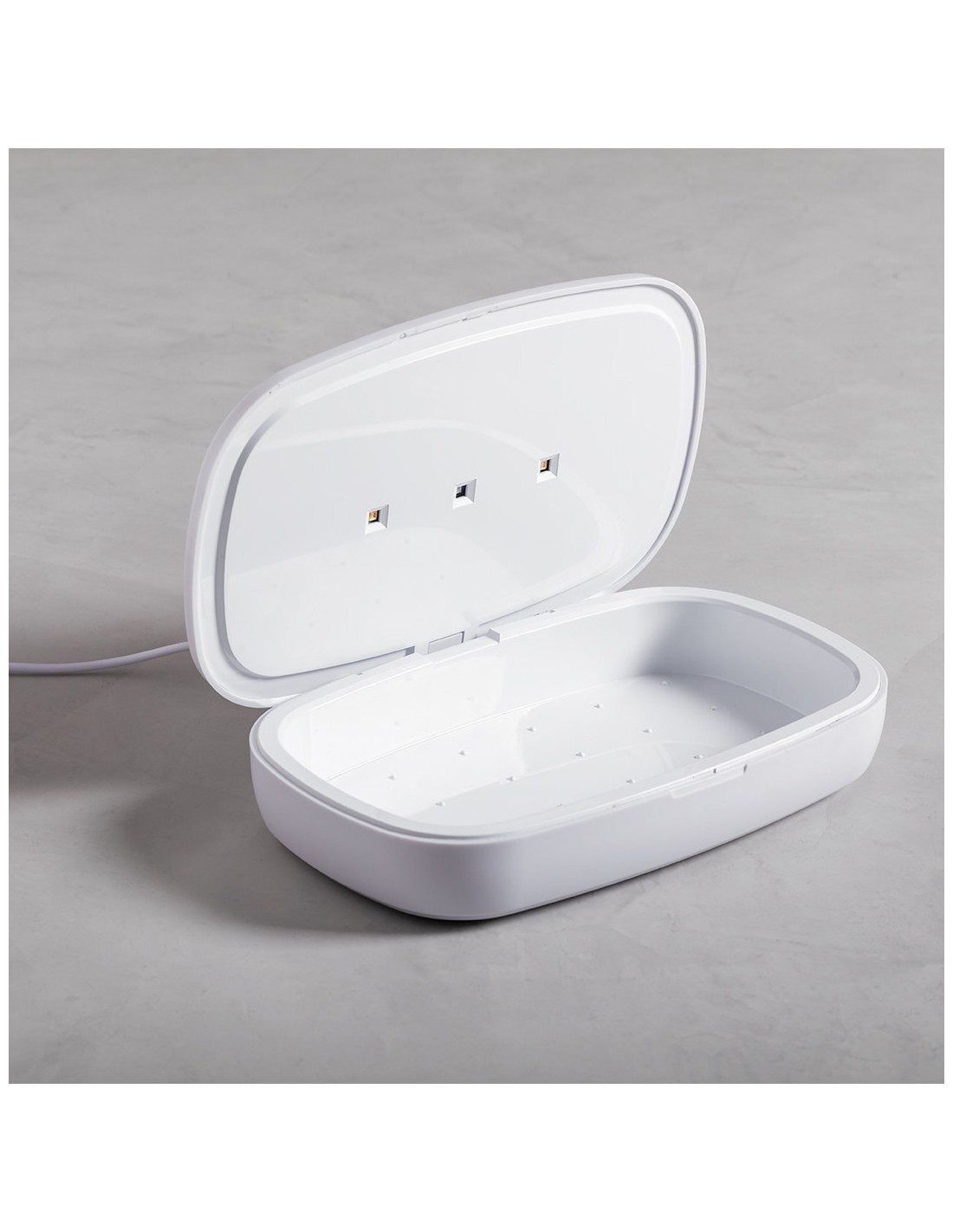 Caja esterilizadora de luz ultravioleta tipo C, con cargador inalámbrico para smartphone integrado en tapa. Especialmente diseñada para la eliminación de microorganismos y bacterias en objetos de uso cotidiano como el smartphone, llaves, gafas, mascarilla, auriculares, smartwatch... Fabricada en resistente material ABS de acabado mate y presentada en atractiva caja individual de diseño. Fácil de usar, basta con introducir el objeto dentro de la caja. Potencia de bombilla 1W longitud de onda de 270-280 nm, con alimentación mediante cable USB Tipo C de 1m de largo con color a juego. Tiempo de esterilización de 5 y 10 minutos con función auto-apagado. Disponible manual de usuario en español e inglés. Disponible certificación CE, RoHS y de efectividad germicida. Para un uso adecuado del producto, evitar el contacto con la piel y los ojos.