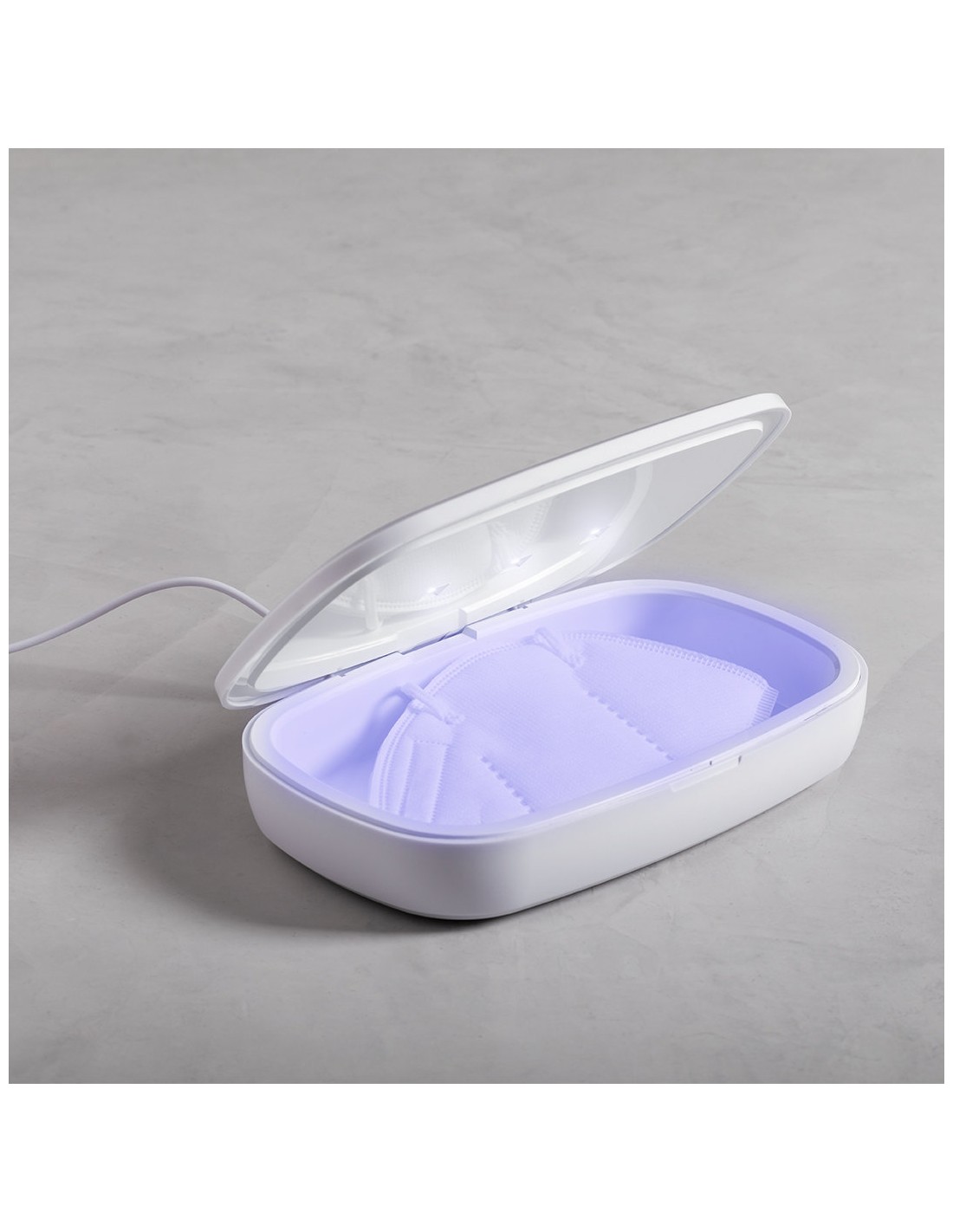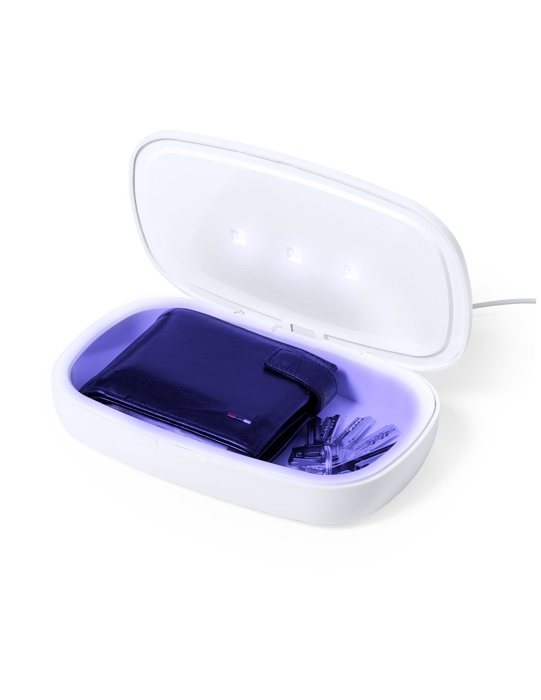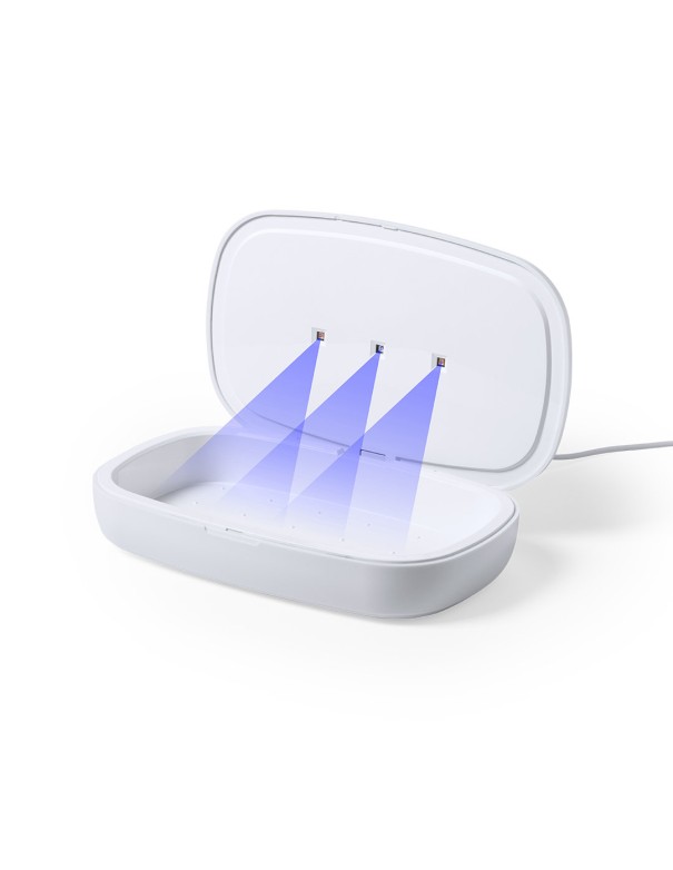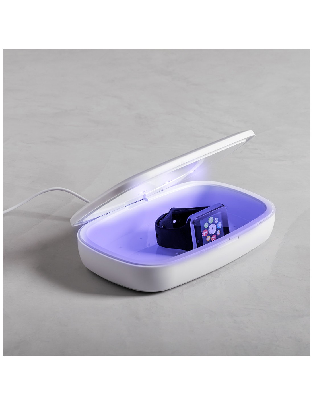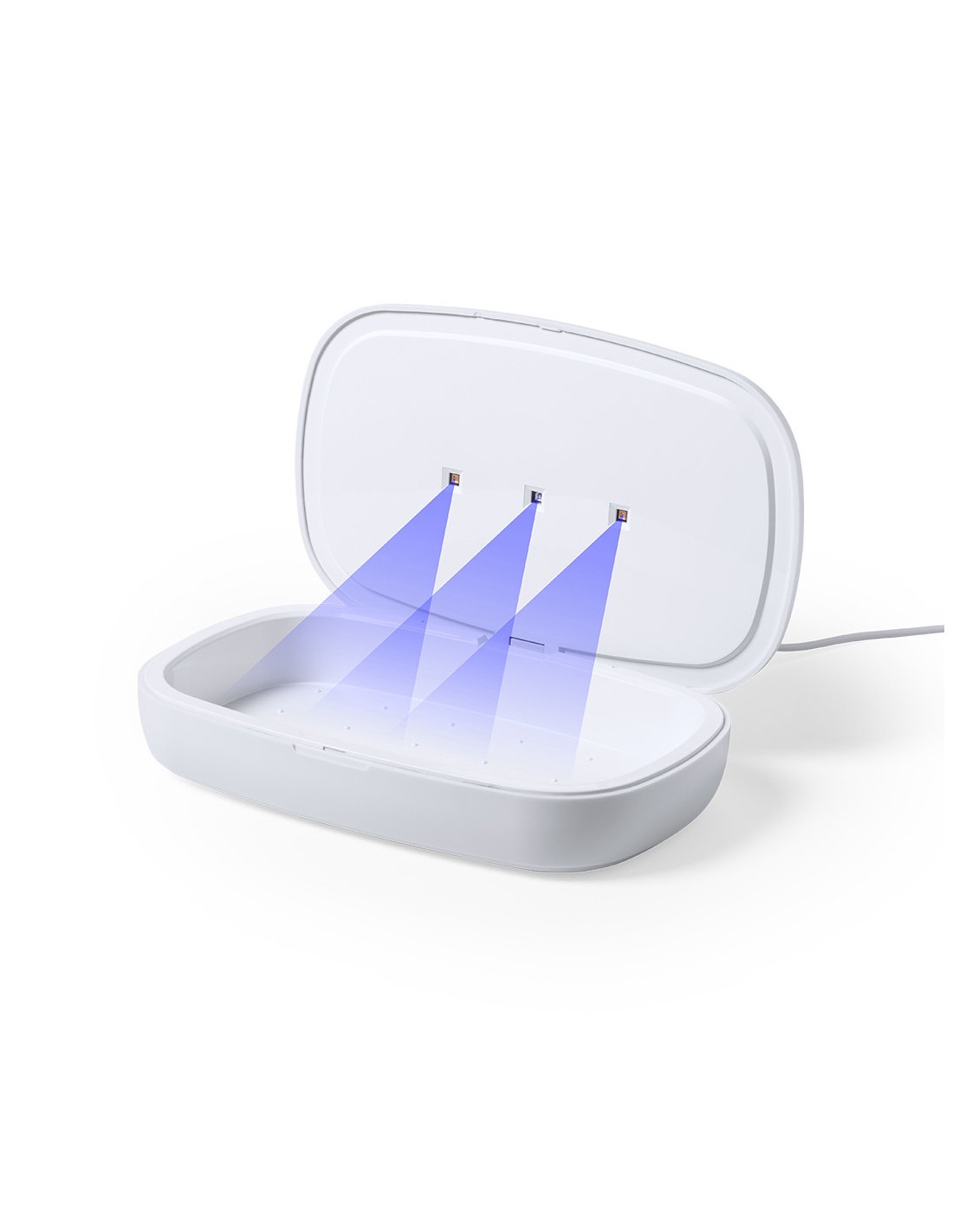 Caja esterilizadora de luz ultravioleta tipo C, con cargador inalámbrico para smartphone integrado en tapa. Especialmente diseñada para la eliminación de microorganismos y bacterias en objetos de uso cotidiano como el smartphone, llaves, gafas, mascarilla, auriculares, smartwatch... Fabricada en resistente material ABS de acabado mate y presentada en atractiva caja individual de diseño. Fácil de usar, basta con introducir el objeto dentro de la caja. Potencia de bombilla 1W longitud de onda de 270-280 nm, con alimentación mediante cable USB Tipo C de 1m de largo con color a juego. Tiempo de esterilización de 5 y 10 minutos con función auto-apagado. Disponible manual de usuario en español e inglés. Disponible certificación CE, RoHS y de efectividad germicida. Para un uso adecuado del producto, evitar el contacto con la piel y los ojos.