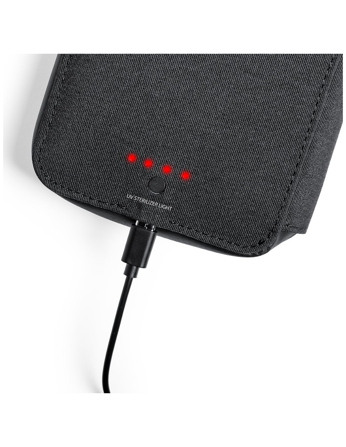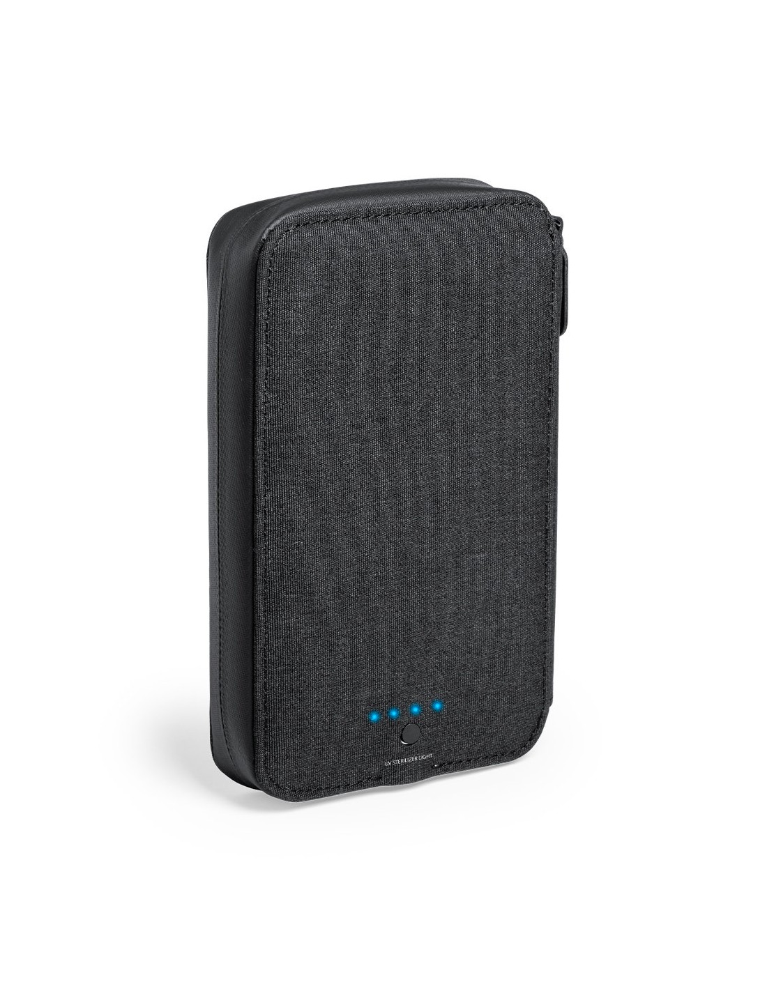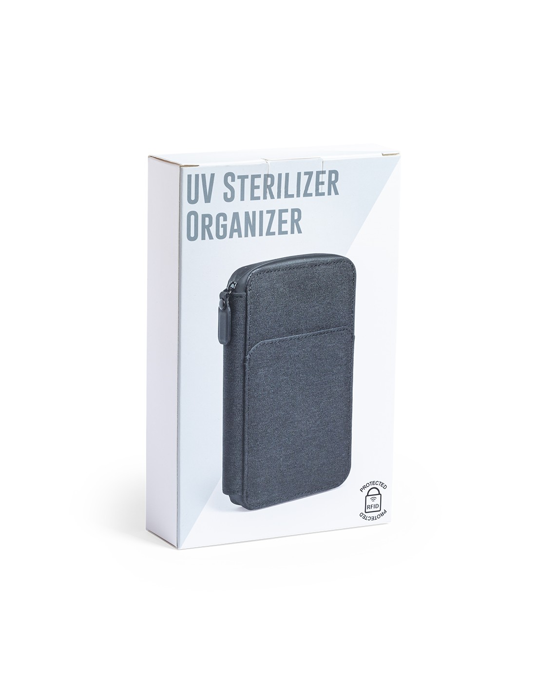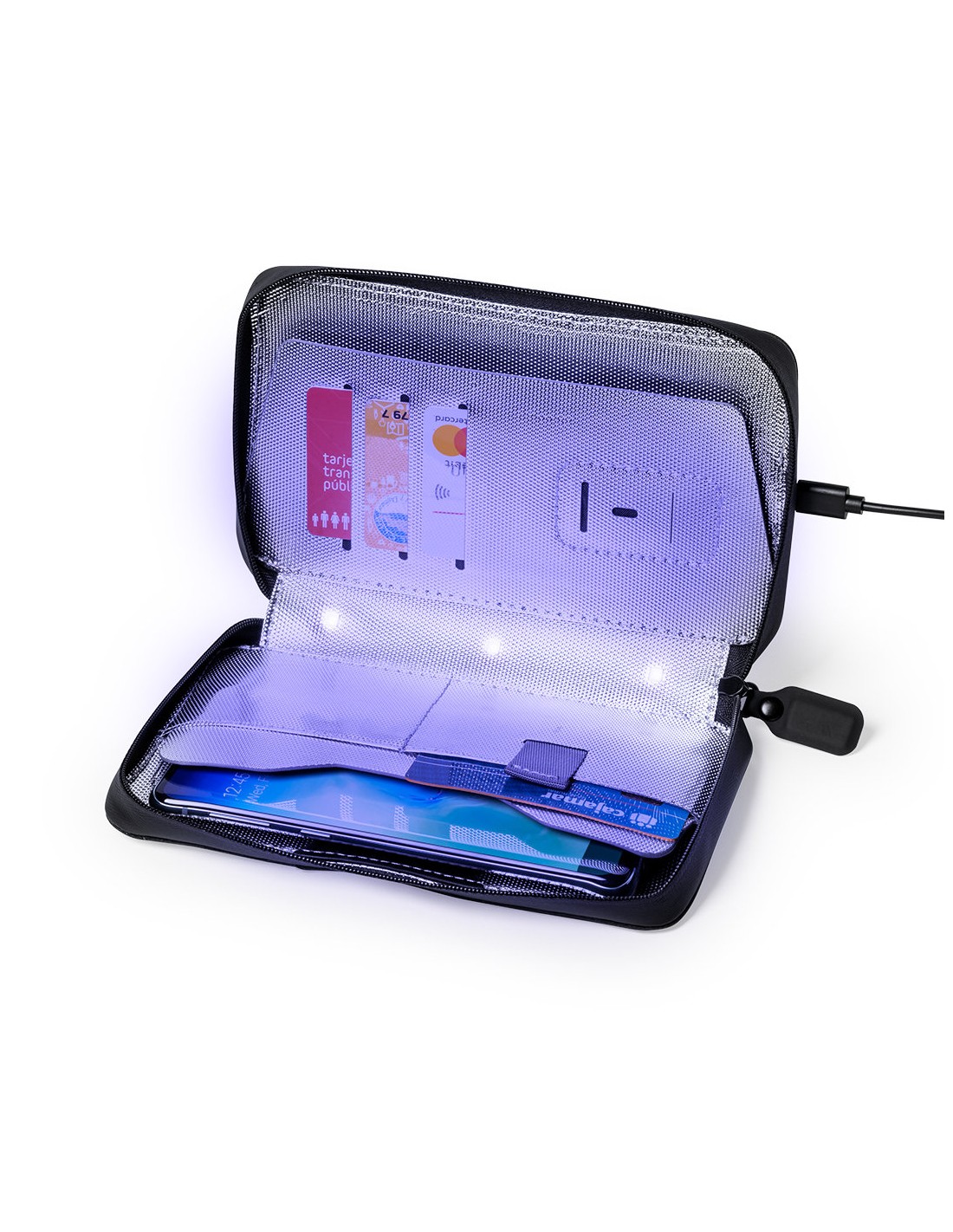 Organizador y esterilizador de luz ultravioleta tipo C, con protección RFID (Identificación por Radio Frecuencia) que mantiene seguros tus dispositivos de transmisión de identidad. Especialmente diseñado para la eliminación de microorganismos y bacterias en smartphones y otros objetos de uso cotidiano. Fabricada en resistente poliéster 600D de acabado denim, con cierre magnético de seguridad en tirador para un uso seguro del dispositivo. Incluye 4 tarjeteros interiores + bolsillo exterior. Presentado en atractiva caja individual de diseño. Potencia LED 1.2W y longitud de onda 275nm. Tiempo de esterilización con función auto-apagado de 1 y 3 minutos. Disponible manual de usuario en español e inglés. Disponible certificación CE, RoHS y de efectividad germicida. Para un uso adecuado del producto, evitar el contacto con la piel y los ojos.