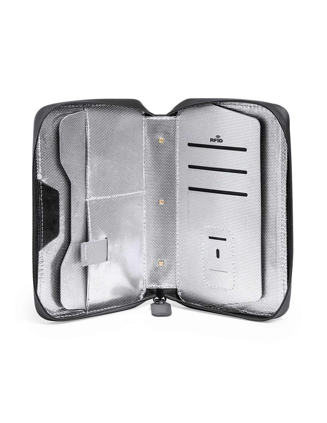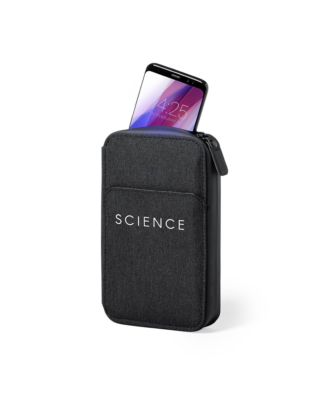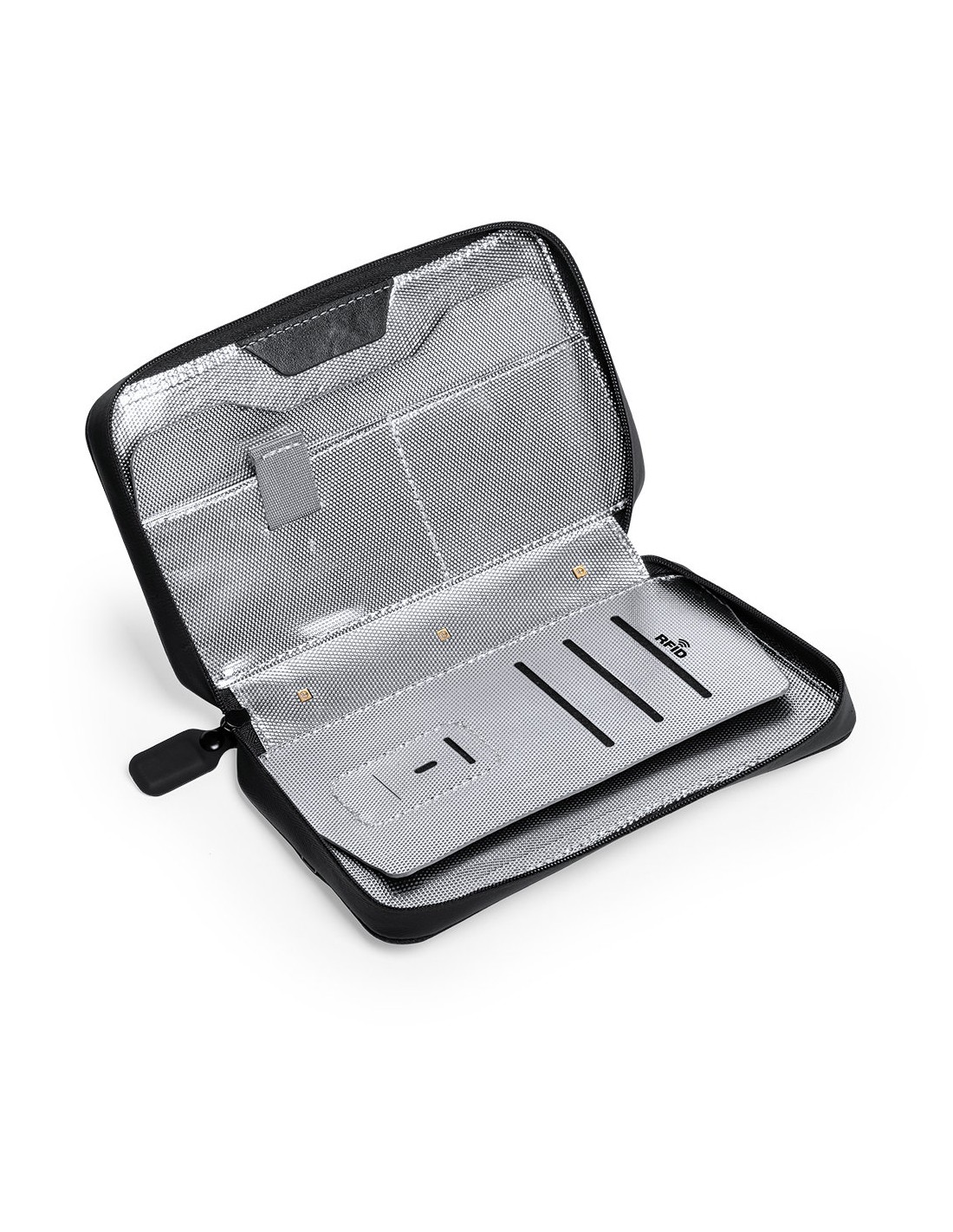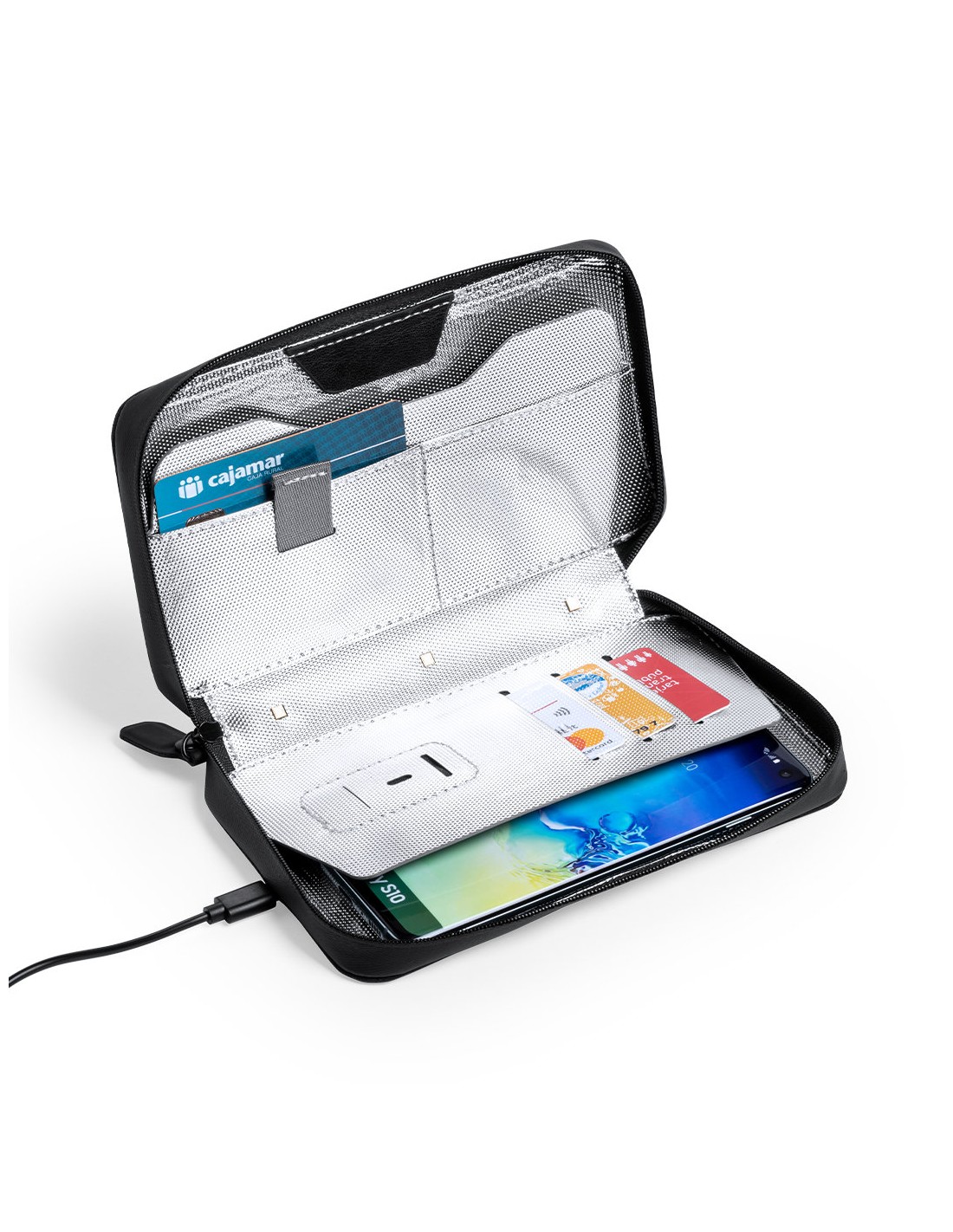 Organizador y esterilizador de luz ultravioleta tipo C, con protección RFID (Identificación por Radio Frecuencia) que mantiene seguros tus dispositivos de transmisión de identidad. Especialmente diseñado para la eliminación de microorganismos y bacterias en smartphones y otros objetos de uso cotidiano. Fabricada en resistente poliéster 600D de acabado denim, con cierre magnético de seguridad en tirador para un uso seguro del dispositivo. Incluye 4 tarjeteros interiores + bolsillo exterior. Presentado en atractiva caja individual de diseño. Potencia LED 1.2W y longitud de onda 275nm. Tiempo de esterilización con función auto-apagado de 1 y 3 minutos. Disponible manual de usuario en español e inglés. Disponible certificación CE, RoHS y de efectividad germicida. Para un uso adecuado del producto, evitar el contacto con la piel y los ojos.