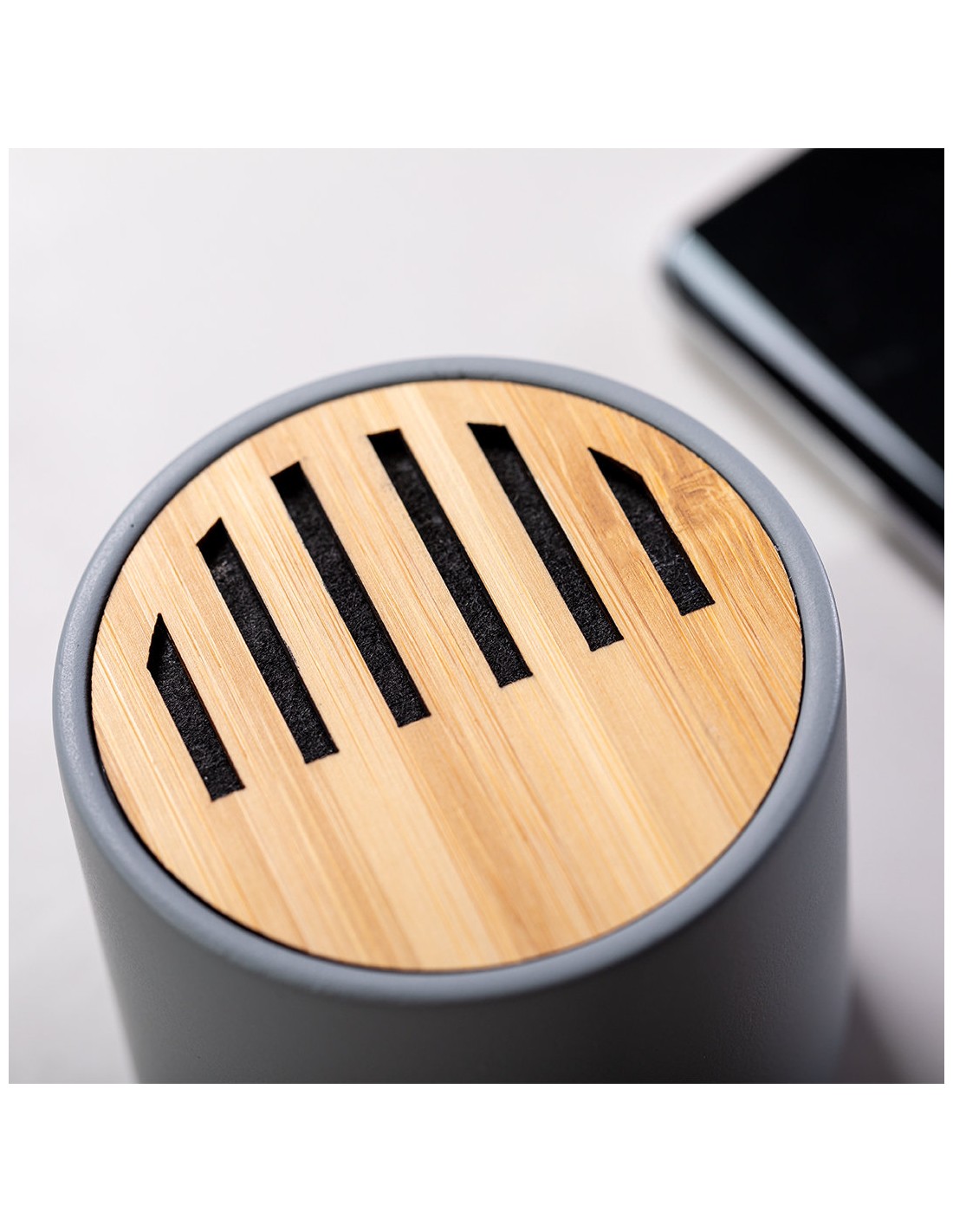 Altavoz Bluetooth en combinación de piezas de bambú de corte nature y cemento de piedra caliza, un conglomerante formado por la mezcla de materiales naturales, principalmente piedra caliza molida y agua, obteniendo un material de gran consistencia y durabilidad. De tamaño compacto, con conexión Bluetooth 5.0 y 3W de potencia. Compatible con iOS y Android, incluye cable de carga micro USB y viene presentado en atractiva caja de diseño. Disponible manual de instrucciones español e inglés.