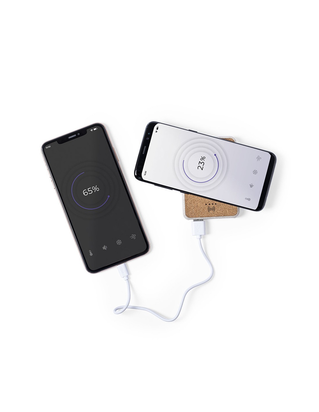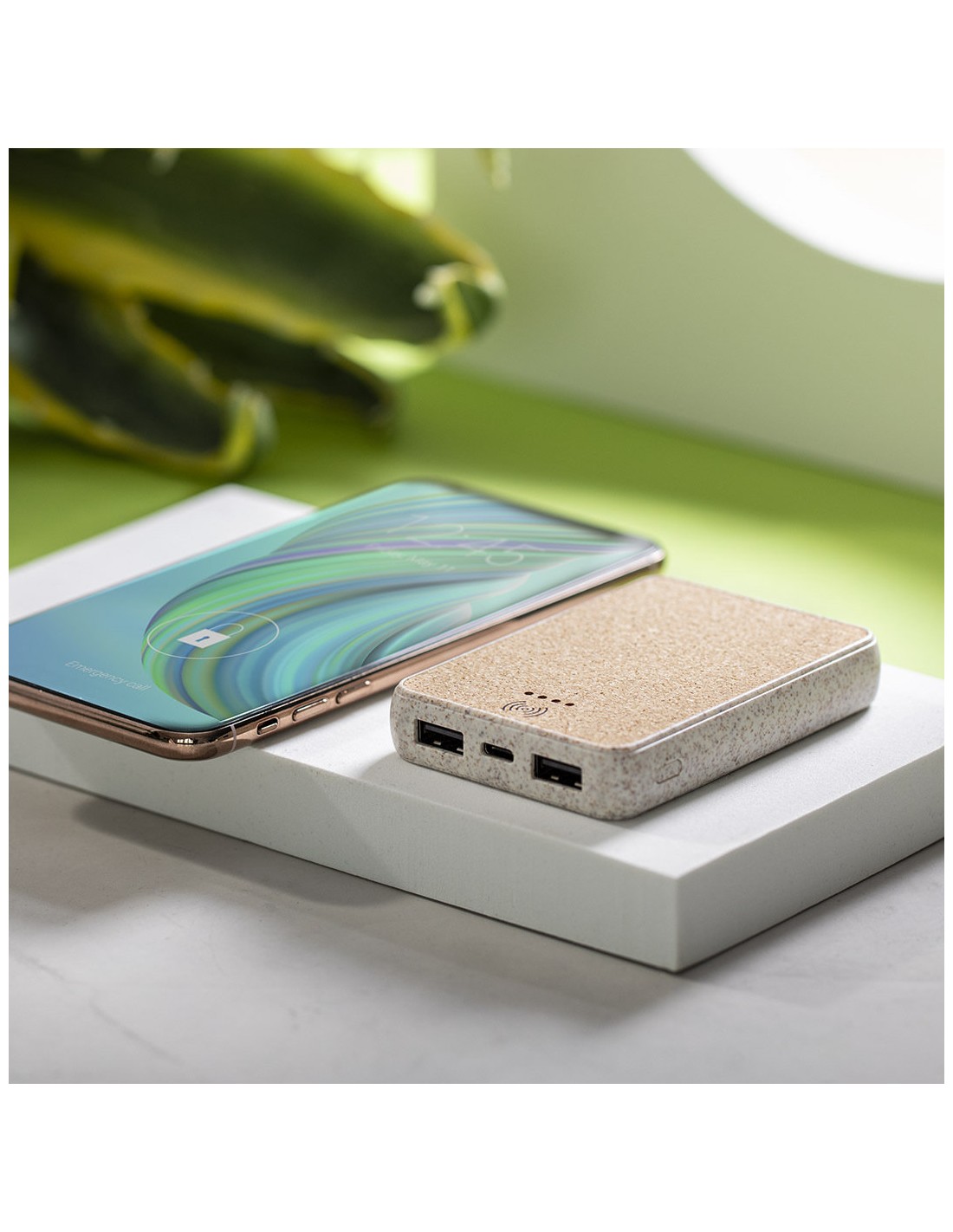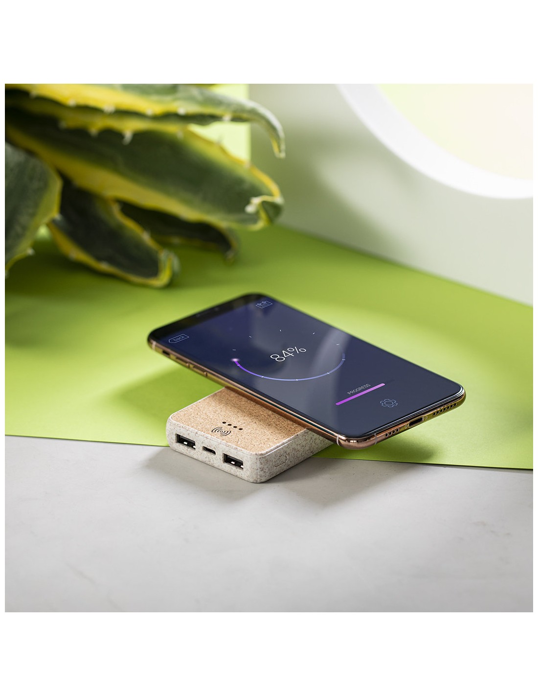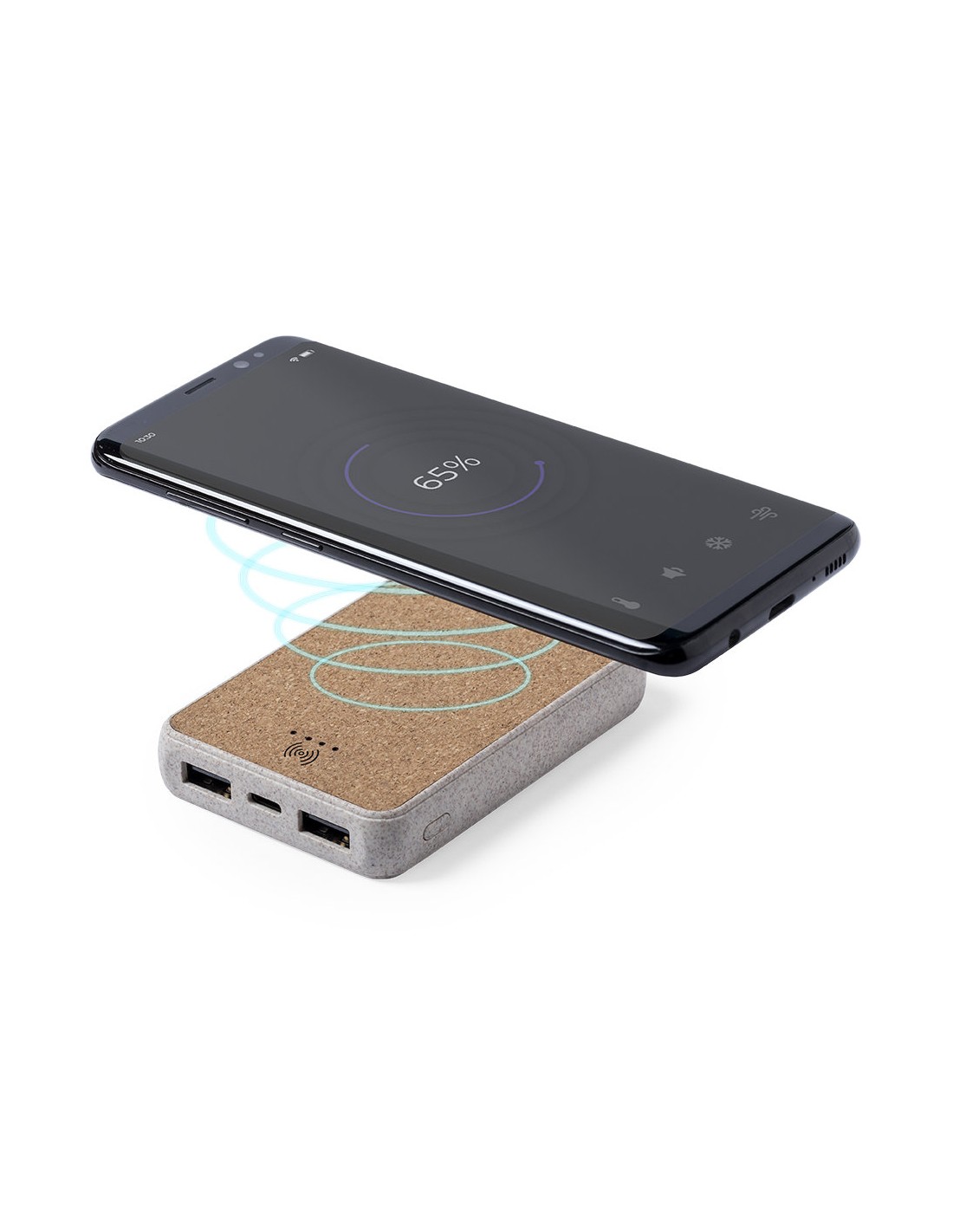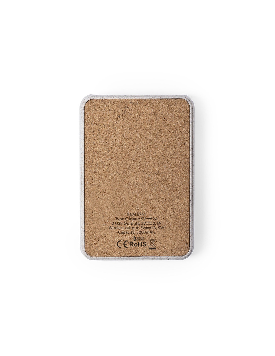 Batería auxiliar externa de línea nature con cargador inalámbrico 5W integrado. Carcasa en combinación de materiales corcho natural y caña de trigo. 5.000 mAh de capacidad e indicador de estado de carga. Doble salida USB y entrada Tipo C. Con amplia superficie de marcaje y presentado en atractiva caja de diseño eco. Las capacidades mostradas en todas nuestras baterías auxiliares externas son reales, incorporando todas ellas baterías de grado A y no recicladas, con una vida útil de al menos 500 ciclos de carga y según normativa CE. Además, están fabricadas conforme a los estándares RoHS y en cumplimiento con los siguientes requisitos de seguridad: Sistema de protección contra sobrecarga del power bank. Sistema de protección contra descarga completa que proporciona una mayor durabilidad del power bank. Sistema de bloqueo para evitar cortocircuitos. Sistema de transferencia de carga constante, acorde con la capacidad del dispositivo de destino.