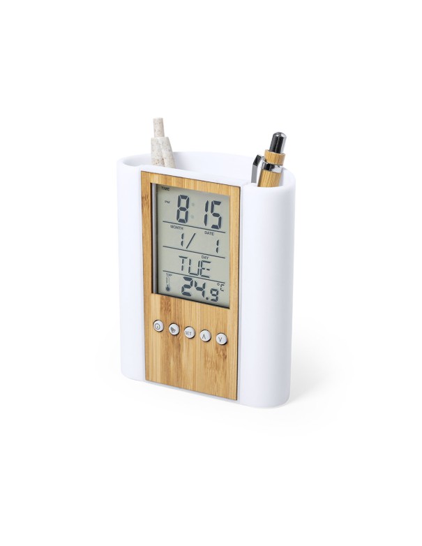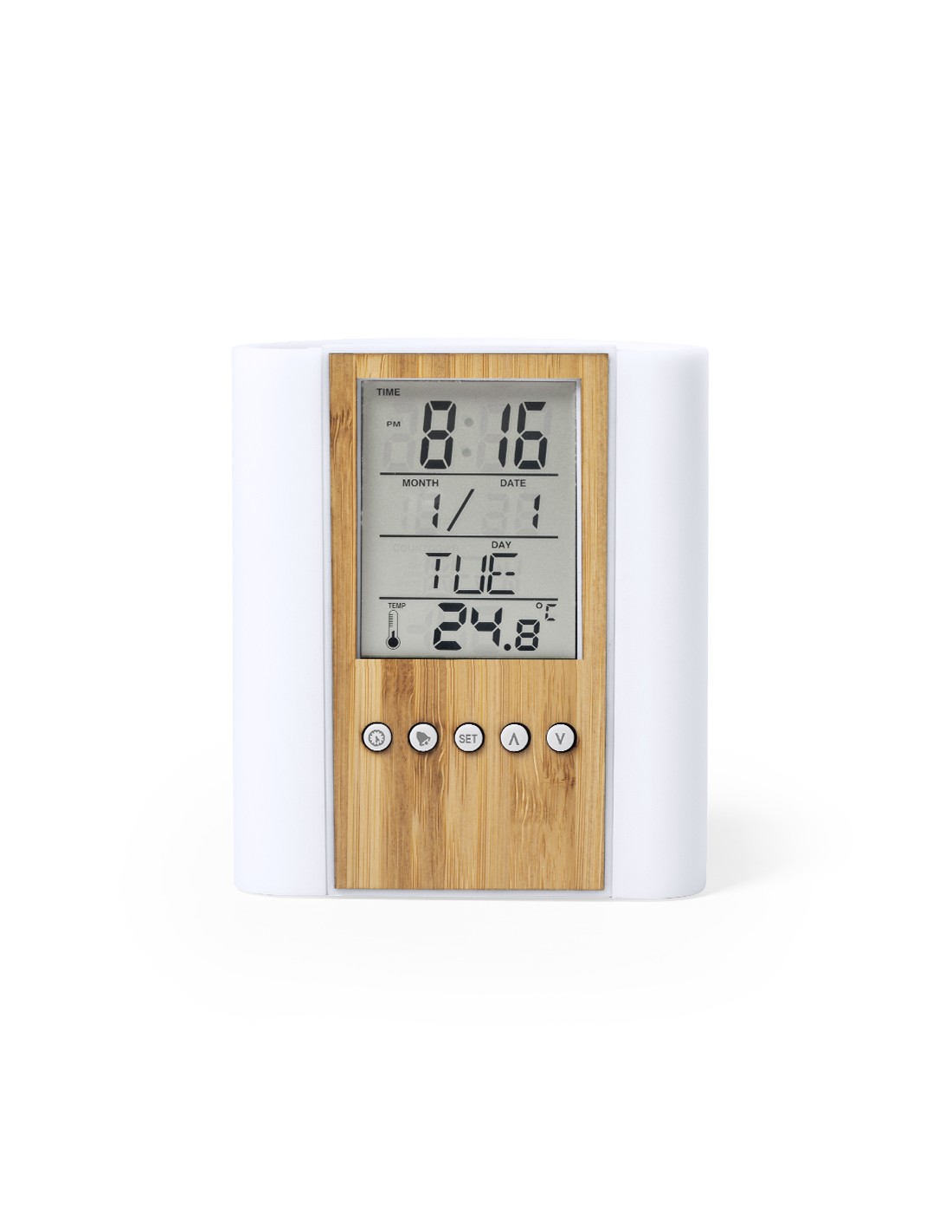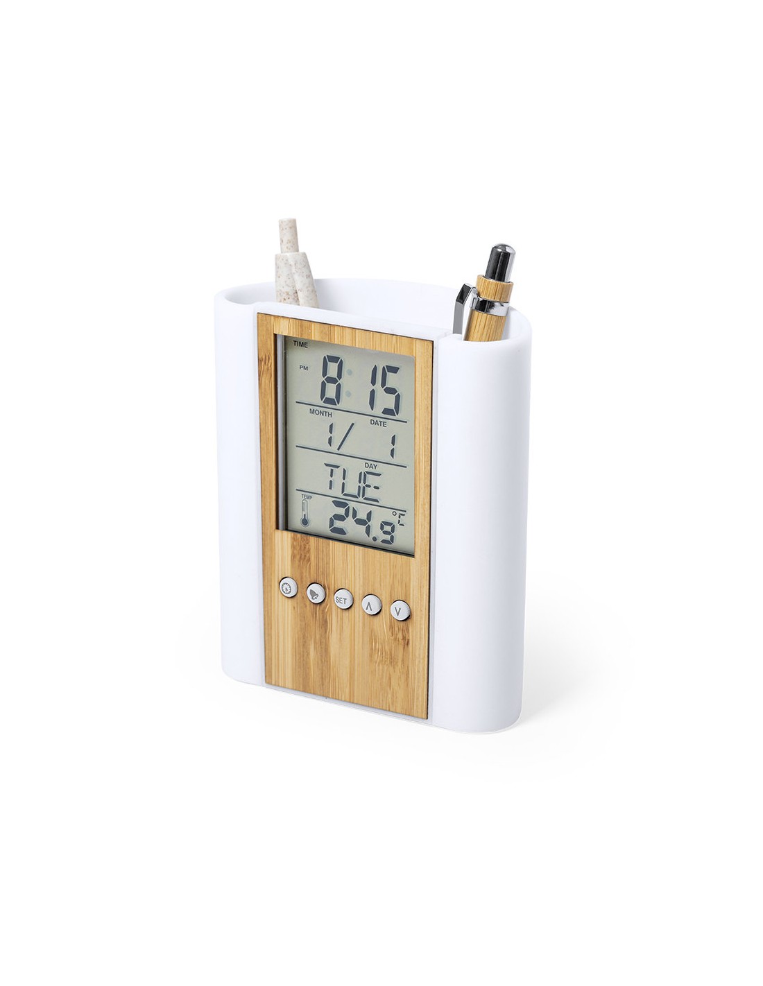Lapicero de línea nature con reloj multifunción integrado. Fabricado en combinación de materiales bambú y ABS. Funciones termómetro, calendario y alarma temporizador y recordatorio de cumpleaños. Alimentación a pilas (de botón incluidas) y presentado en atractiva caja de diseño eco. Disponible manual de instrucciones en español e inglés.