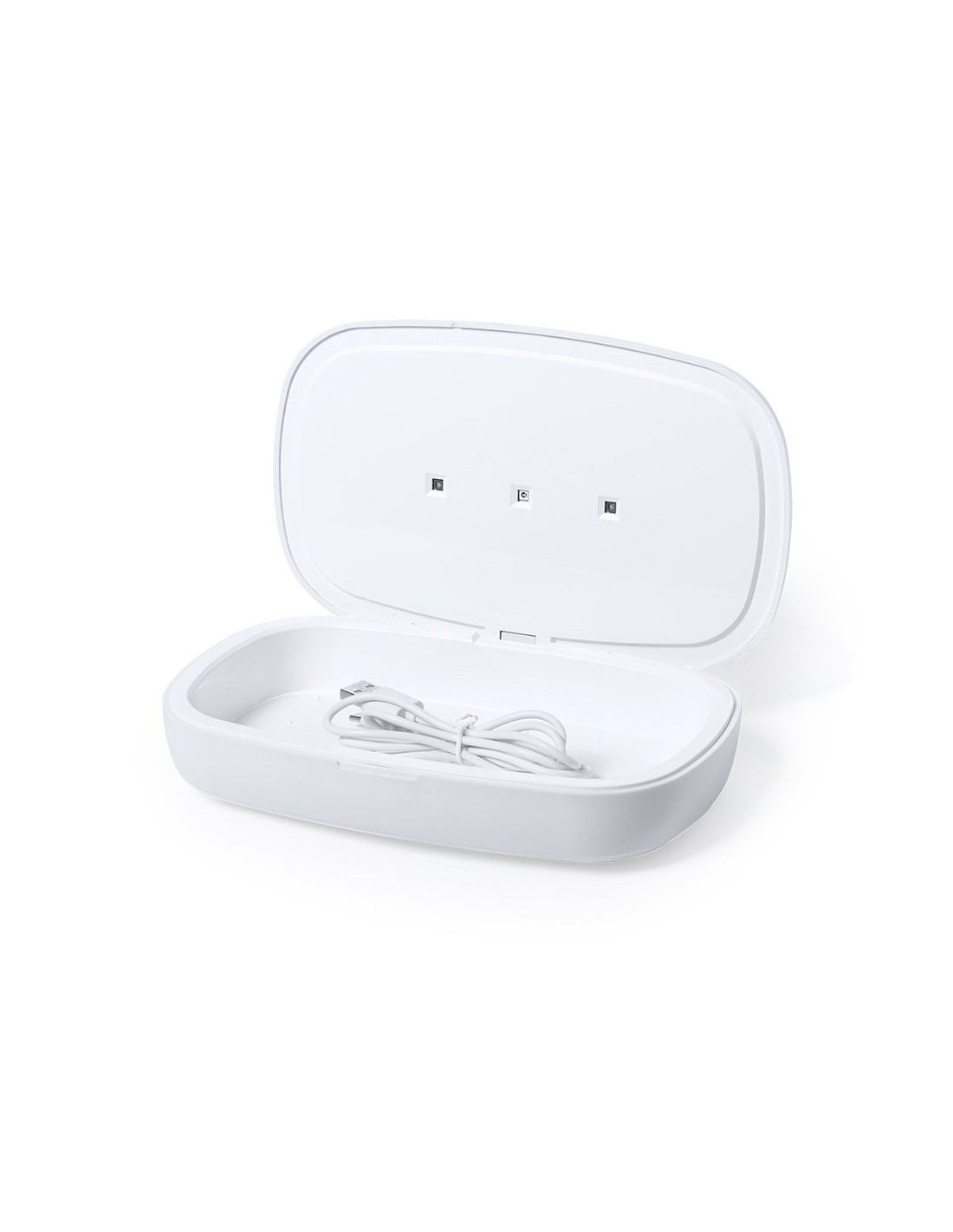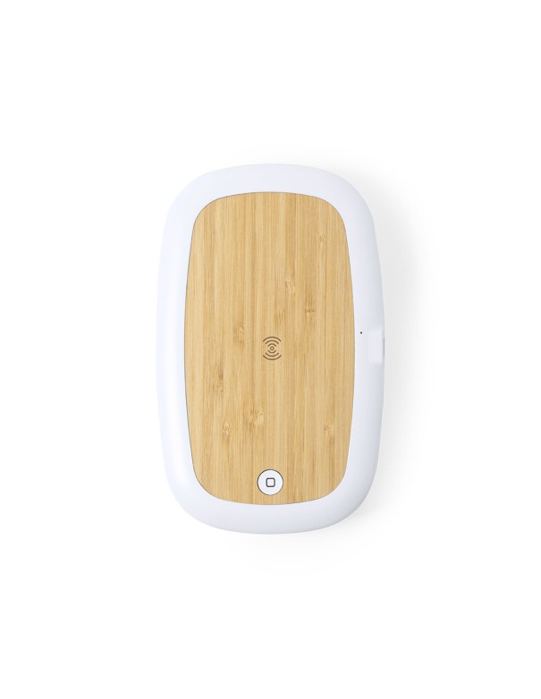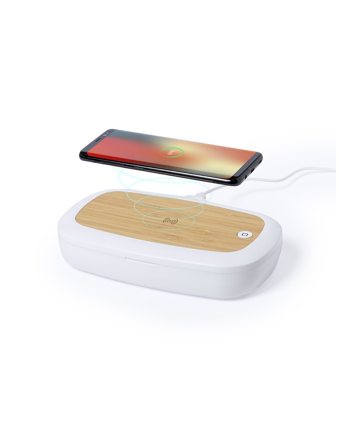 Caja esterilizadora de línea nature, con base de carga en bambú. Luz ultravioleta tipo C, con cargador inalámbrico 5W para smartphone integrado en tapa. Especialmente diseñada para la eliminación de microorganismos y bacterias en objetos de uso cotidiano como el smartphone, llaves, gafas, mascarilla, auriculares, smartwatch... Fabricada en resistente material ABS de acabado mate y presentada en atractiva caja individual de diseño. Fácil de usar, basta con introducir el objeto dentro de la caja. Potencia de bombilla 1W longitud de onda de 270-280 nm, con alimentación mediante cable USB Tipo C de 1m de largo con color a juego. Tiempo de esterilización de 5 y 10 minutos con función auto-apagado. Disponible manual de usuario en español e inglés. Disponible certificación CE, RoHS y de efectividad germicida.