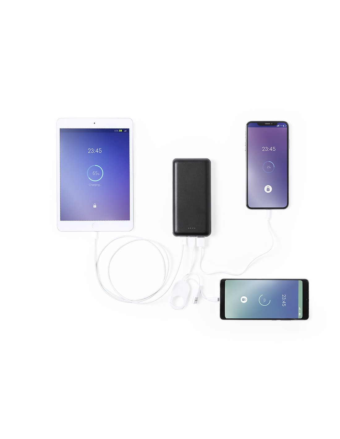 Batería auxiliar externa de gran capacidad de carga -20.000 mAh-. Conexión Tipo-C de entrada/salida de corriente y salida USB doble. Con capacidad de carga simultánea de hasta 3 dispositivos. Ledes indicadores de estado de carga, diseño curvado y amplia superficie de marcaje. Presentada en atractiva caja de diseño. Las capacidades mostradas en todas nuestras baterías auxiliares externas son reales, incorporando todas ellas baterías de grado A y no recicladas, con una vida útil de al menos 500 ciclos de carga y según normativa CE. Además, están fabricadas conforme a los estándares RoHS y en cumplimiento con los siguientes requisitos de seguridad: Sistema de protección contra sobrecarga del power bank. Sistema de protección contra descarga completa que proporciona una mayor durabilidad del power bank. Sistema de bloqueo para evitar cortocircuitos. Sistema de transferencia de carga constante, acorde con la capacidad del dispositivo de destino.