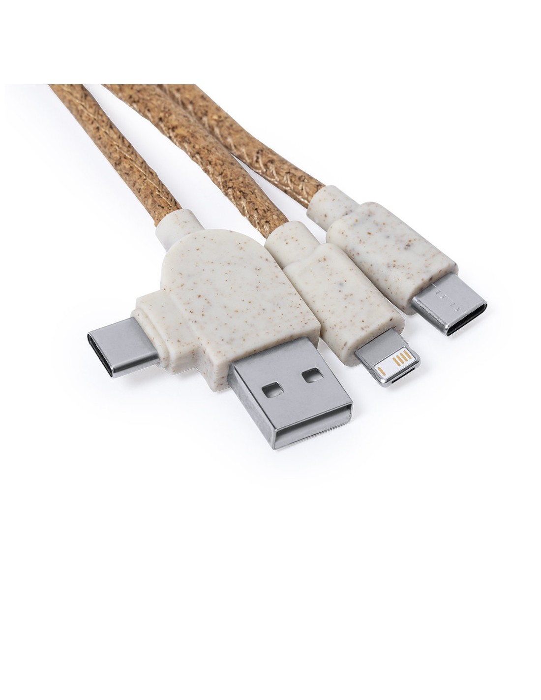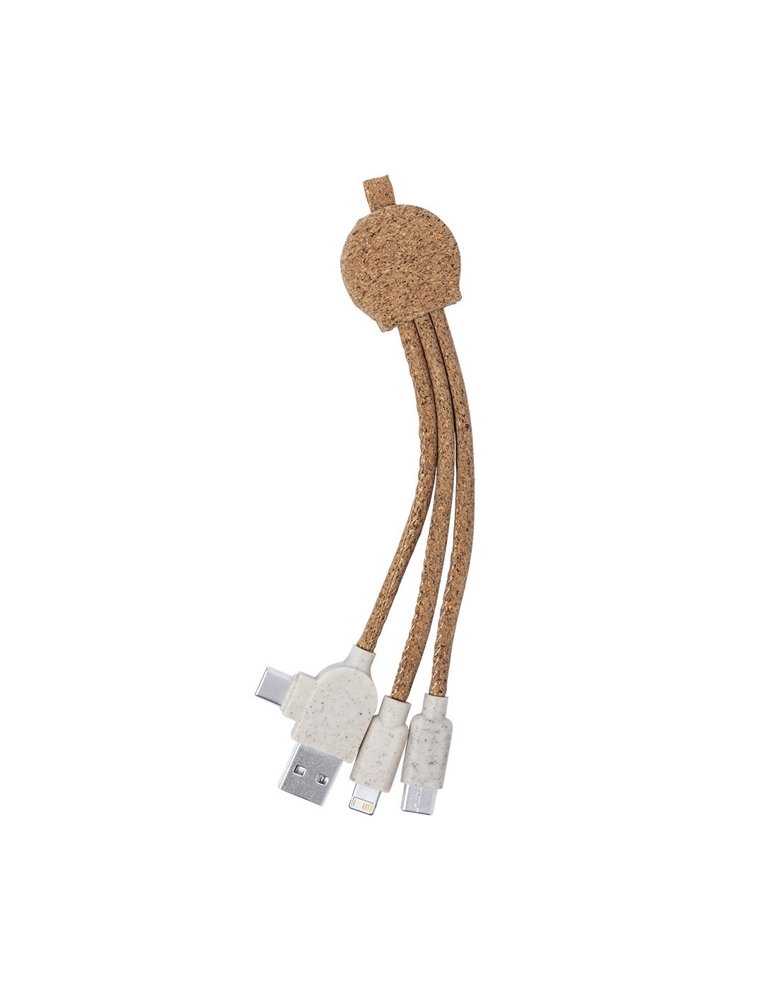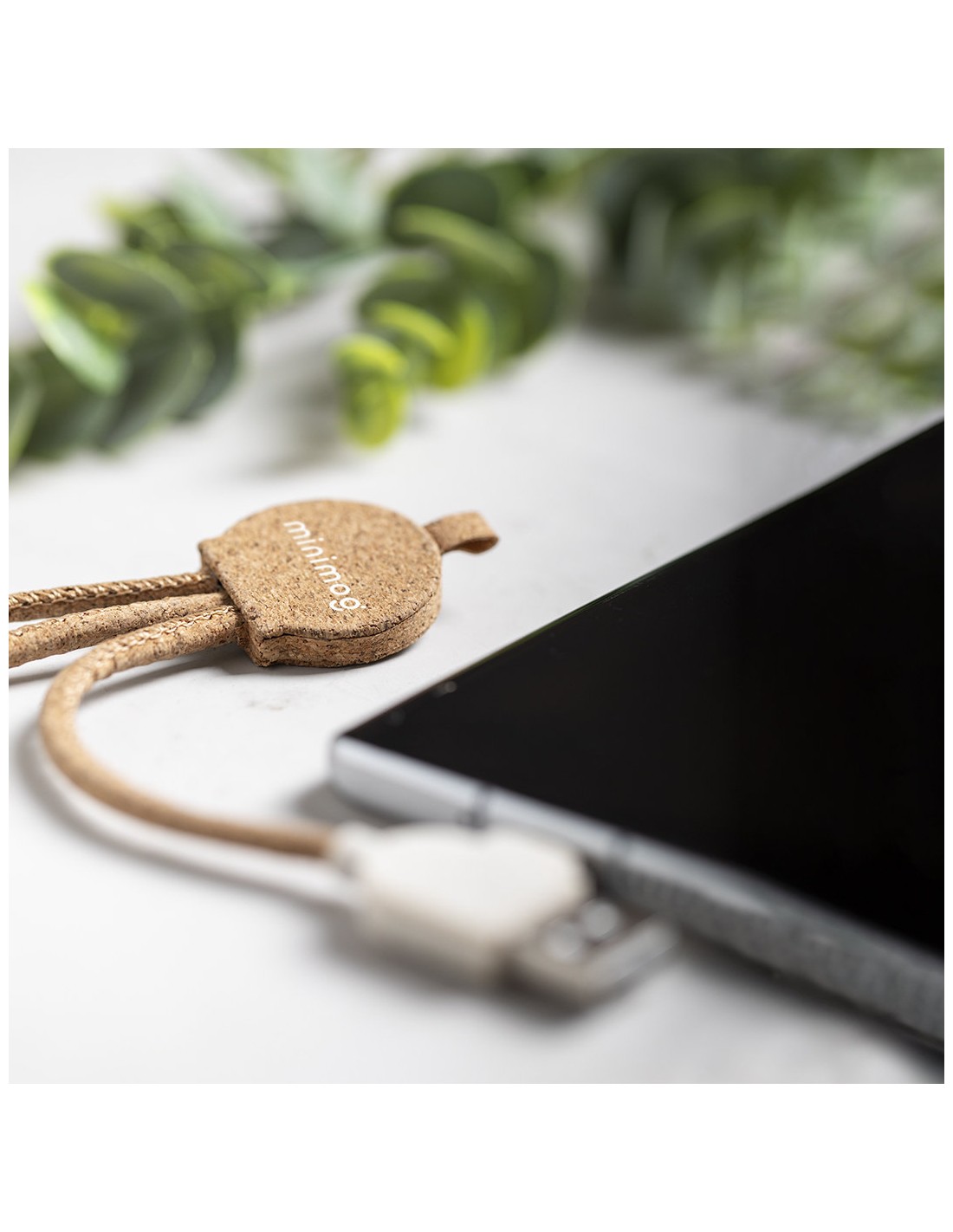 Cable cargador USB de línea nature, fabricado en corcho natural y con accesorios en caña de trigo, para así fomentar la utilización de materias primas naturales y reducir las emisiones contaminantes. Con conexiones USB, tipo C (entrada y salida) y dual micro USB-Lightning. Con accesorio para colgar y zona lisa para marcaje. Presentado en bolsa individual autocierre de diseño eco.