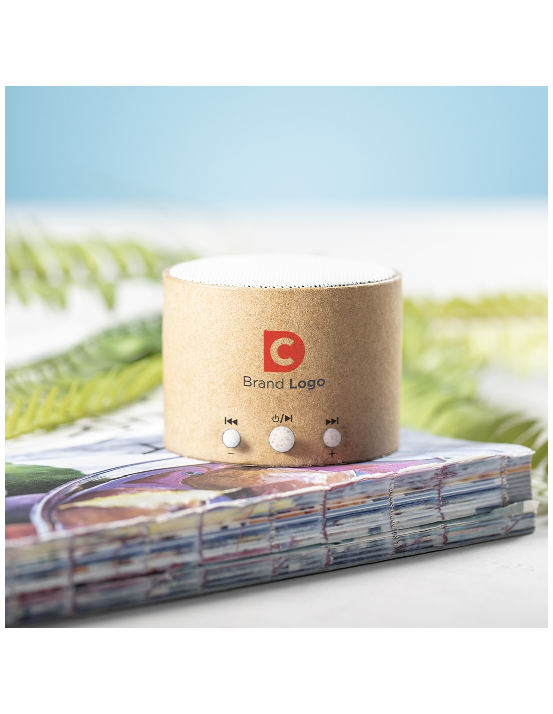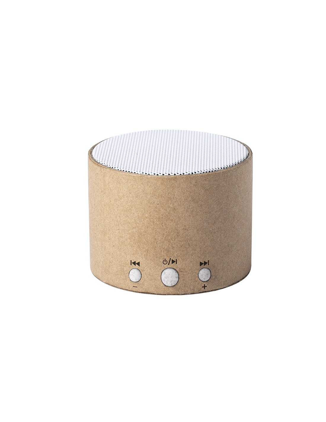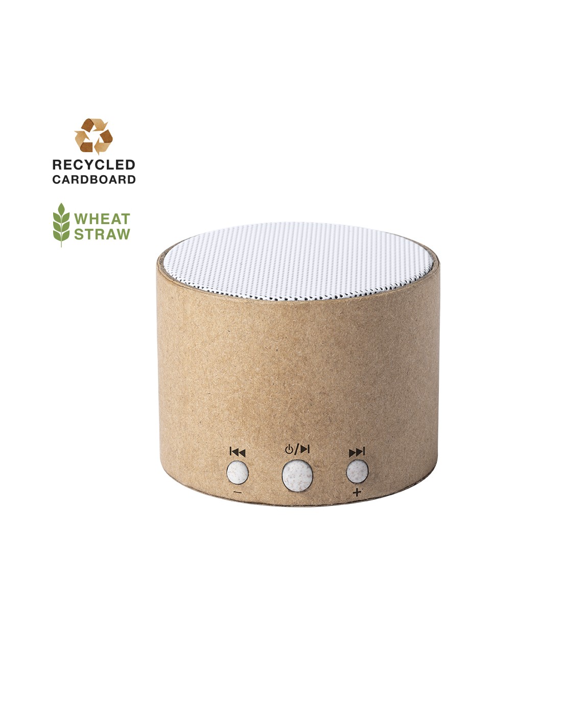 Compacto altavoz de línea nature y conexión Bluetooth 5.0. Frabricado en cartón reciclado, contribuyendo a la conservación de los bosques y reduciendo considerablemente la huella de carbono, con botones de control en caña de trigo. Ofrece 3W de potencia, compatible con iOS y Android. Incluye cable de carga micro USB. Presentado en atractiva caja de diseño eco, con manual de instrucciones en español e inglés.