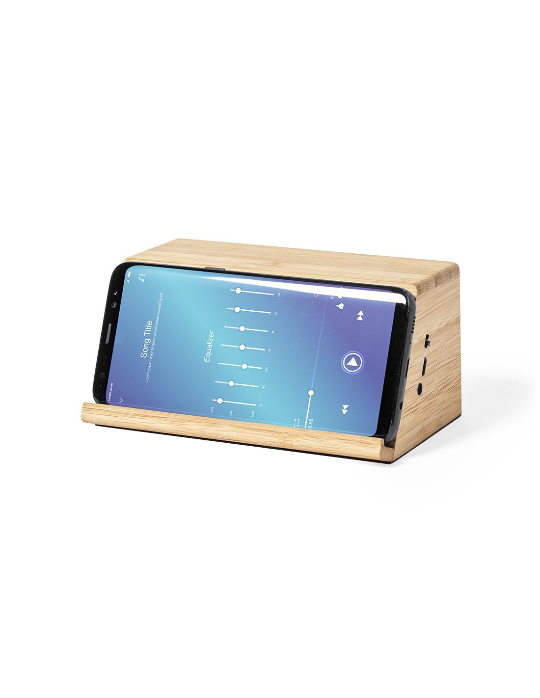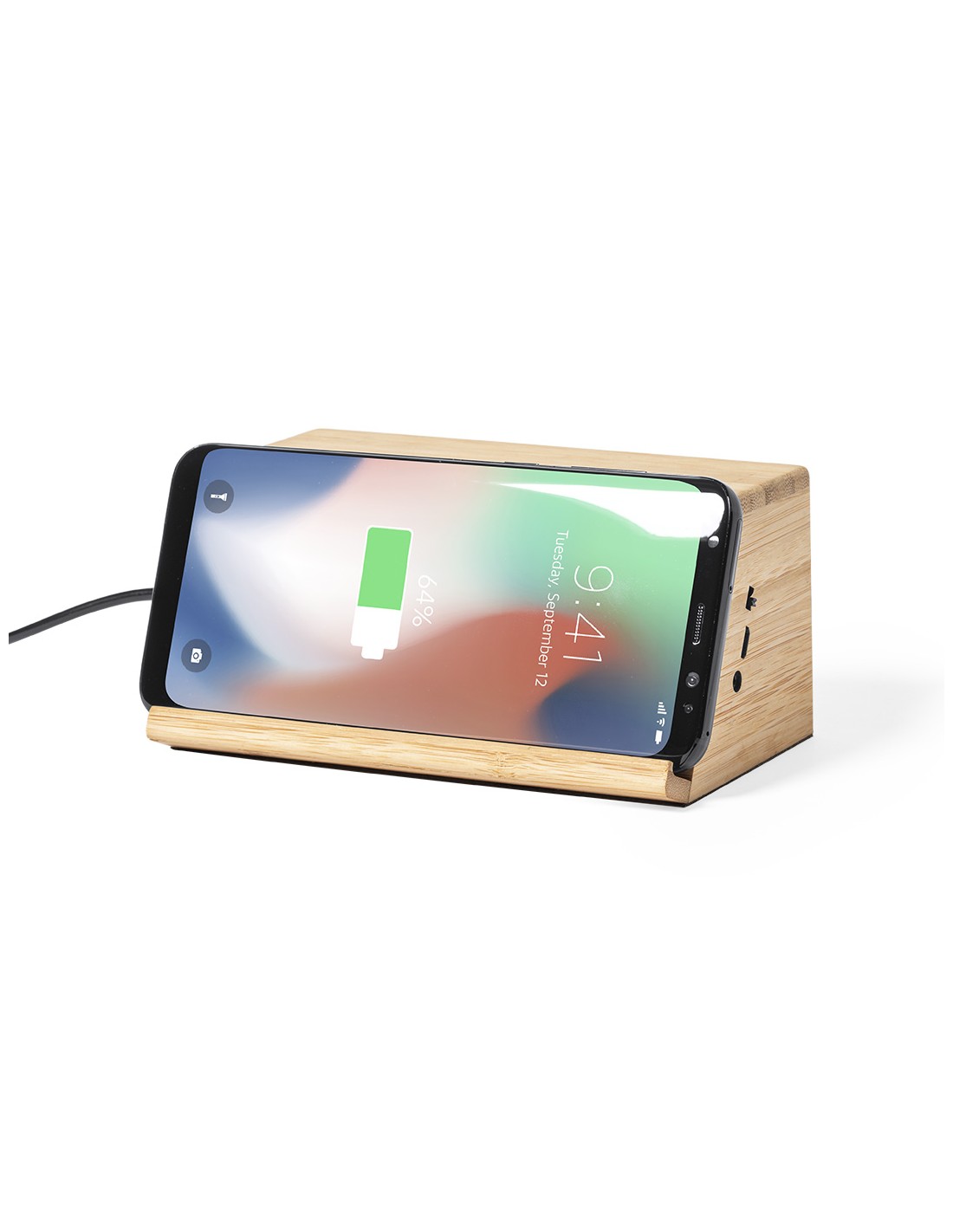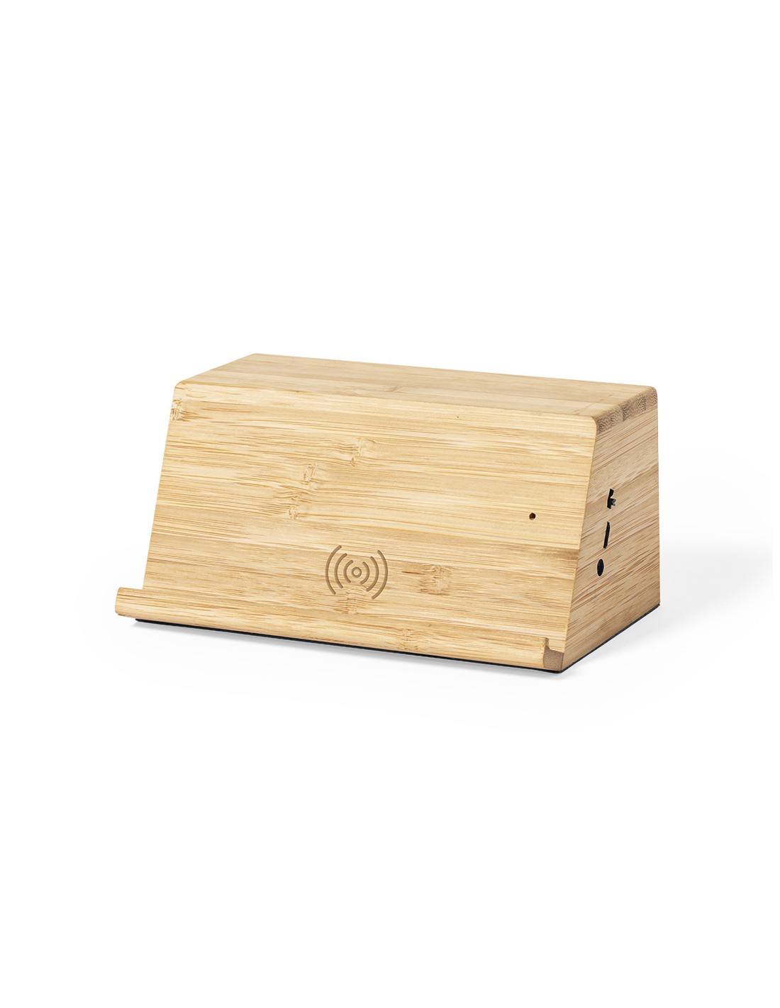 Altavoz cargador inalámbrico de inducción, de línea nature y carga 10W. Con soporte para smartphone integrado y 2 altavoces de 3W cada uno. Fabricado en bambú procedente de cortes naturales, con base antideslizante. Compatible con dispositivos equipados con tecnología de carga inalámbrica y recargable mediante cable USB -incluido-. Amplia superficie de marcaje y presentado en atractiva caja de diseño eco.